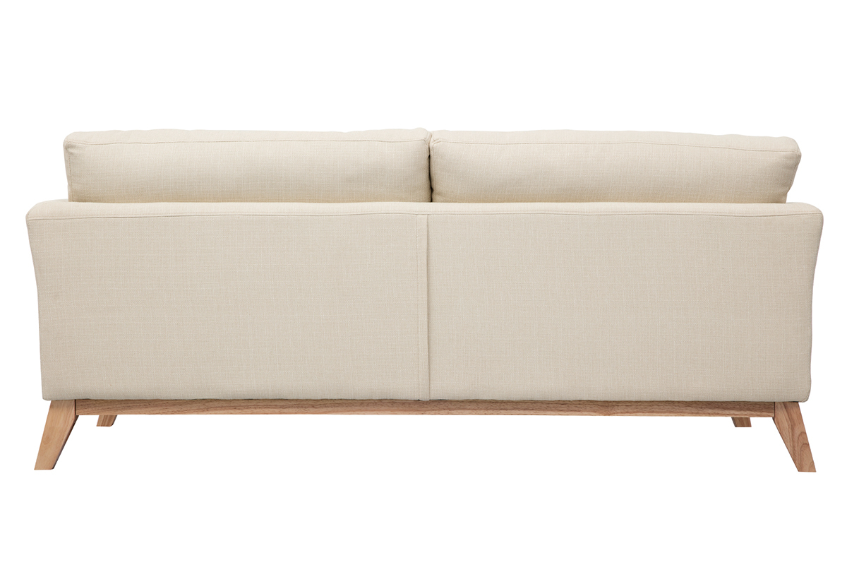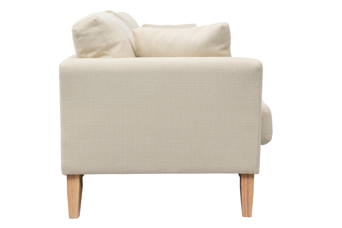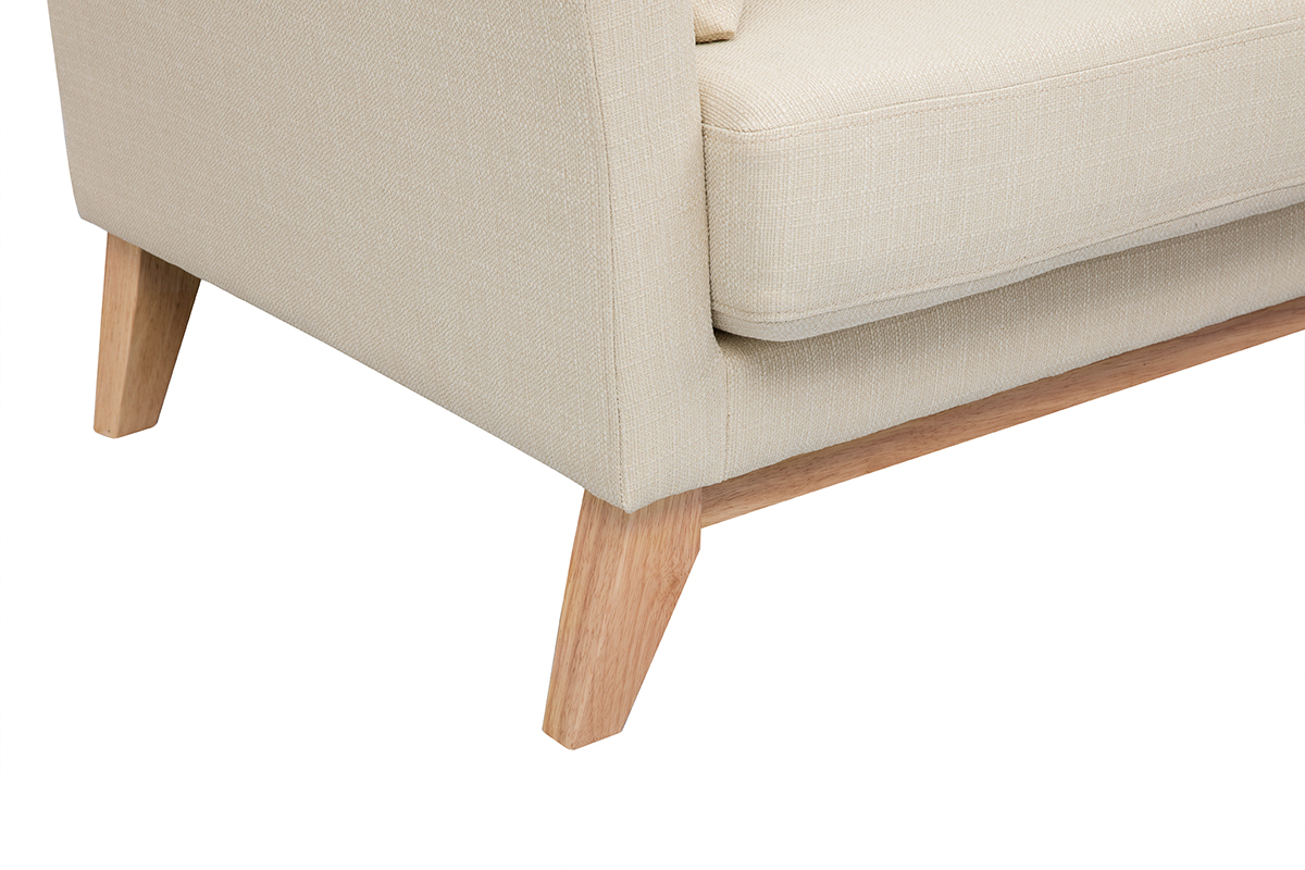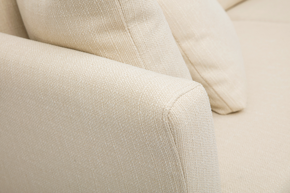 Formant un duo sans fausse note, le revêtement en tissu (100% polyester) et le piètement en hévéa massif, subliment avec simplicité les lignes de cet élégant canapé beige.