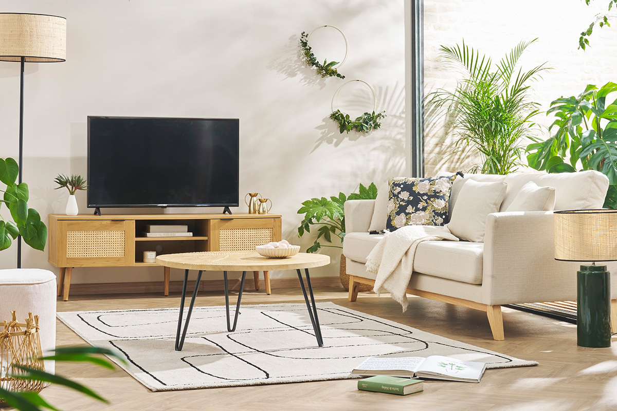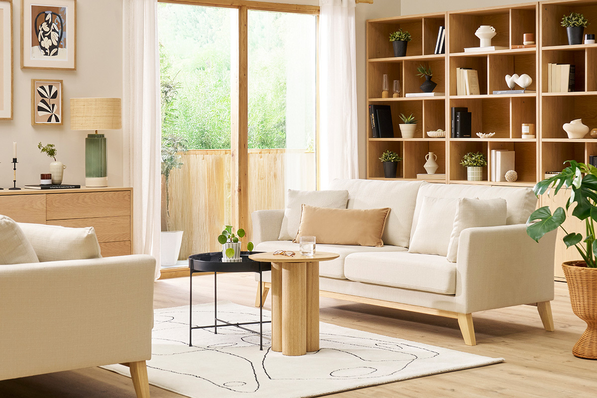 Formez un tandem de charme en associant le canapé scandinave beige OSLO à une table basse en bois clair.