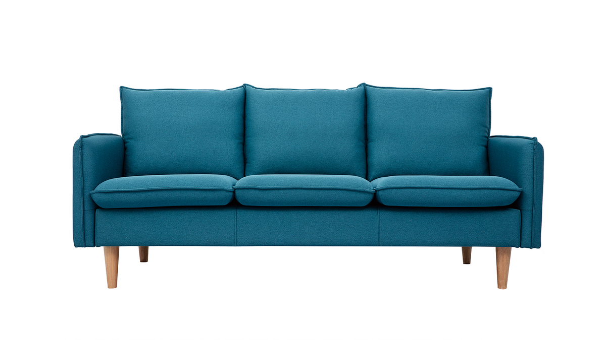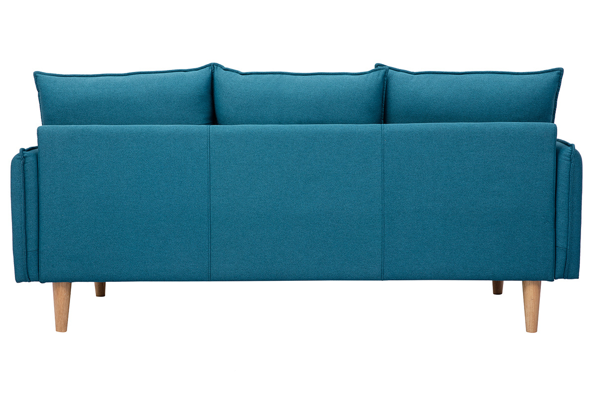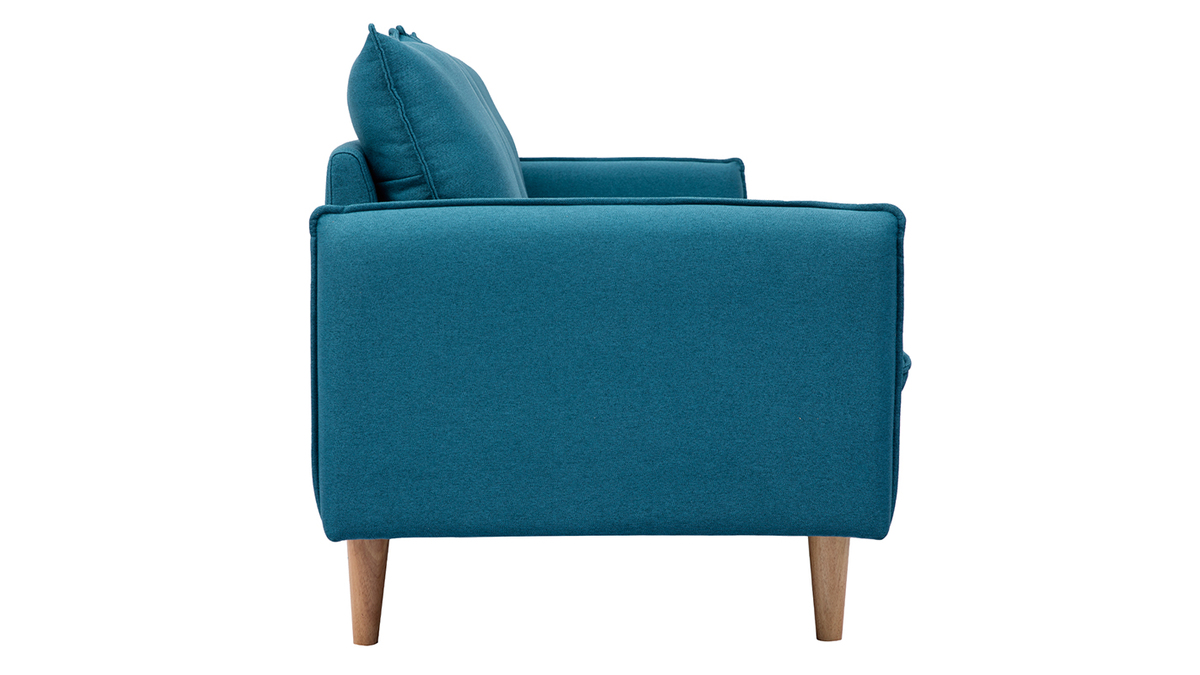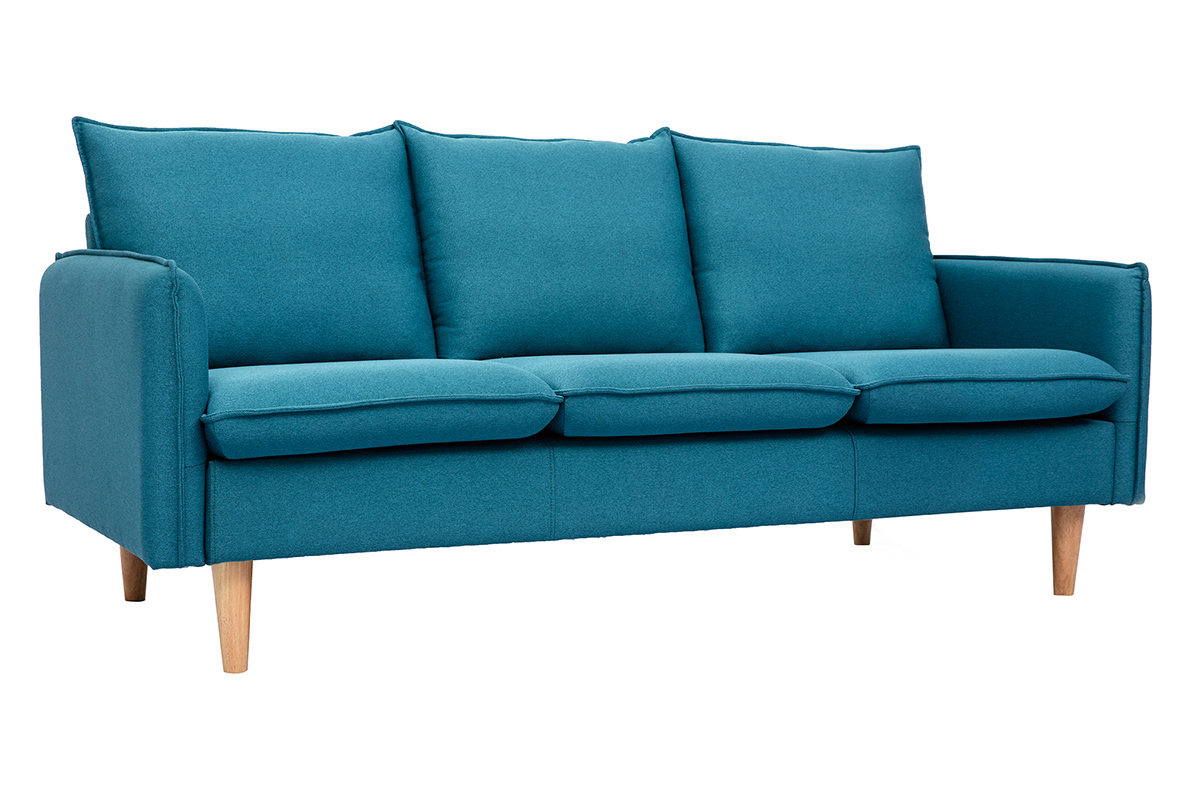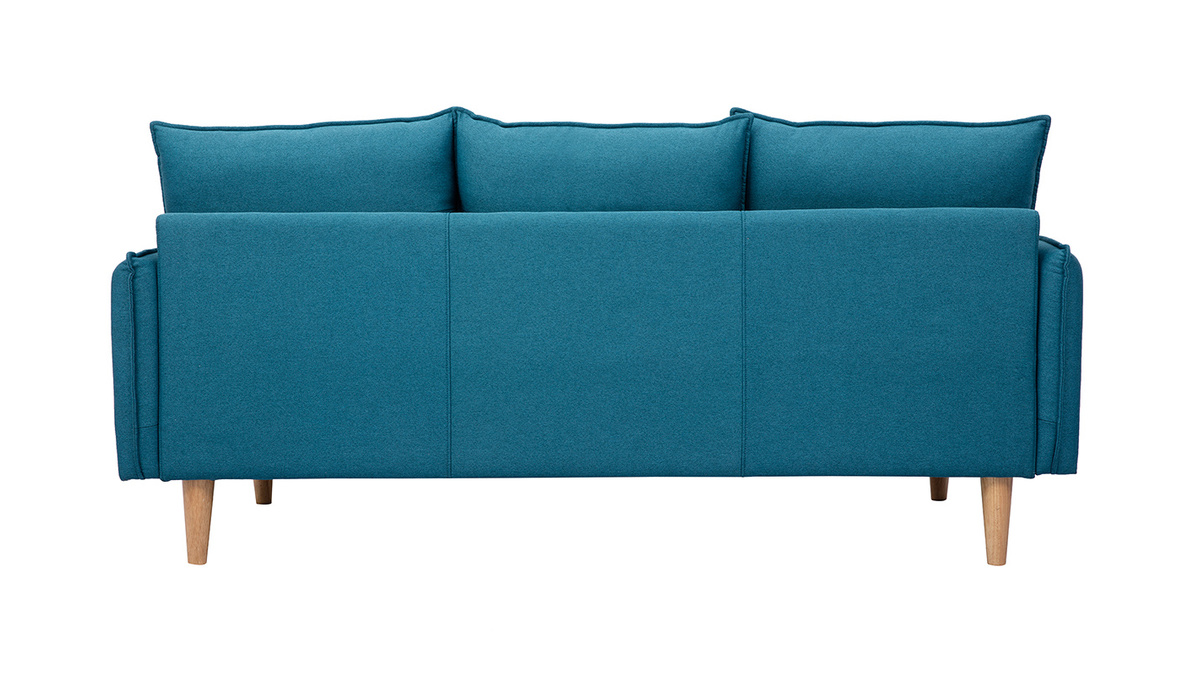 C'est sa forme pure et sa jolie découpe qui nous ont charmés. Ses trois coussins d'assise et de dossier dessinent une ligne moderne qui contraste avec ses influences scandinaves. Si les matériaux qui le composent évoquent le mobilier nordique, son design en fait un siège idéal pour un salon contemporain convivial et chaleureux. On aime particulièrement l'association d'un revêtement en polyester bleu canard, à l'élégance intemporelle, et d'un piètement en hévéa massif, une essence de bois claire et lumineuse. Ce canapé 3 places est un indémodable, facile à intégrer dans différents styles de salon.