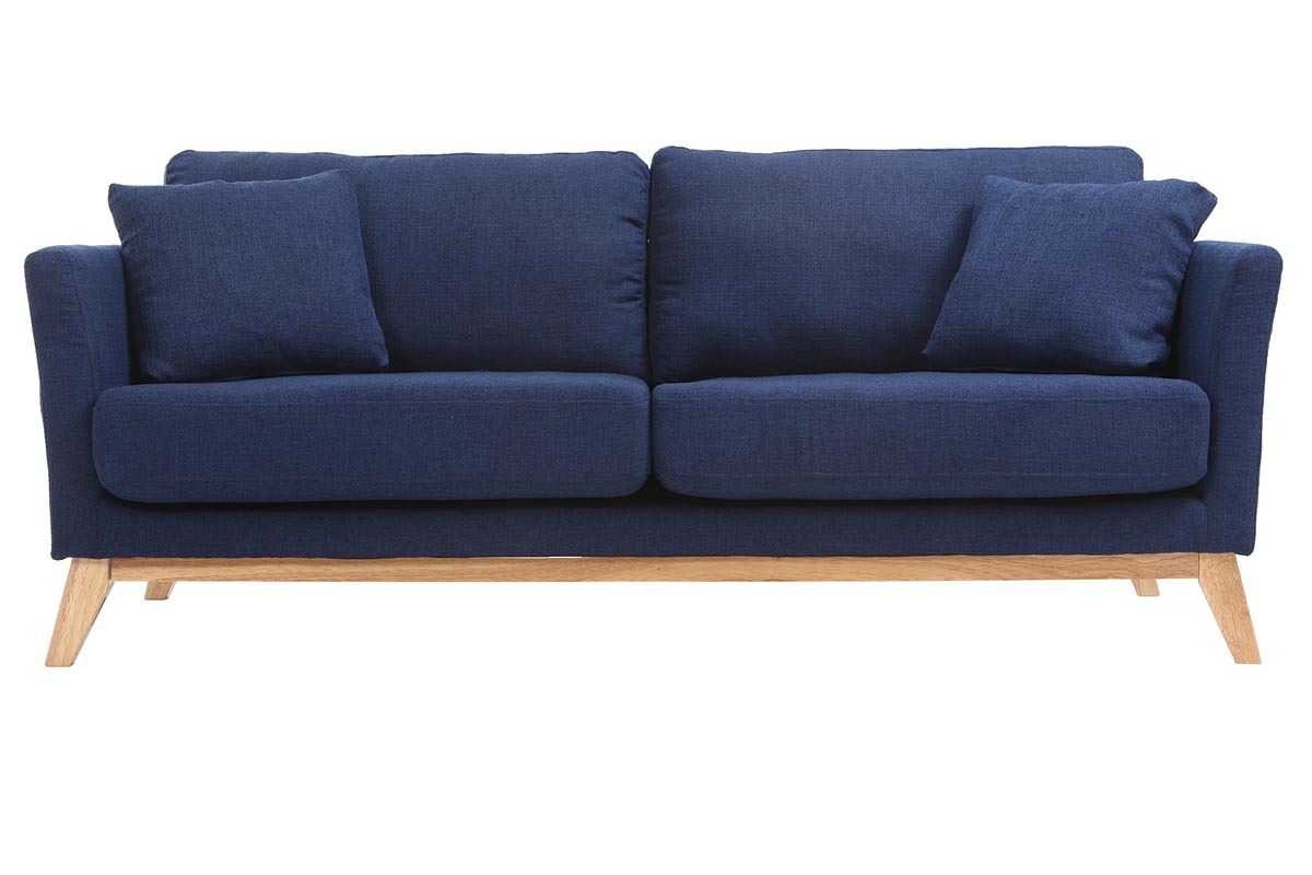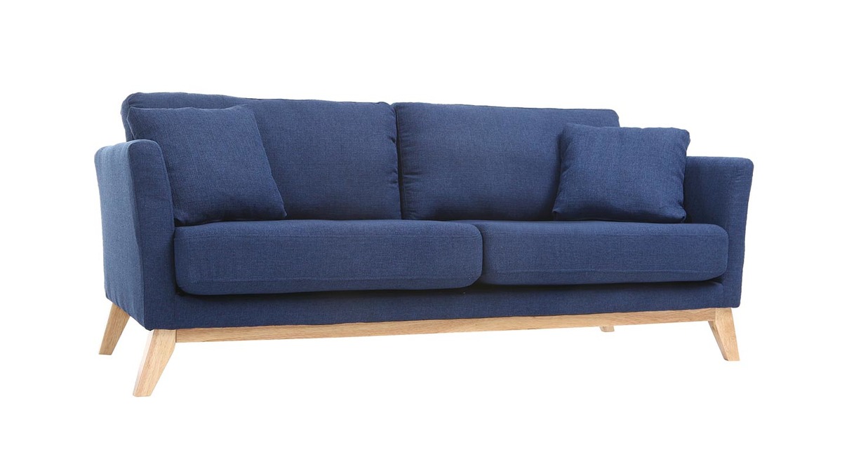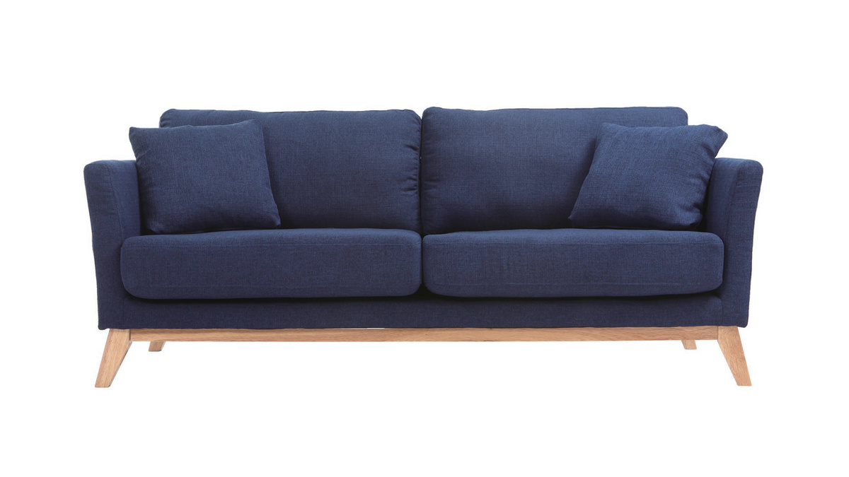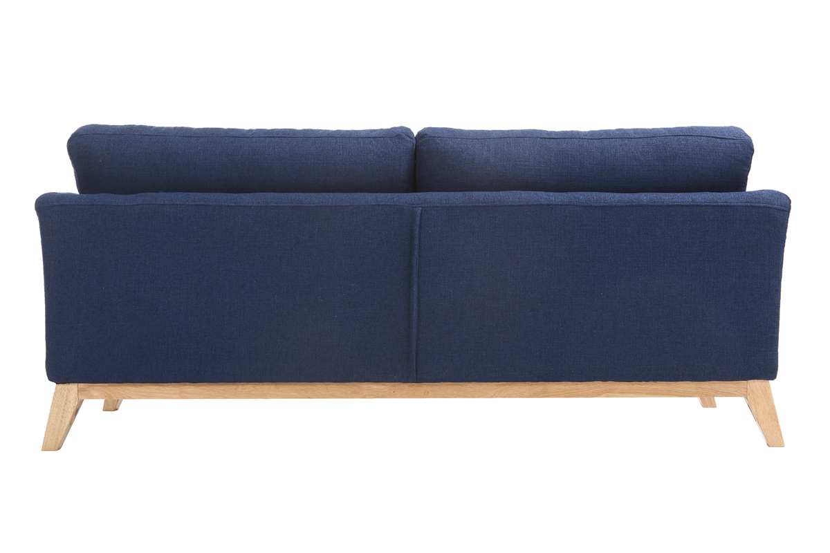 Canapé scandinave déhoussable 3 places en tissu bleu foncé et bois clair OSLO livré prêt à assembler. Montage simple, seuls les pieds sont à fixer.