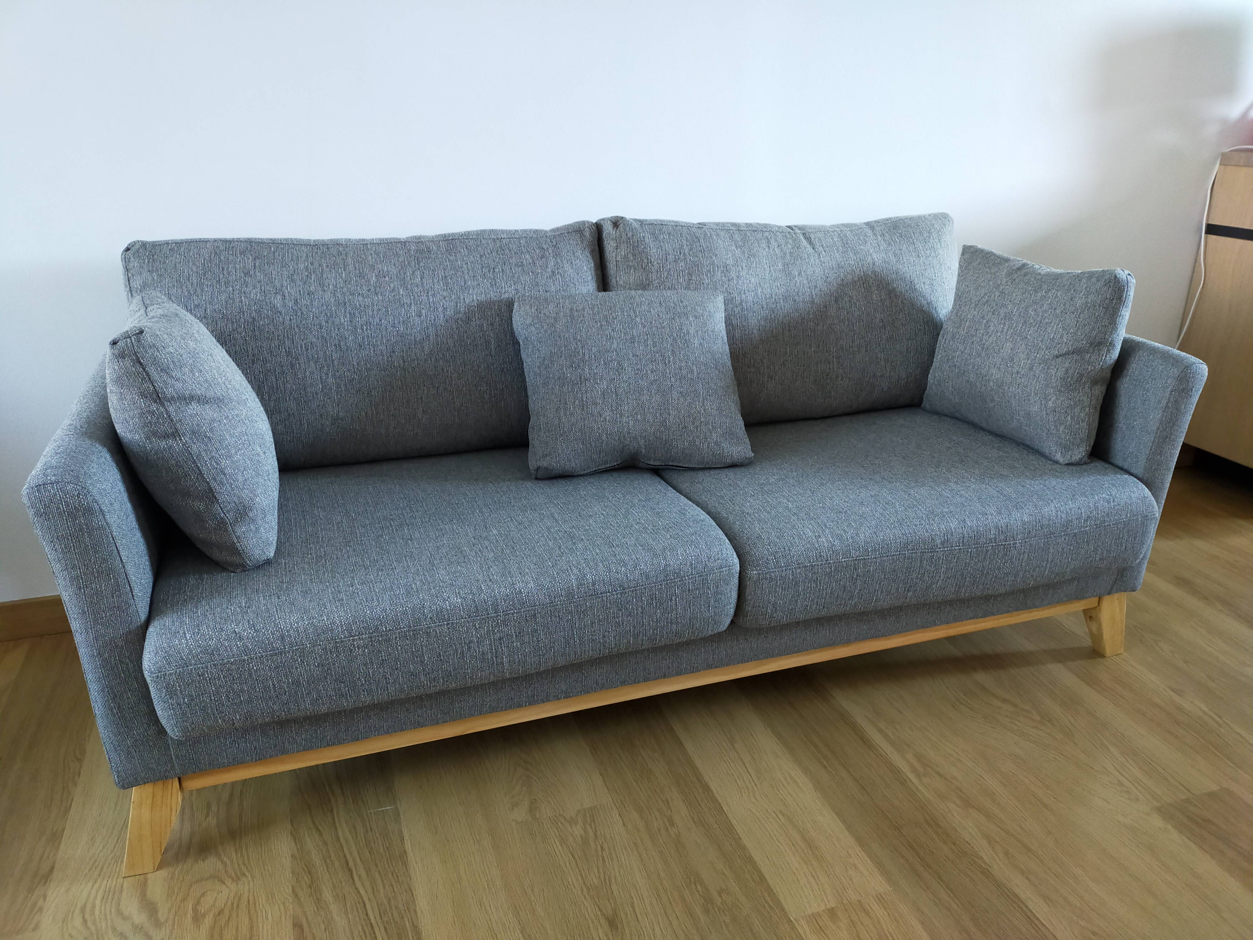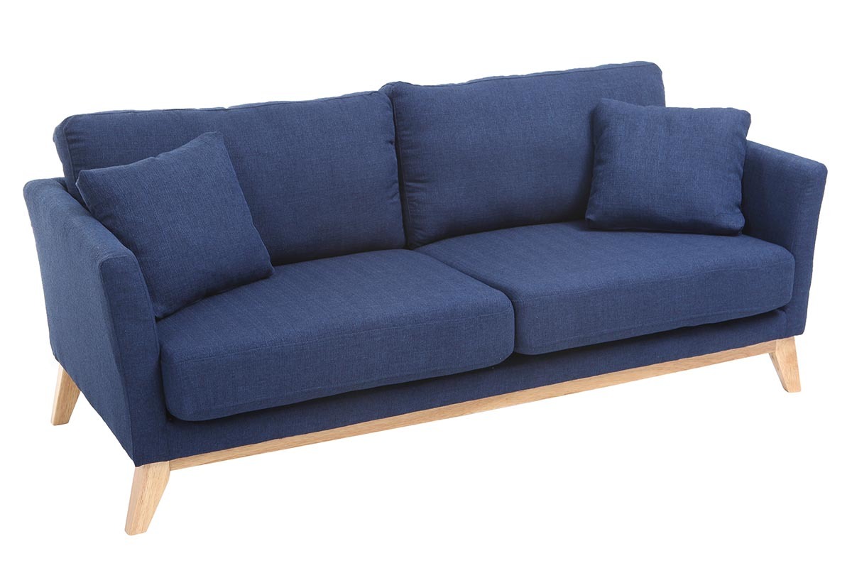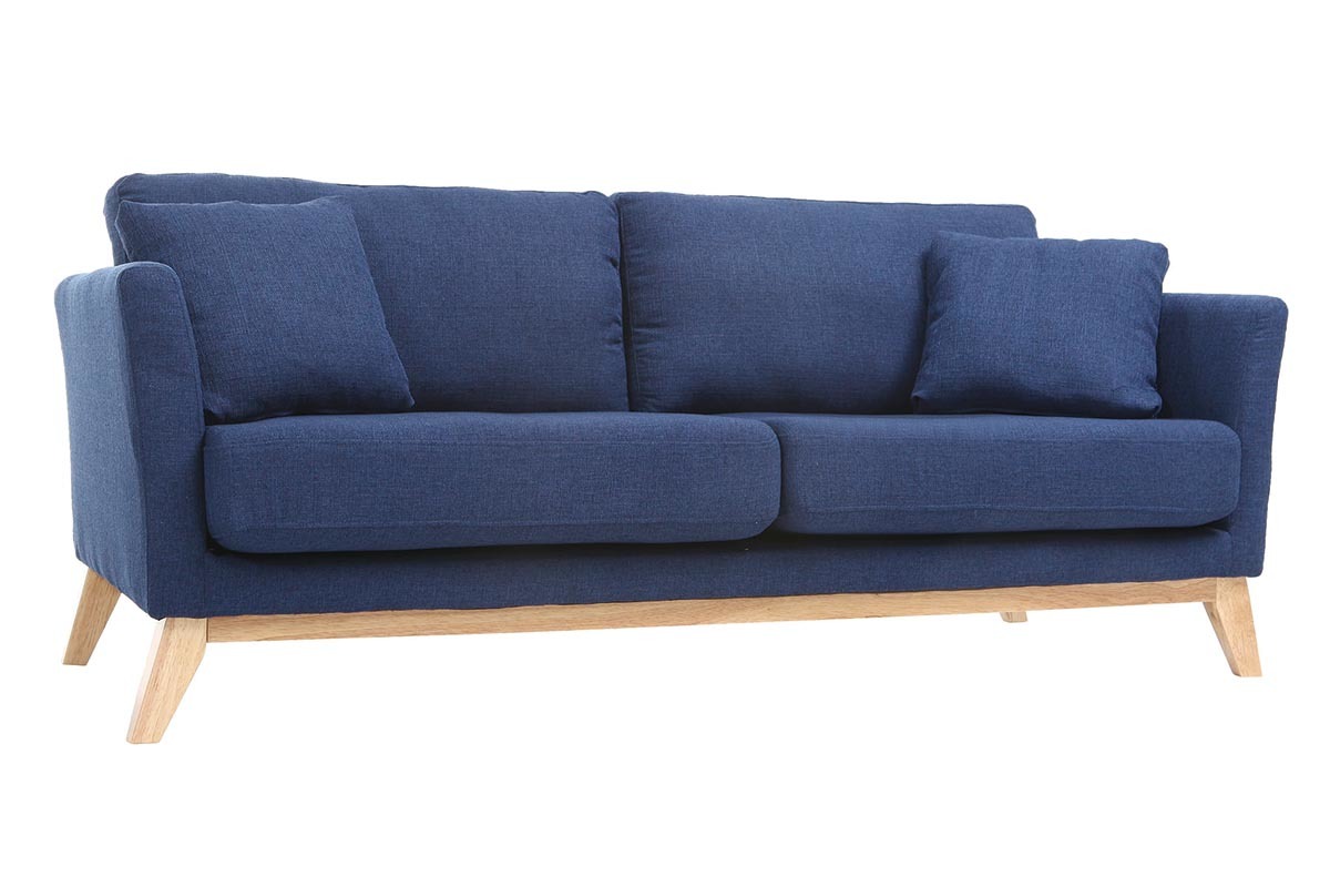 Canapé scandinave déhoussable 3 places en tissu bleu foncé et bois clair OSLO livré prêt à assembler. Montage simple, seuls les pieds sont à fixer.