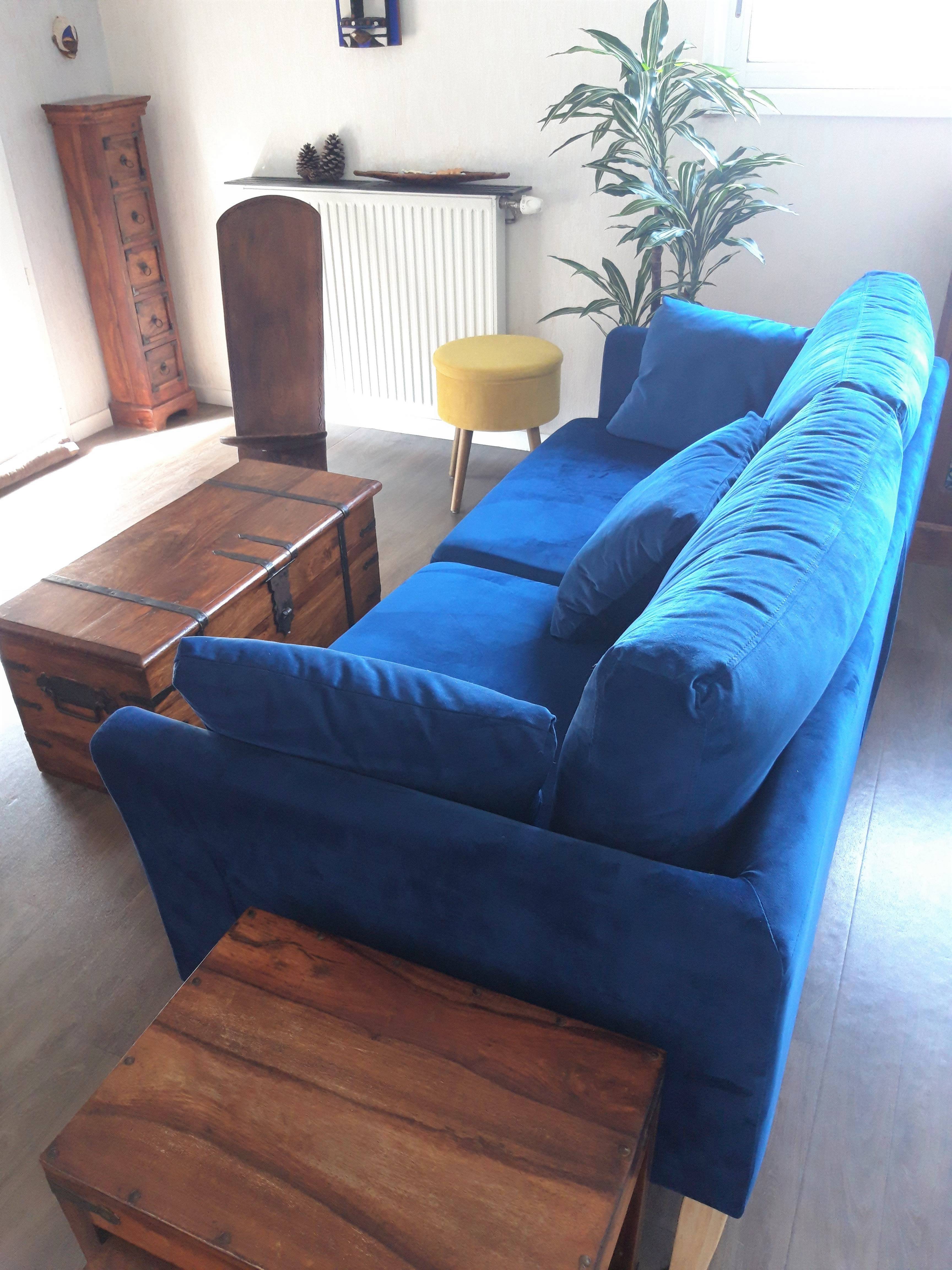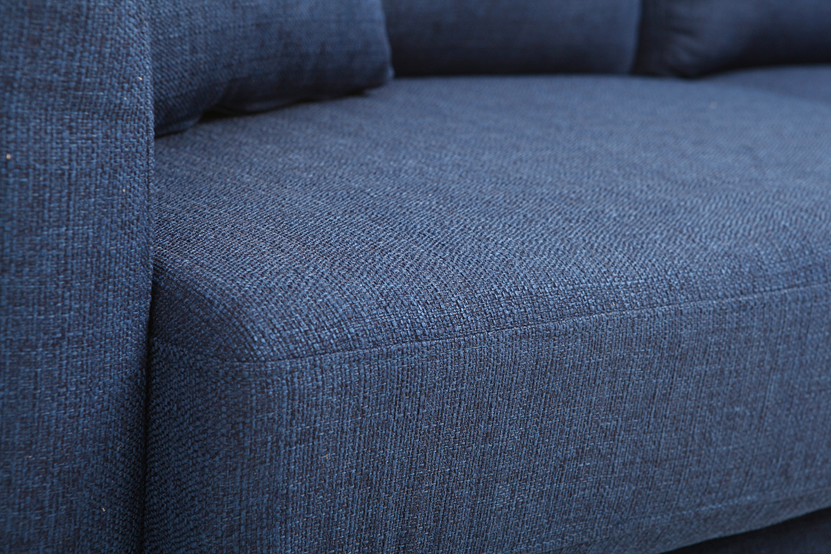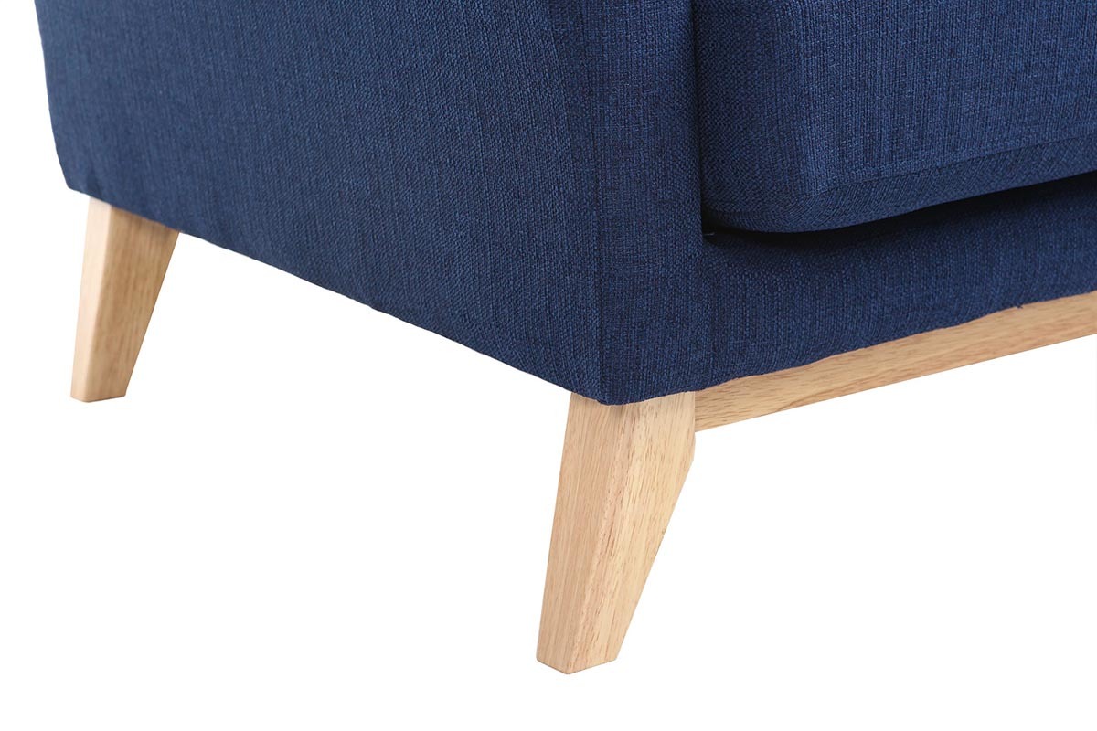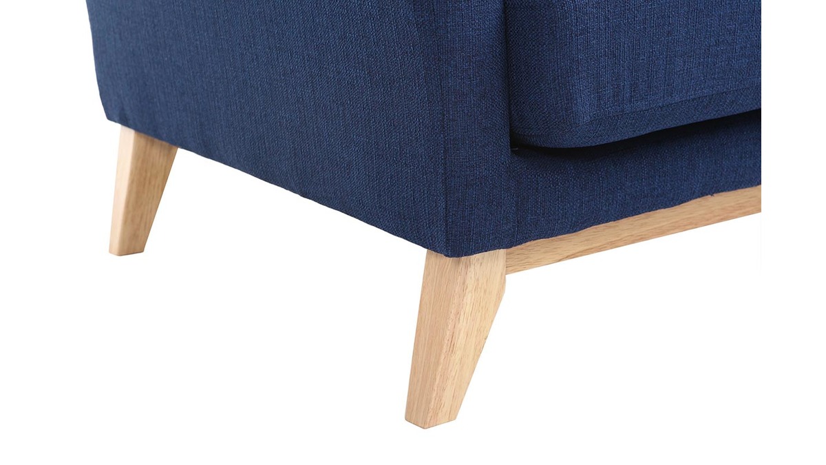 Formant un duo sans fausse note, le revêtement en tissu (100% polyester) et le piètement en hévéa massif, subliment avec simplicité les lignes de cet élégant canapé bleu foncé.