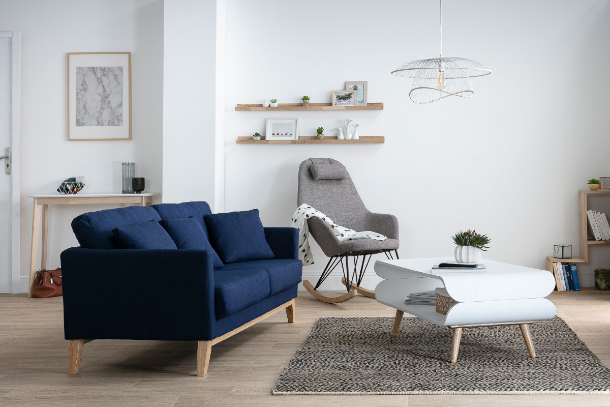 Formez un tandem de charme en associant le canapé scandinave bleu foncé OSLO à une table basse en bois clair.