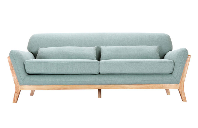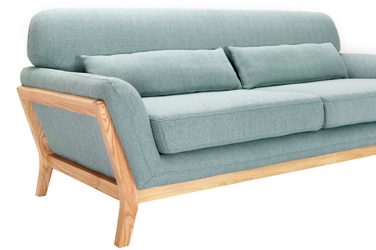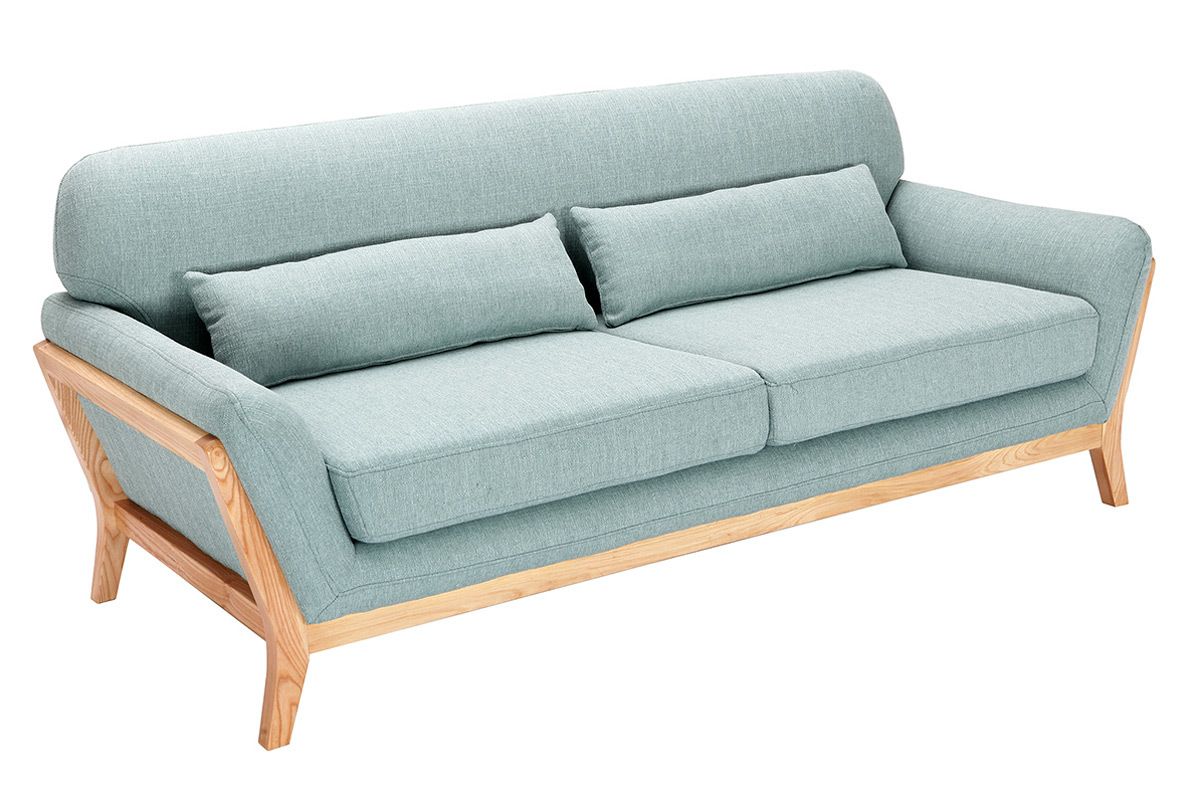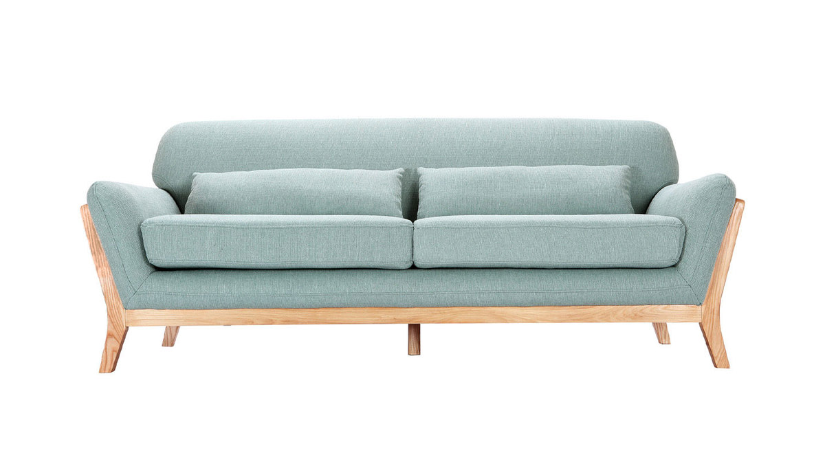 Confortable grâce à son haut dossier, sa large assise et ses deux coussins d'appoint cale-reins, ce canapé design en tissu vert lagon et bois clair est définitivement aussi esthétique qu'accueillant.