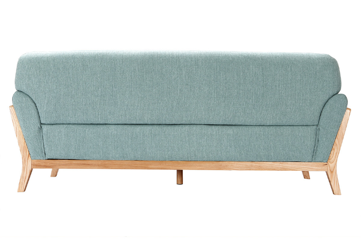 Canapé 3 places en tissu vert lagon et bois clair YOKO livré prêt à assembler. Montage simple, seul le dossier est à fixer. Le colis étant volumineux, nous vous conseillons de vérifier que portes et escaliers permettent son passage.