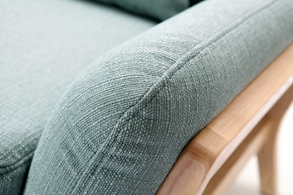 YOKO, à la fois design et original, se distingue par une structure en bois clair (frêne massif) prolongée jusqu'au piètement. Avec son revêtement en tissu (100% polyester) et ses beaux volumes, ce grand canapé bleu vert (dimensions totales L189 x P85 x H78.5 cm) charmera ses hôtes au premier regard !