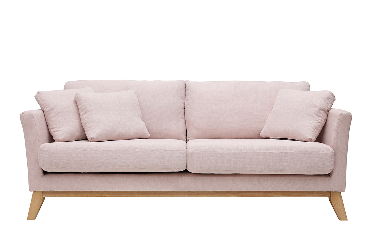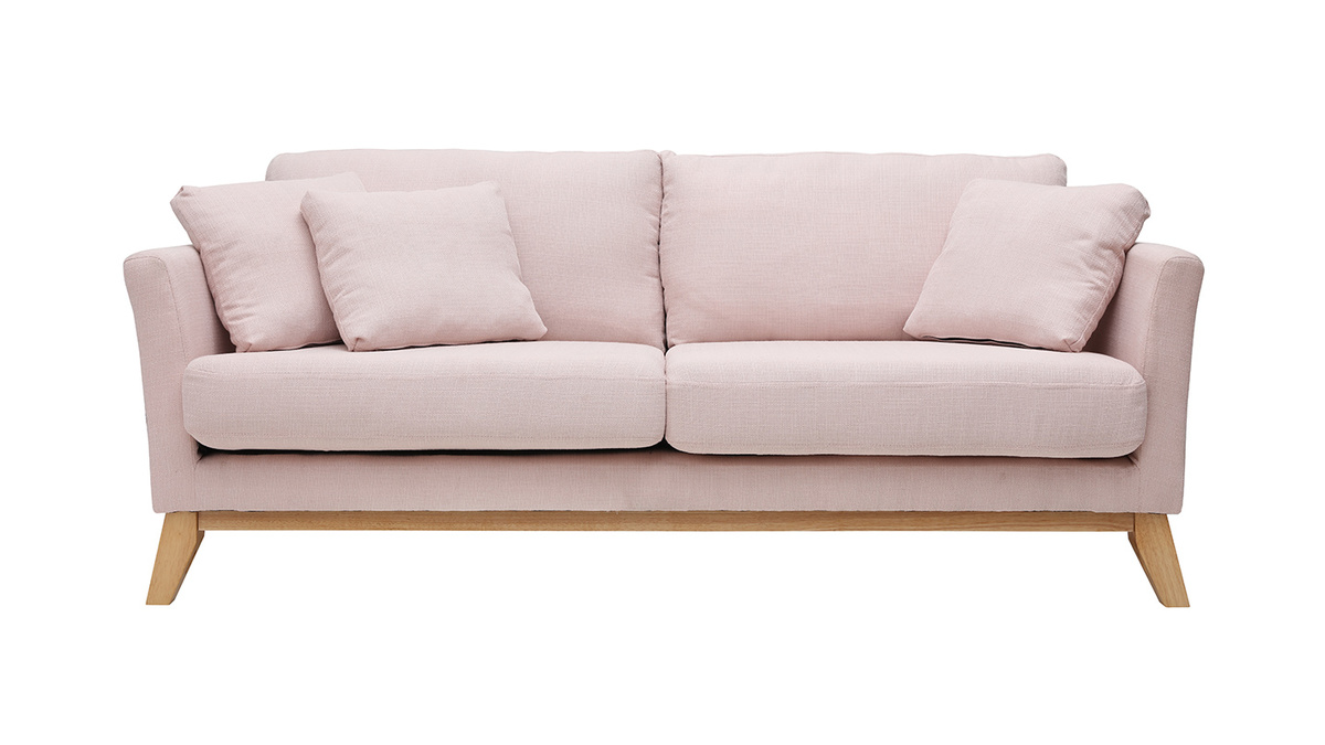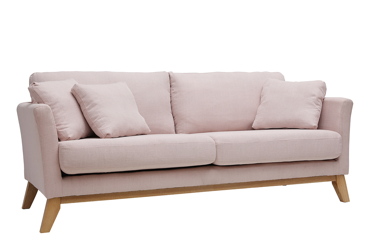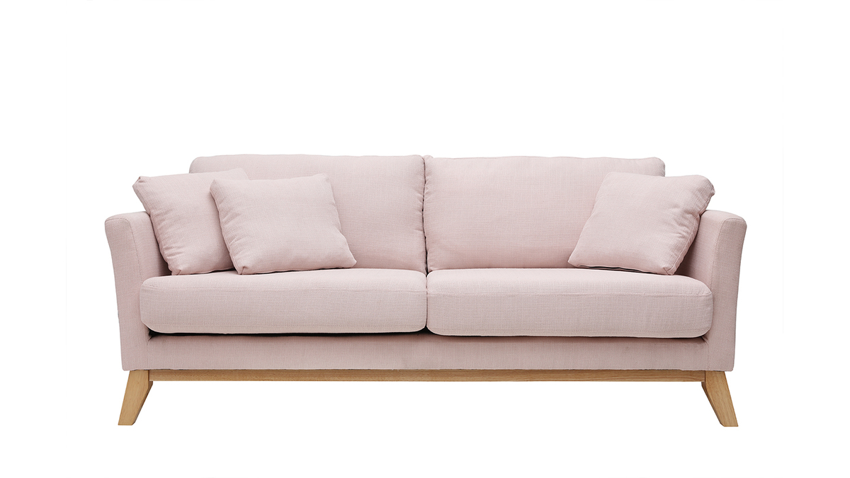 Canapé scandinave déhoussable 3 places en tissu rose clair et bois clair OSLO livré prêt à assembler. Montage simple, seuls les pieds sont à fixer.