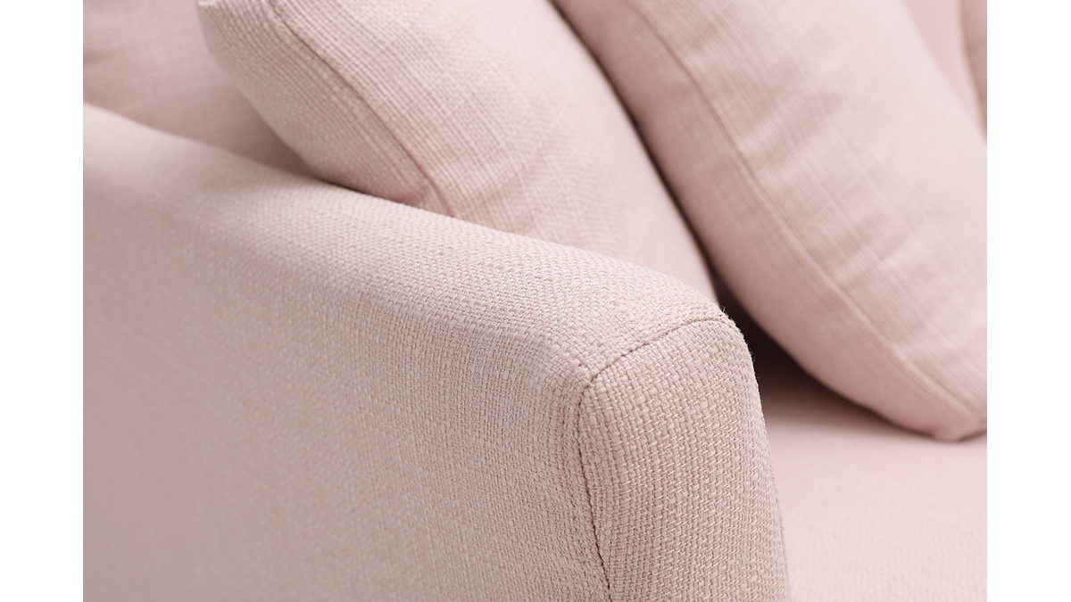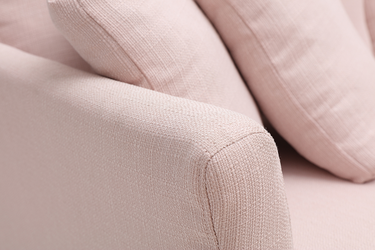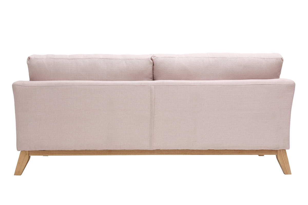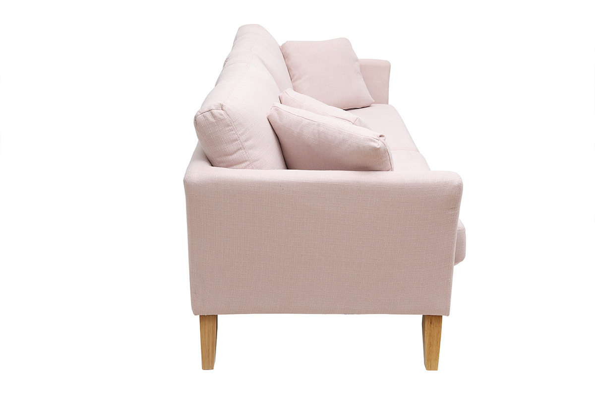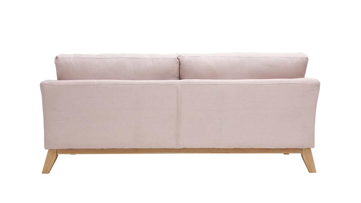 Formant un duo sans fausse note, le revêtement en tissu (100% polyester) et le piètement en hévéa massif, subliment avec simplicité les lignes de cet élégant canapé rose pastel.