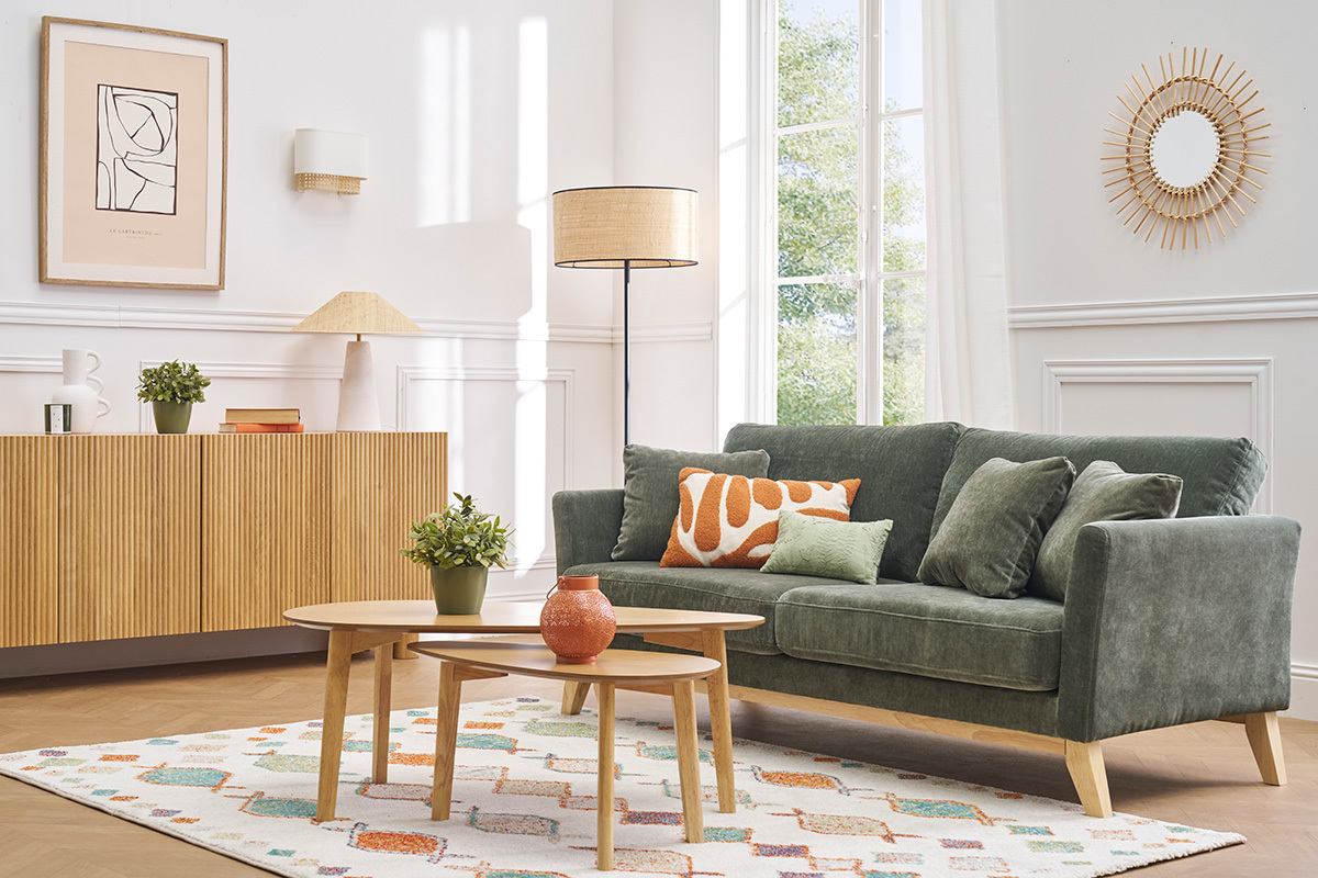 Formez un tandem de charme en associant le canapé scandinave vert kaki OSLO à une table basse en bois clair.