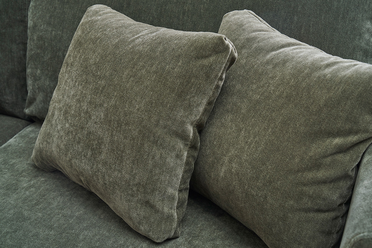 Formant un duo sans fausse note, le revêtement en tissu (100% polyester) et le piètement en hévéa massif, subliment avec simplicité les lignes de cet élégant canapé vert kaki.