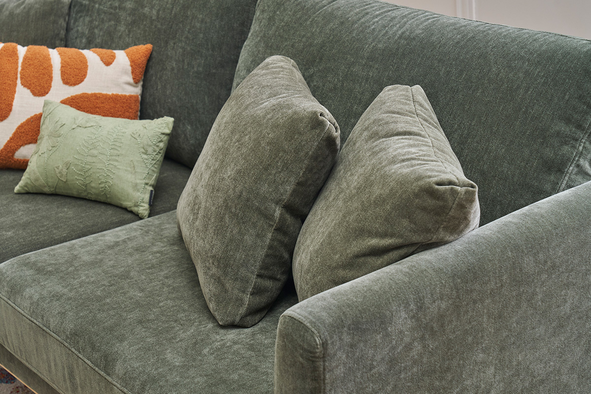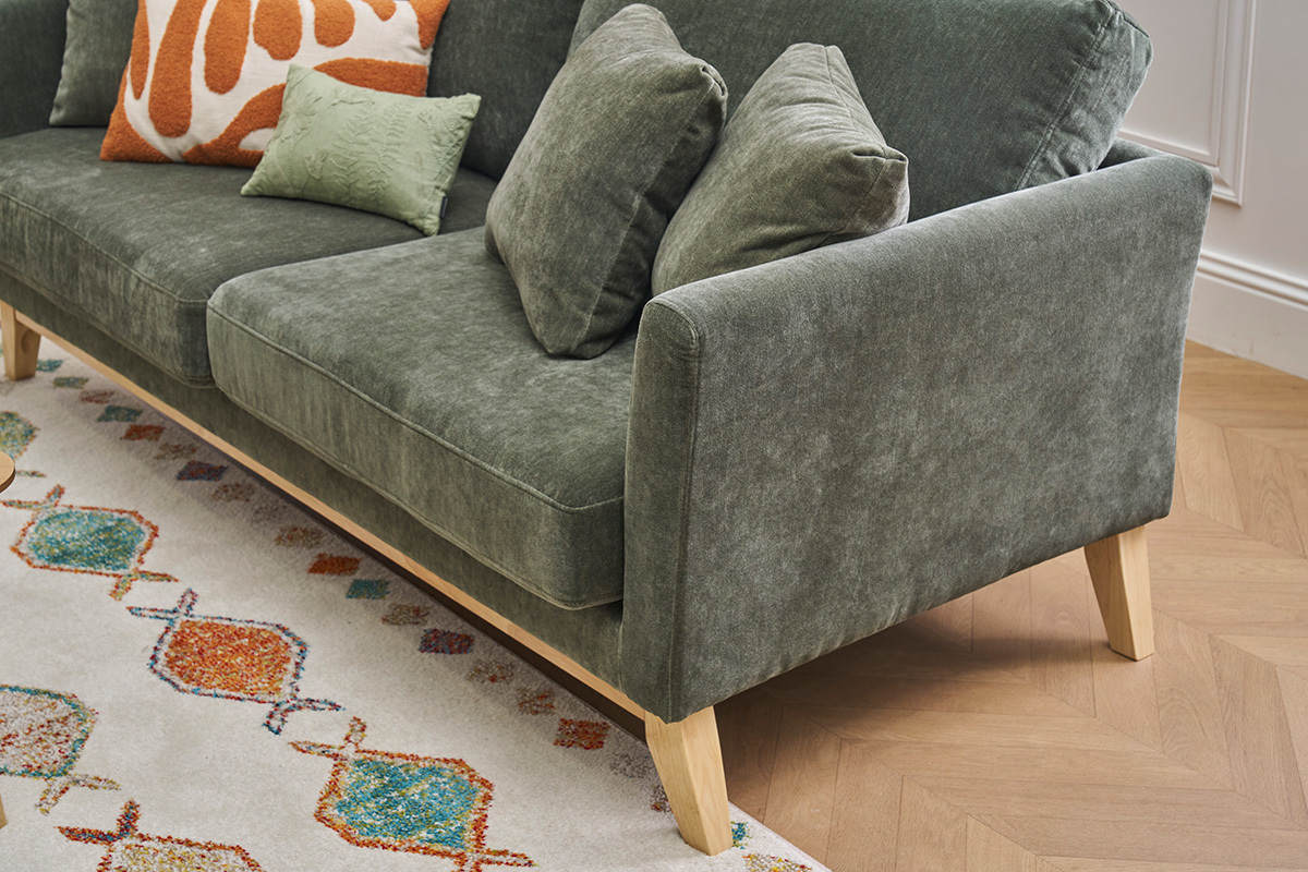 Pieds inclinés en bois clair, revêtement aussi doux au toucher qu'agréable au regard, formes fonctionnelles : ce canapé scandinave en tissu effet velours vert kaki séduit par son caractère chaleureux.