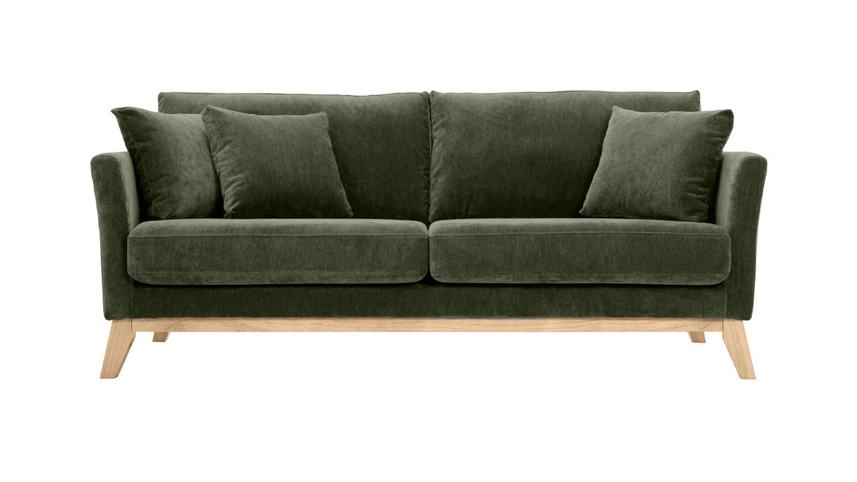 Canapé scandinave déhoussable 3 places en tissu effet velours vert kaki et bois clair OSLO livré prêt à assembler. Montage simple, seuls les pieds sont à fixer.