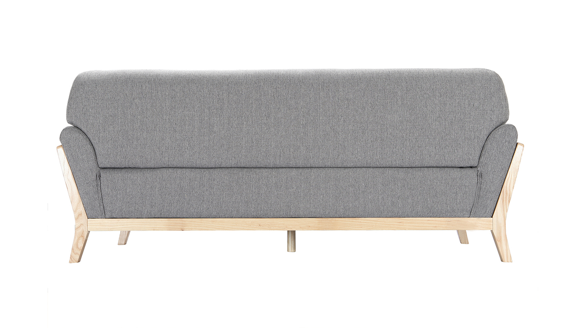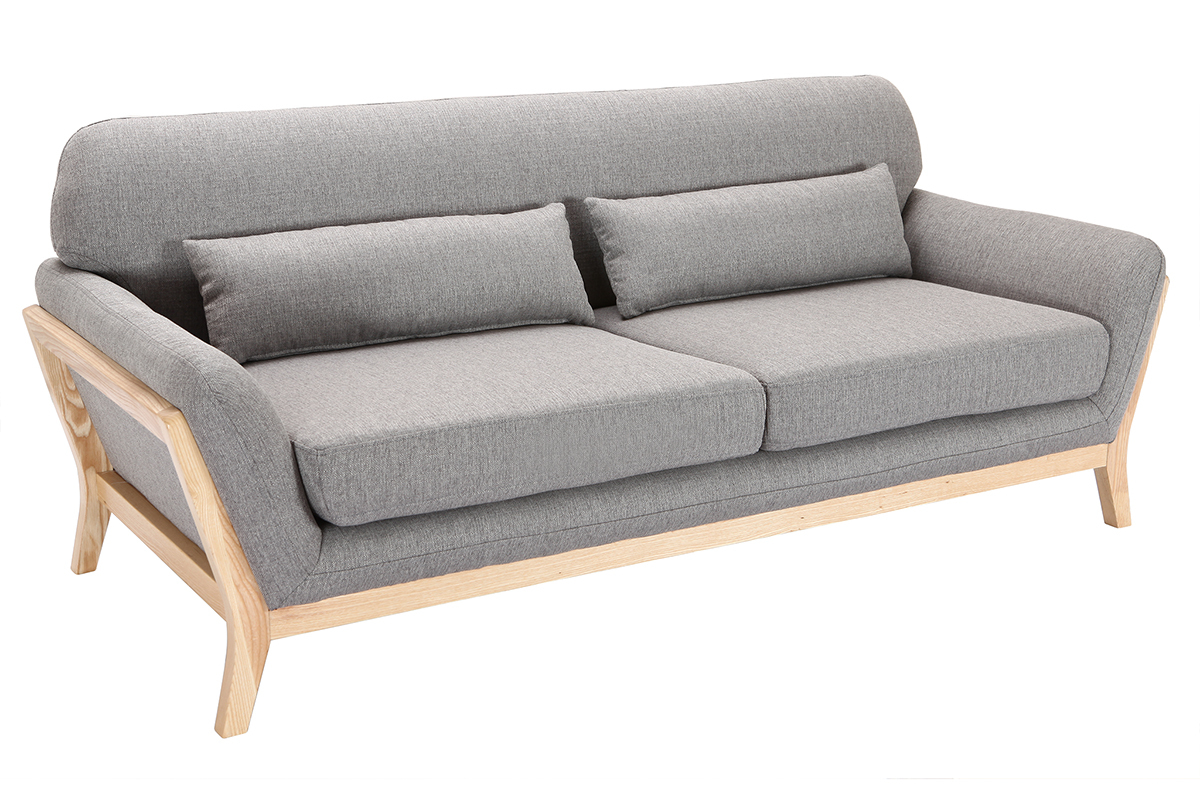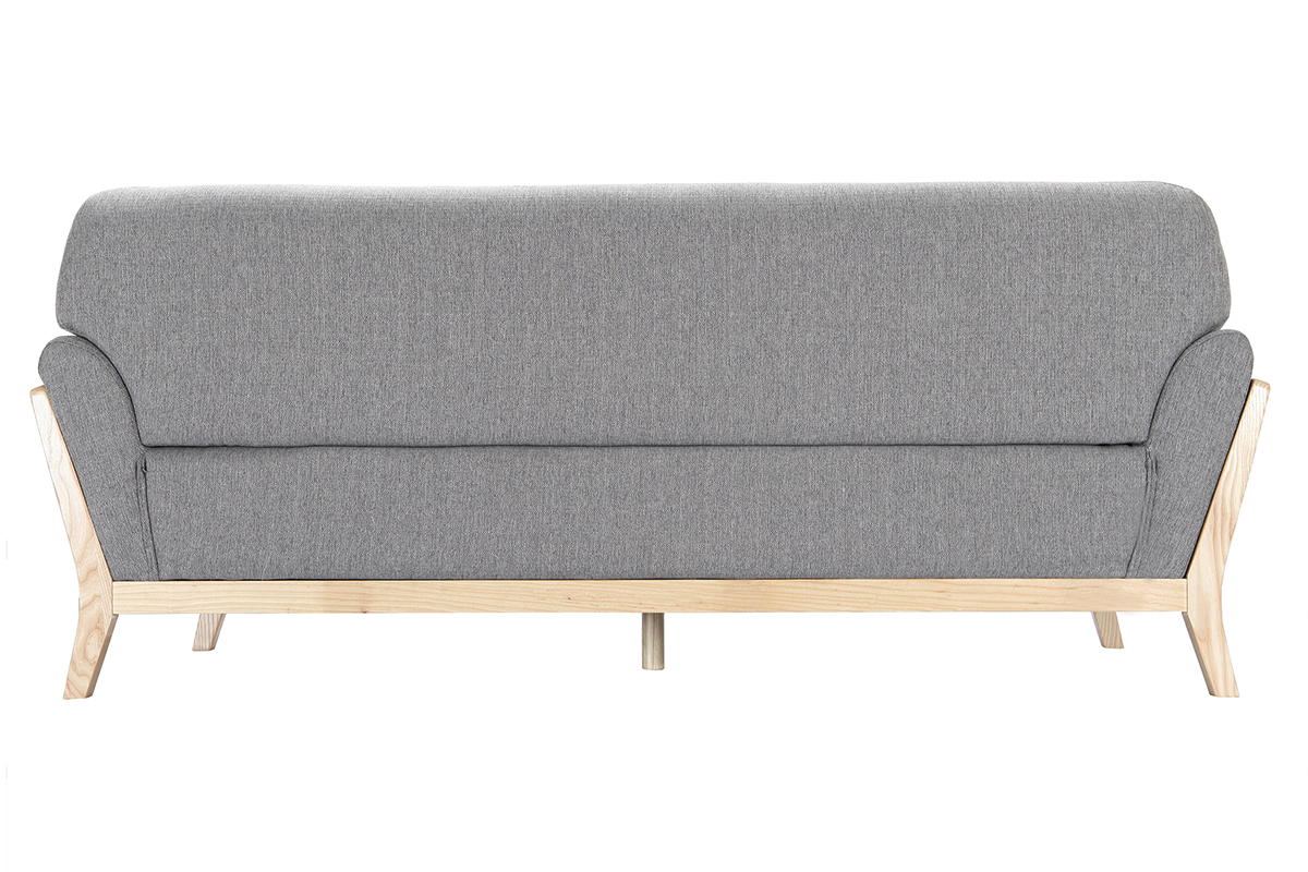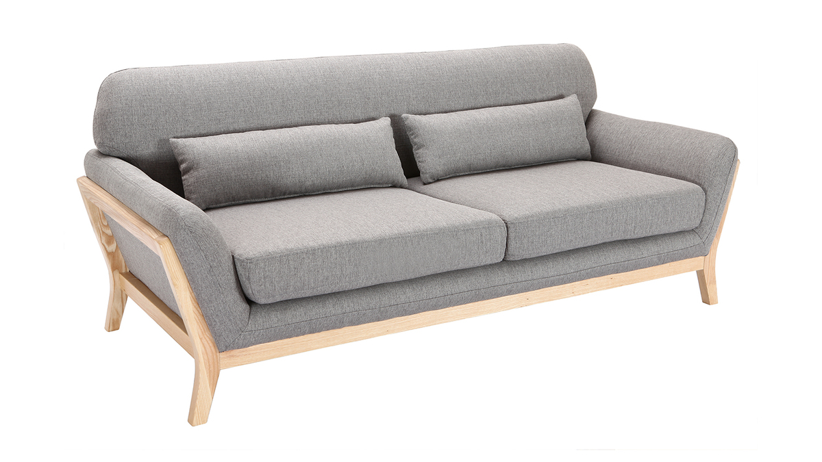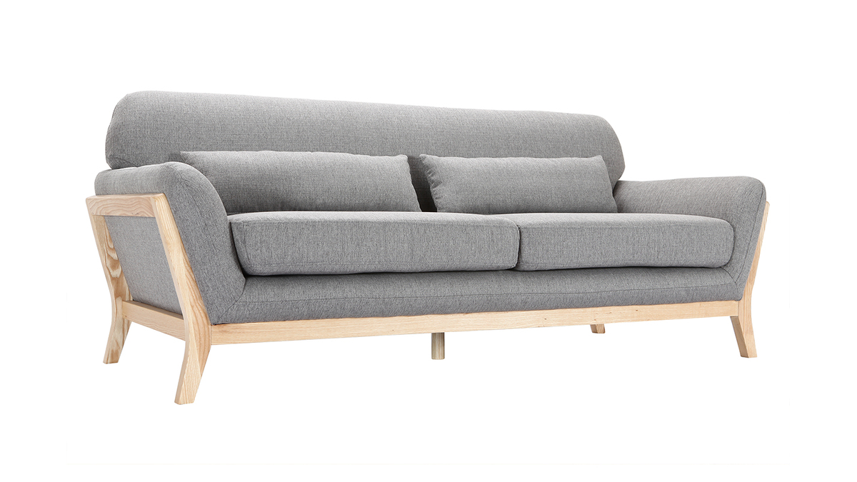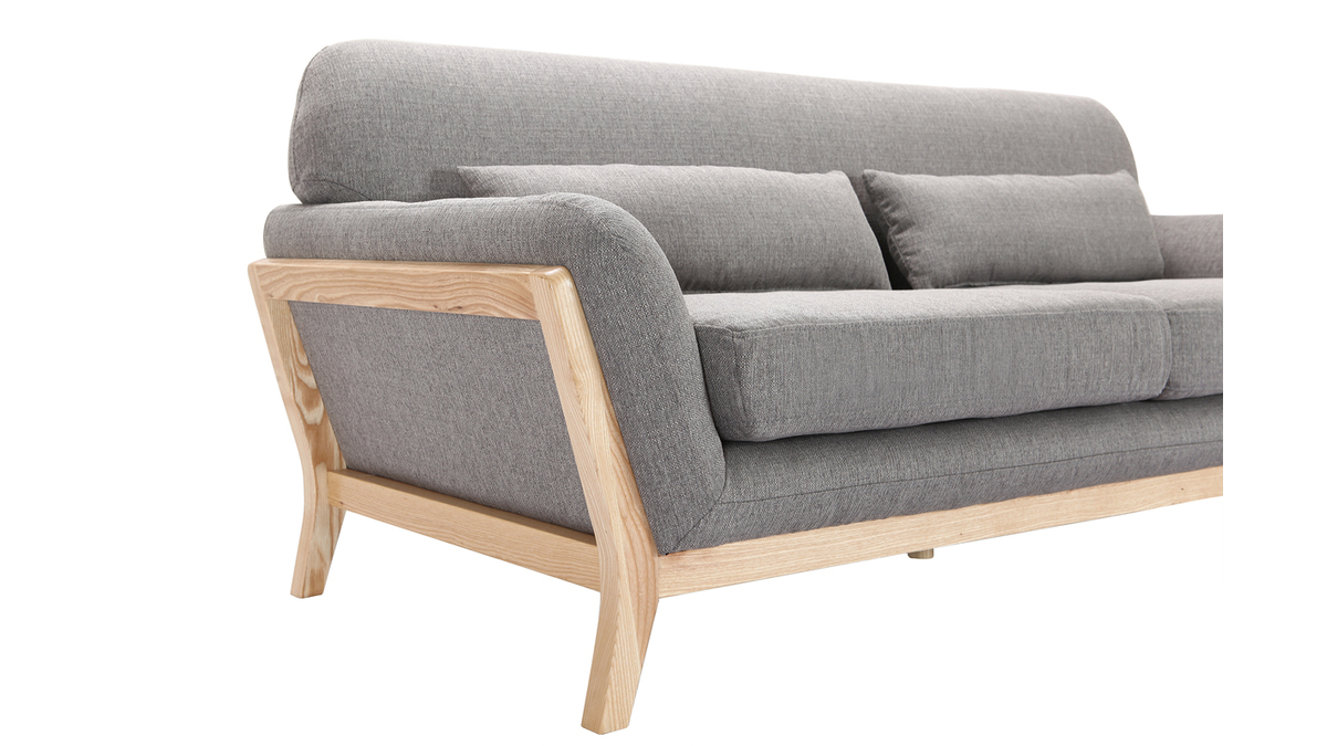 Canapé 3 places en tissu gris et bois clair YOKO livré prêt à assembler. Montage simple, seul le dossier est à fixer. Le colis étant volumineux, nous vous conseillons de vérifier que portes et escaliers permettent son passage.