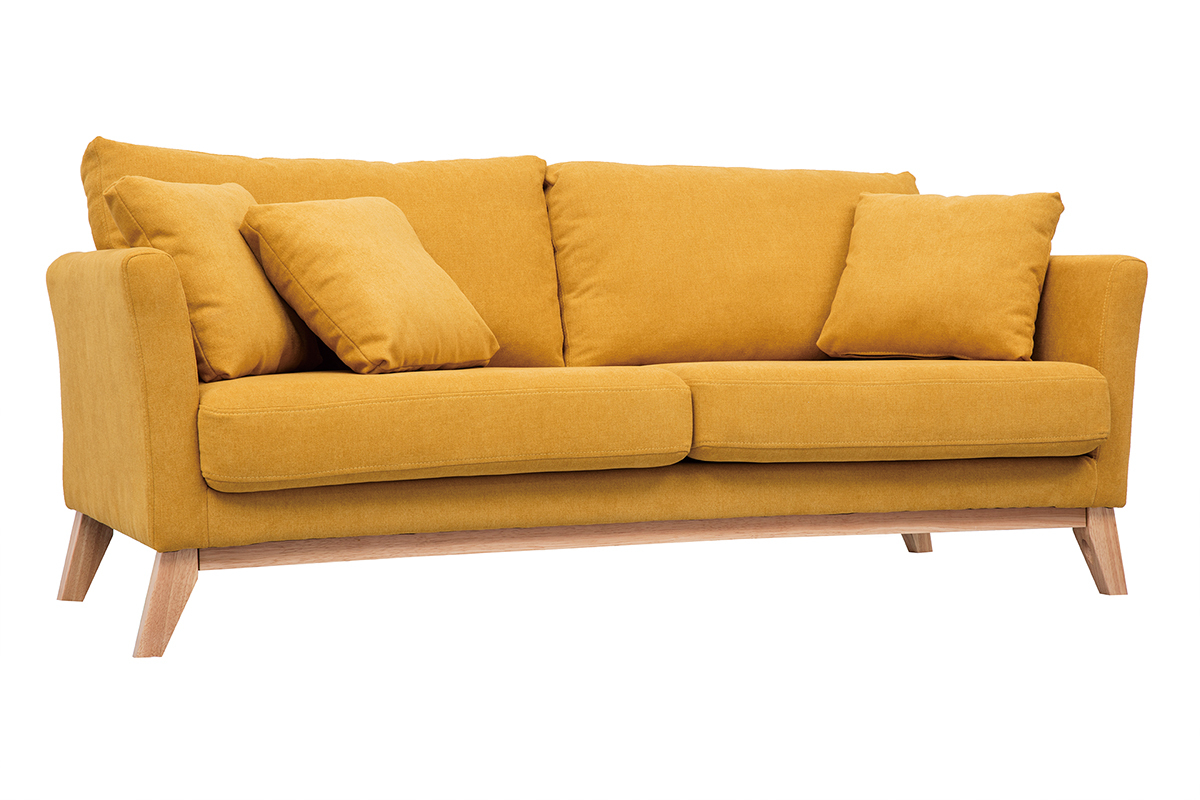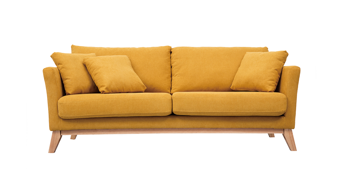 Canapé scandinave déhoussable 3 places en tissu effet velours jaune moutarde et bois clair OSLO livré prêt à assembler. Montage simple, seuls les pieds sont à fixer.