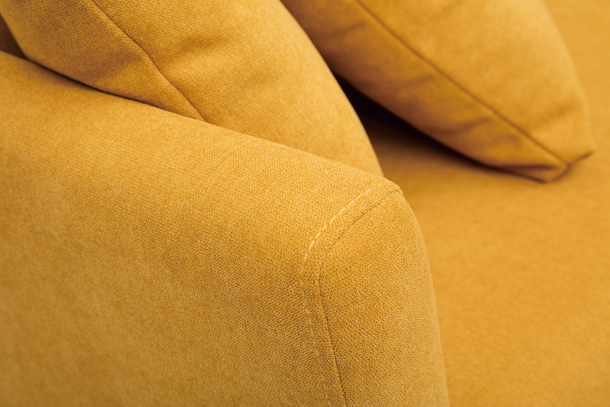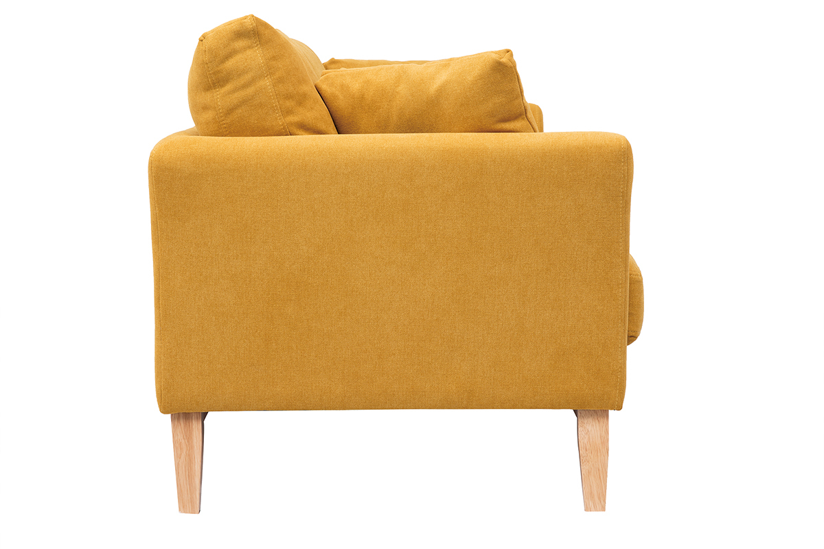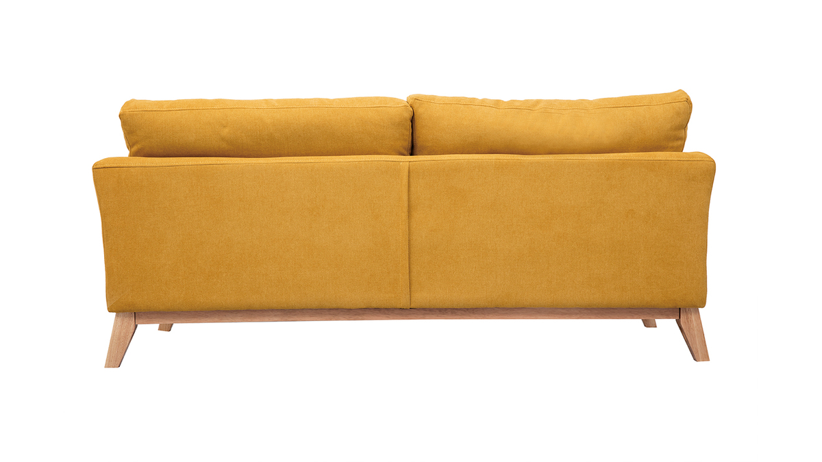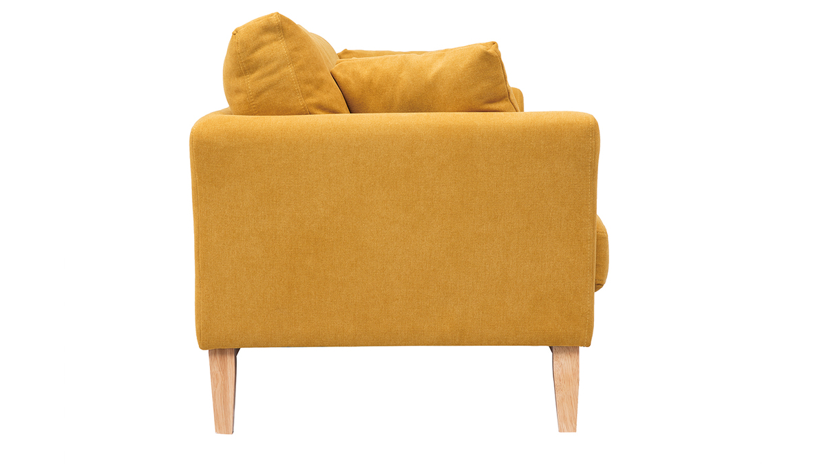 Formant un duo sans fausse note, le revêtement en tissu (100% polyester) et le piètement en hévéa massif, subliment avec simplicité les lignes de cet élégant canapé jaune moutarde.