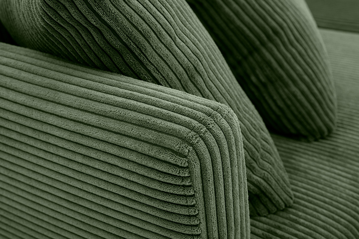 Formant un duo sans fausse note, le revêtement en tissu velours côtelé (90% polyester, 10% nylon) et le piètement en hévéa massif, subliment avec simplicité les lignes de cet élégant canapé vert.