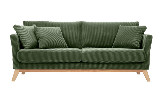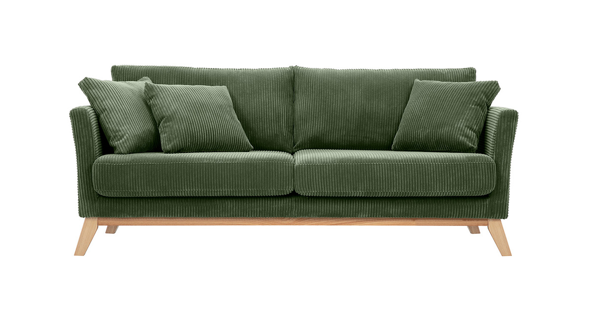 Canapé scandinave déhoussable 3 places en tissu velours côtelé vert kaki et bois clair OSLO livré prêt à assembler. Montage simple, seuls les pieds sont à fixer.