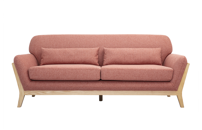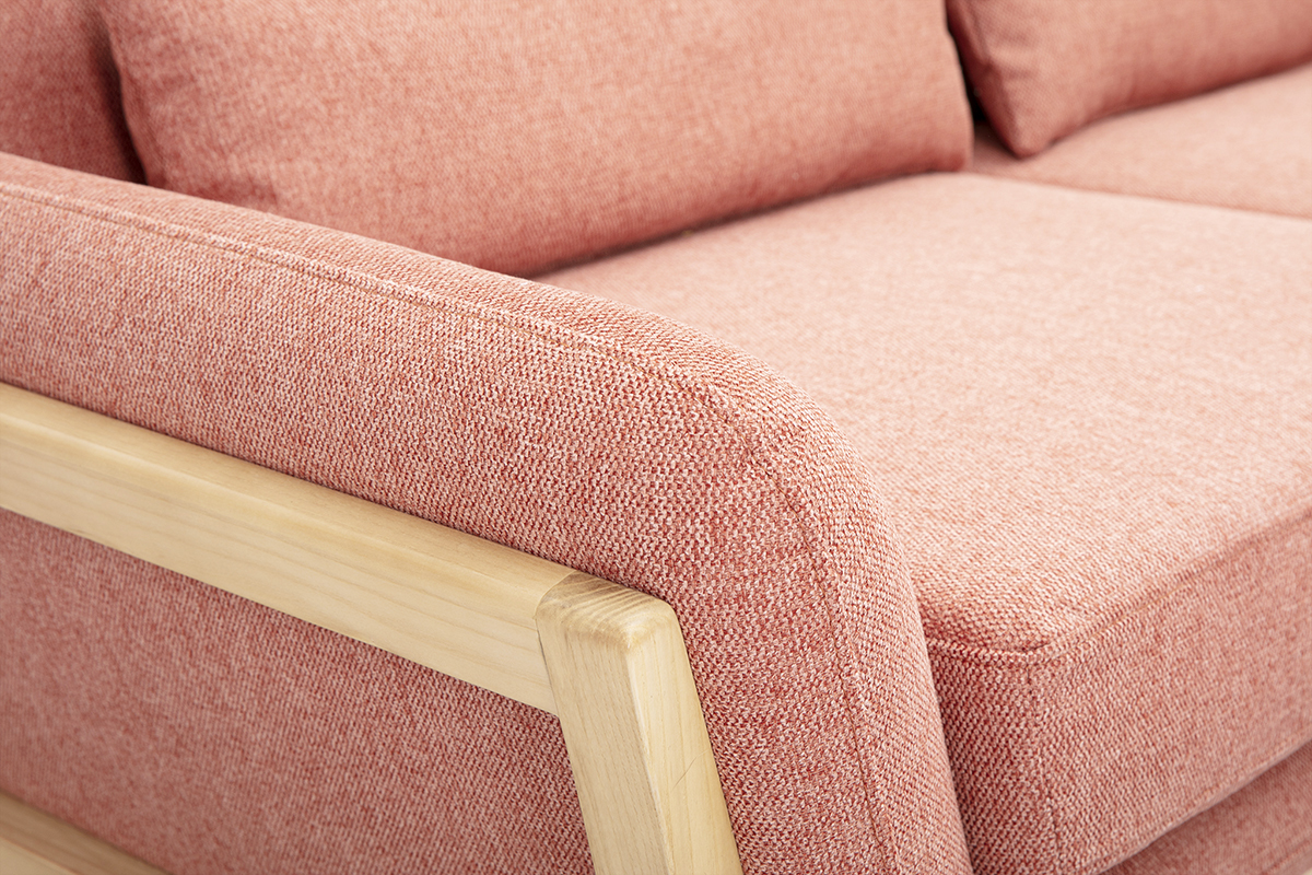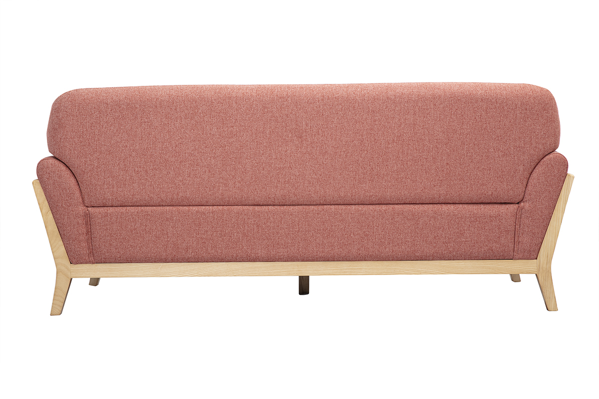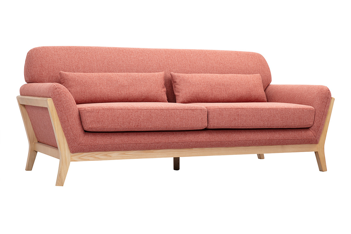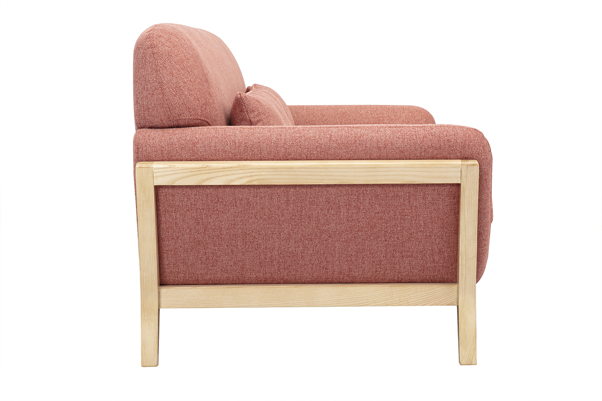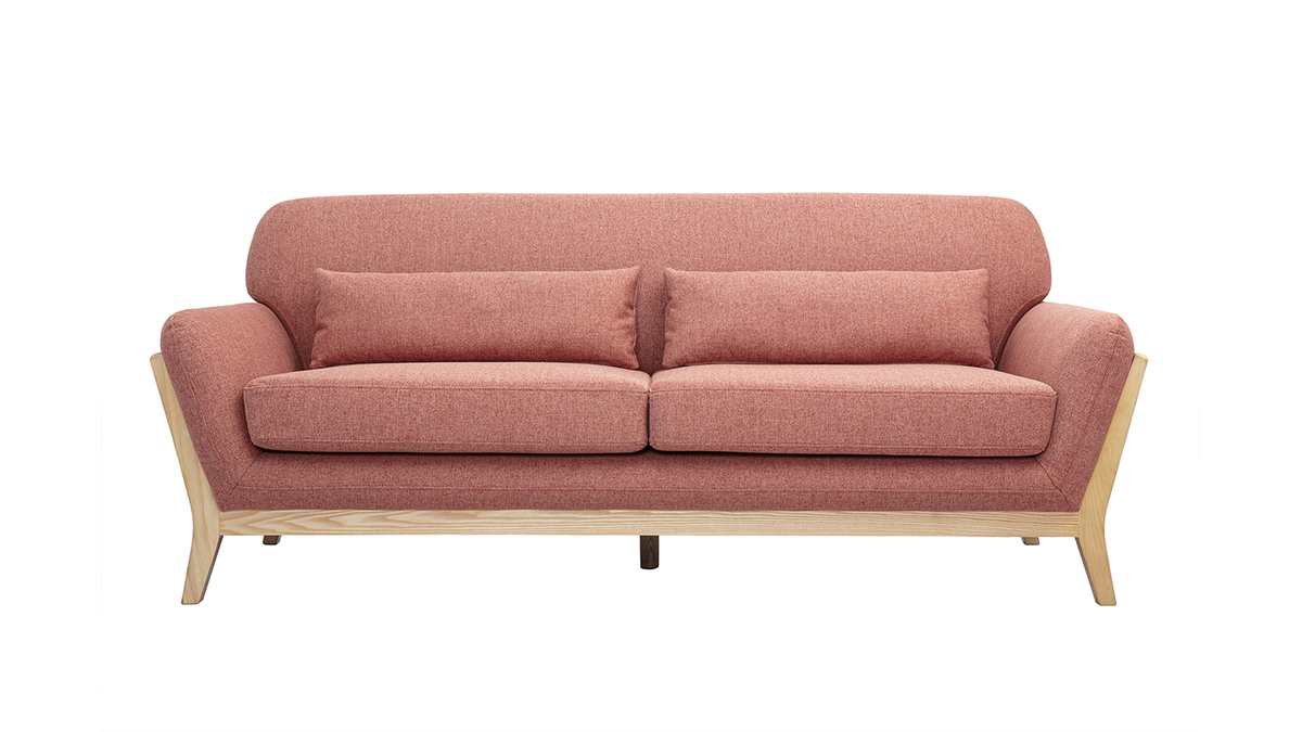 YOKO, à la fois design et original, se distingue par une structure en bois clair (frêne massif) prolongée jusqu'au piètement. Avec son revêtement en tissu effet velours texturé et ses beaux volumes, ce grand canapé terracotta (dimensions totales L189 x P85 x H79 cm) charmera ses hôtes au premier regard !