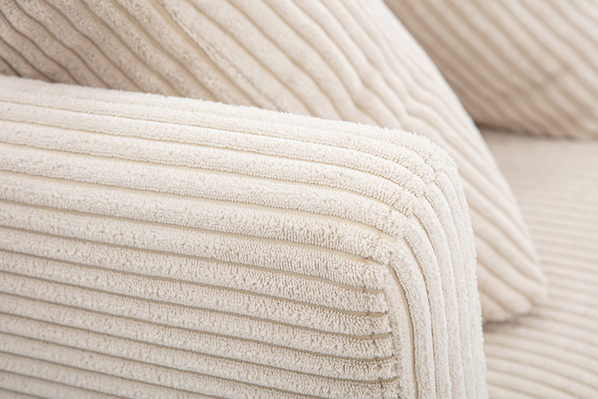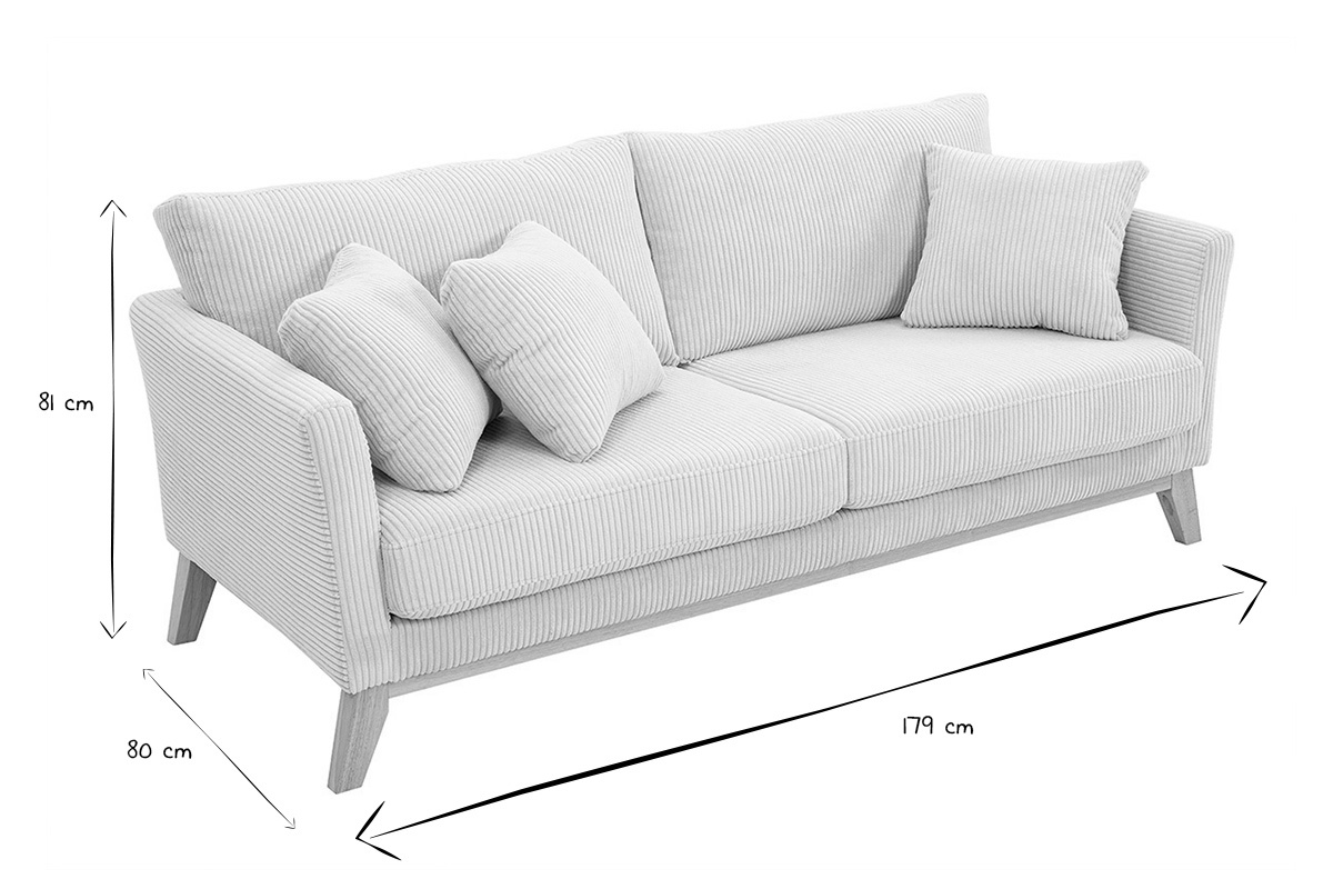 Formant un duo sans fausse note, le revêtement en tissu velours côtelé (100% polyester) et le piètement en hévéa massif, subliment avec simplicité les lignes de cet élégant canapé beige.