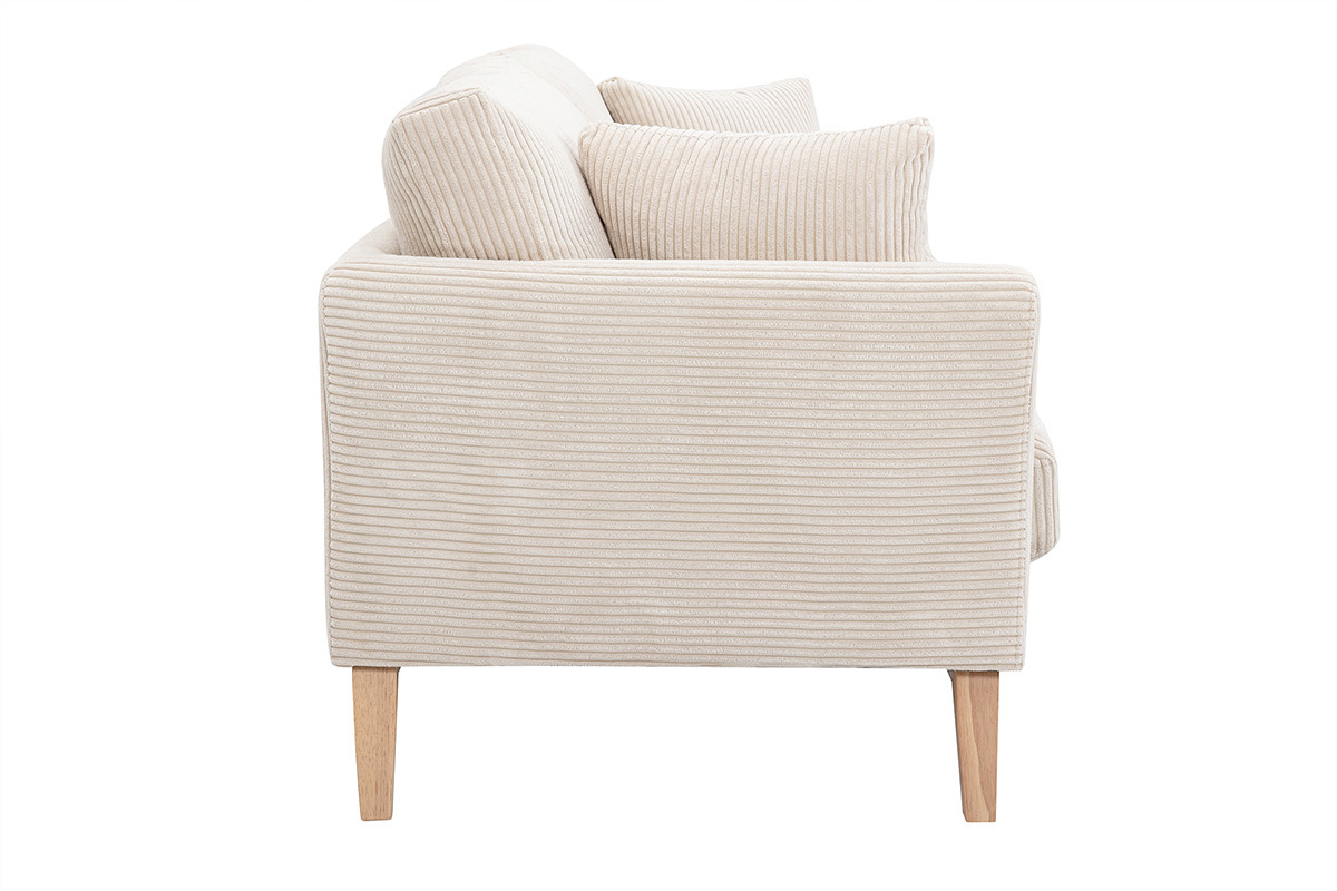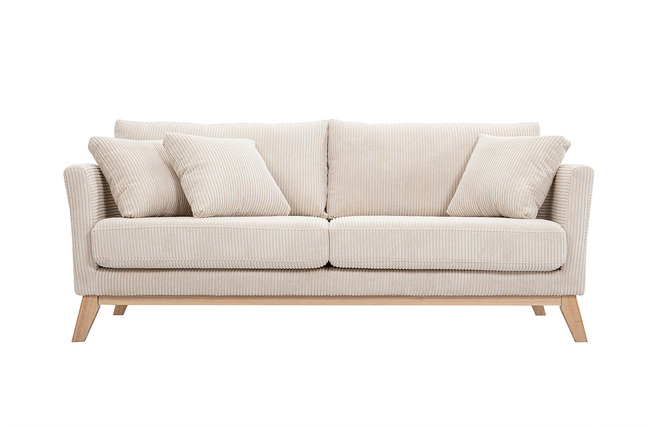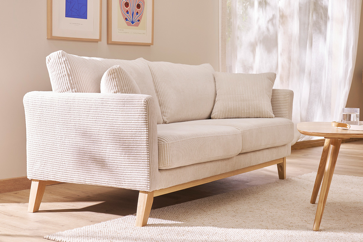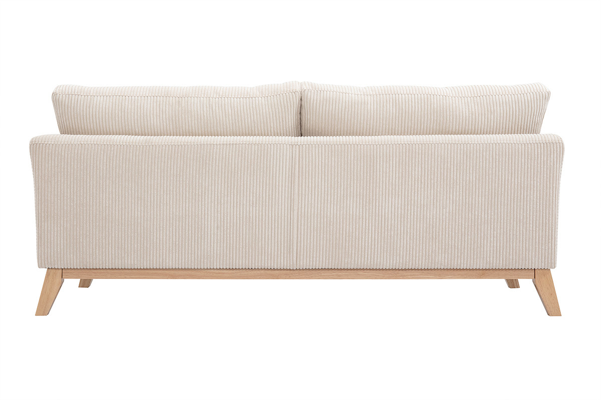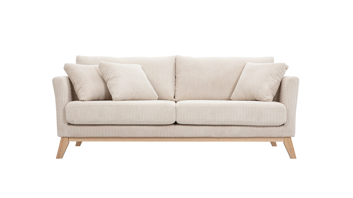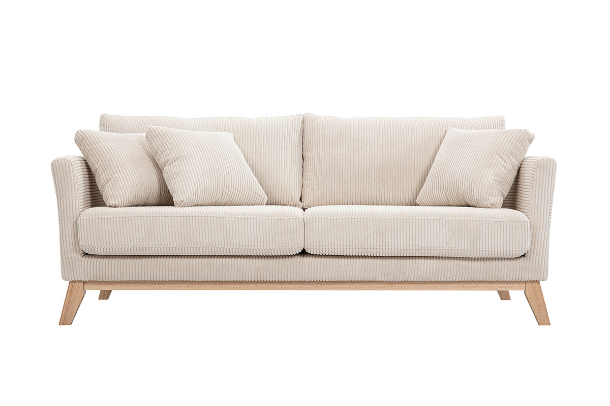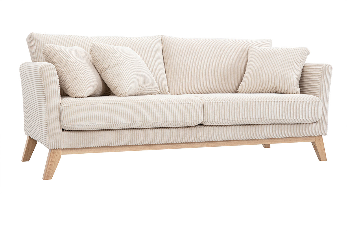 Canapé scandinave déhoussable 3 places en tissu velours côtelé beige et bois clair OSLO livré prêt à assembler. Montage simple, seuls les pieds sont à fixer.