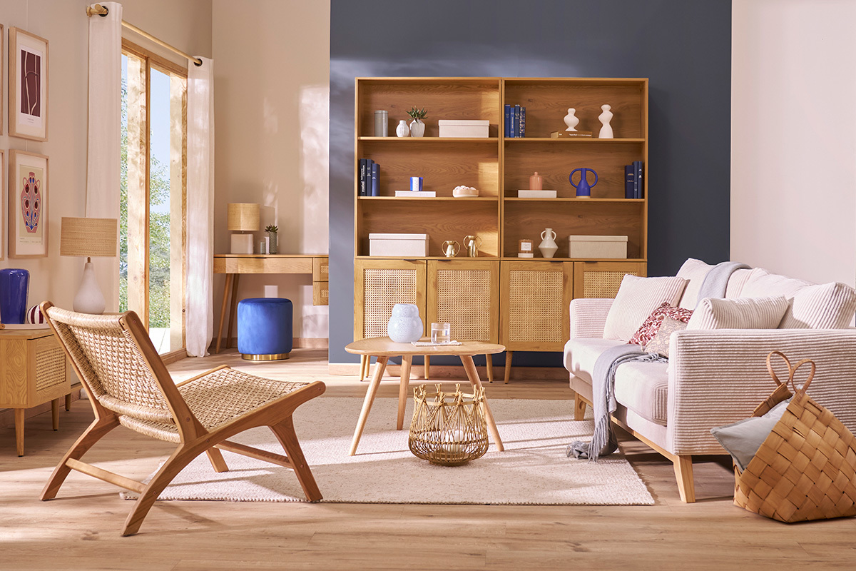 Formez un tandem de charme en associant le canapé scandinave beige OSLO à une table basse en bois clair.