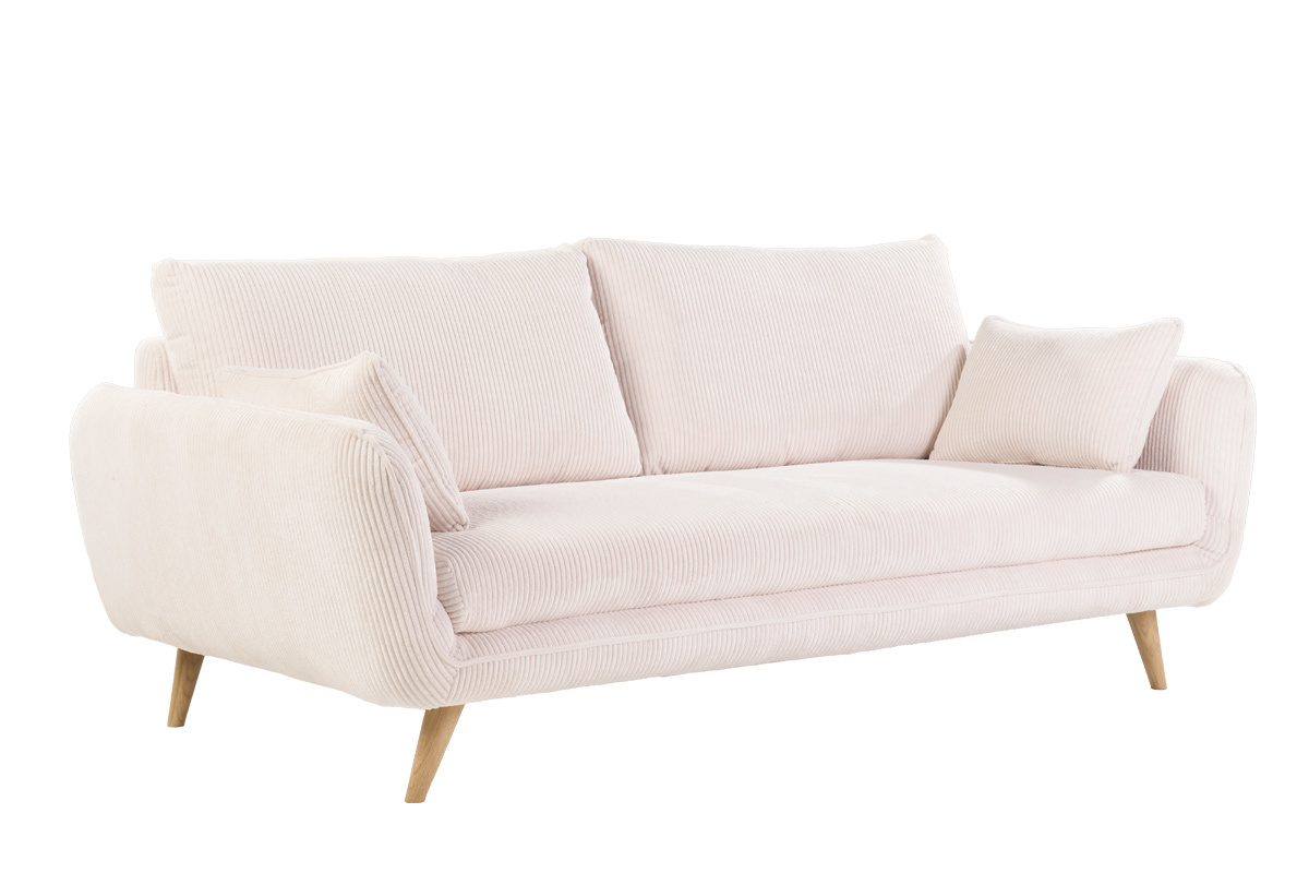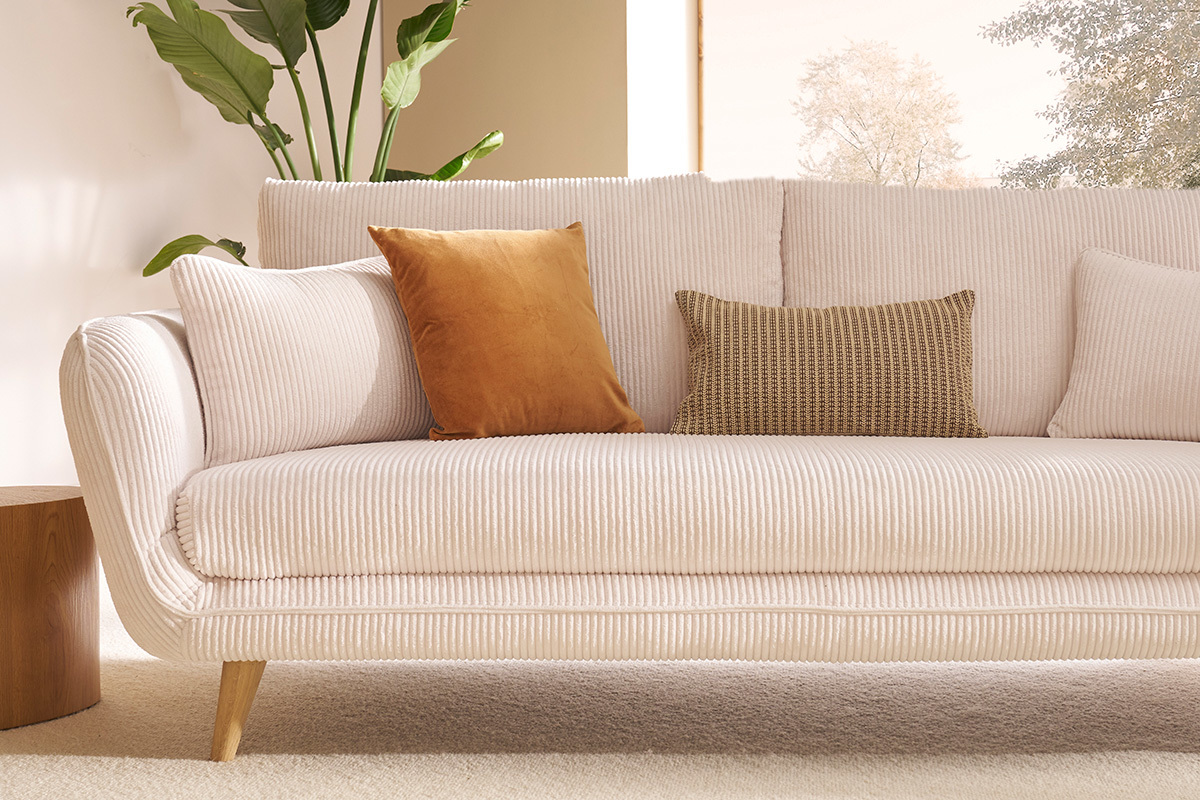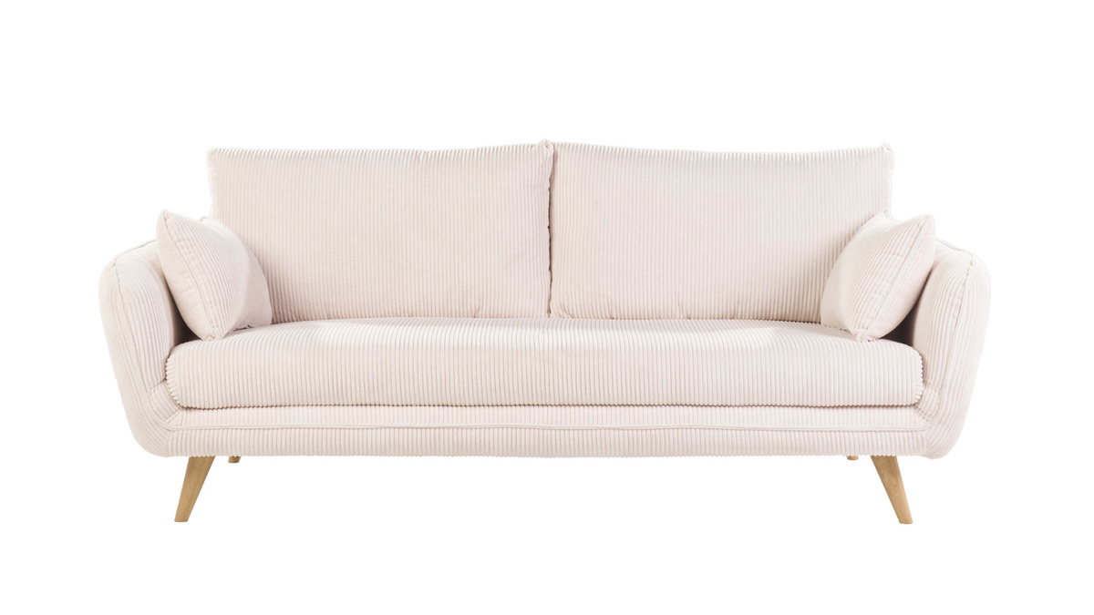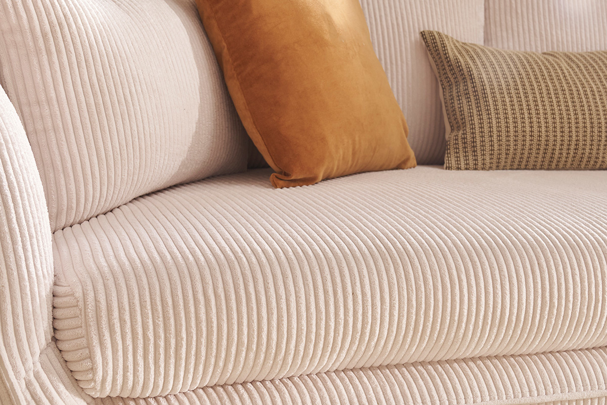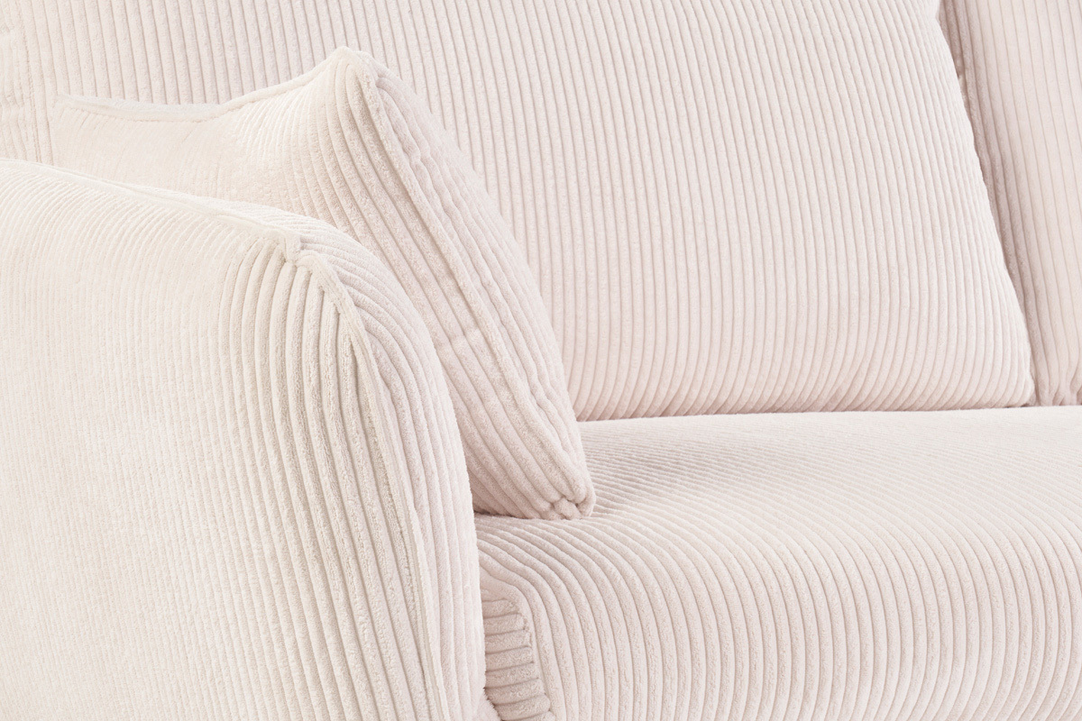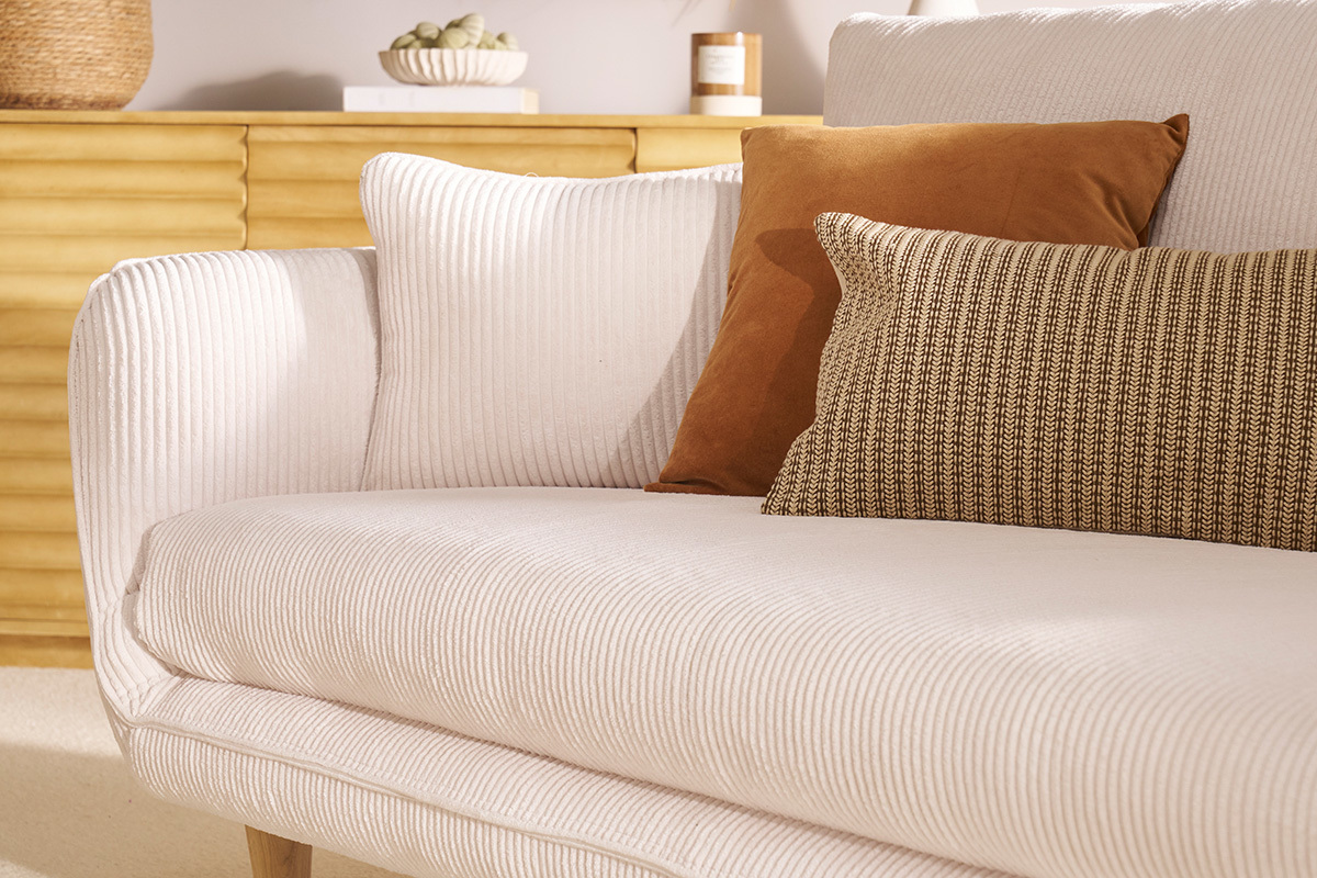 Canapé en velours côtelé livré prêt à monter. Coussins d'appoint inclus.