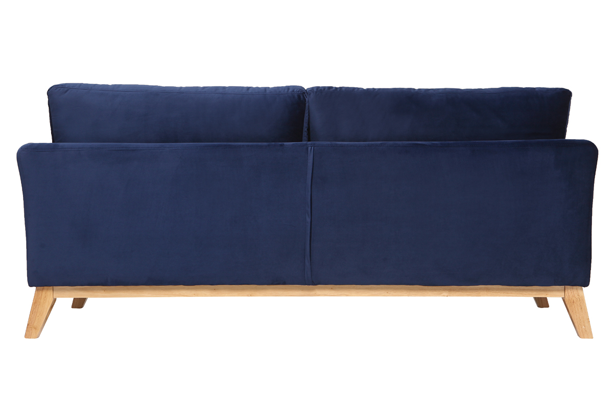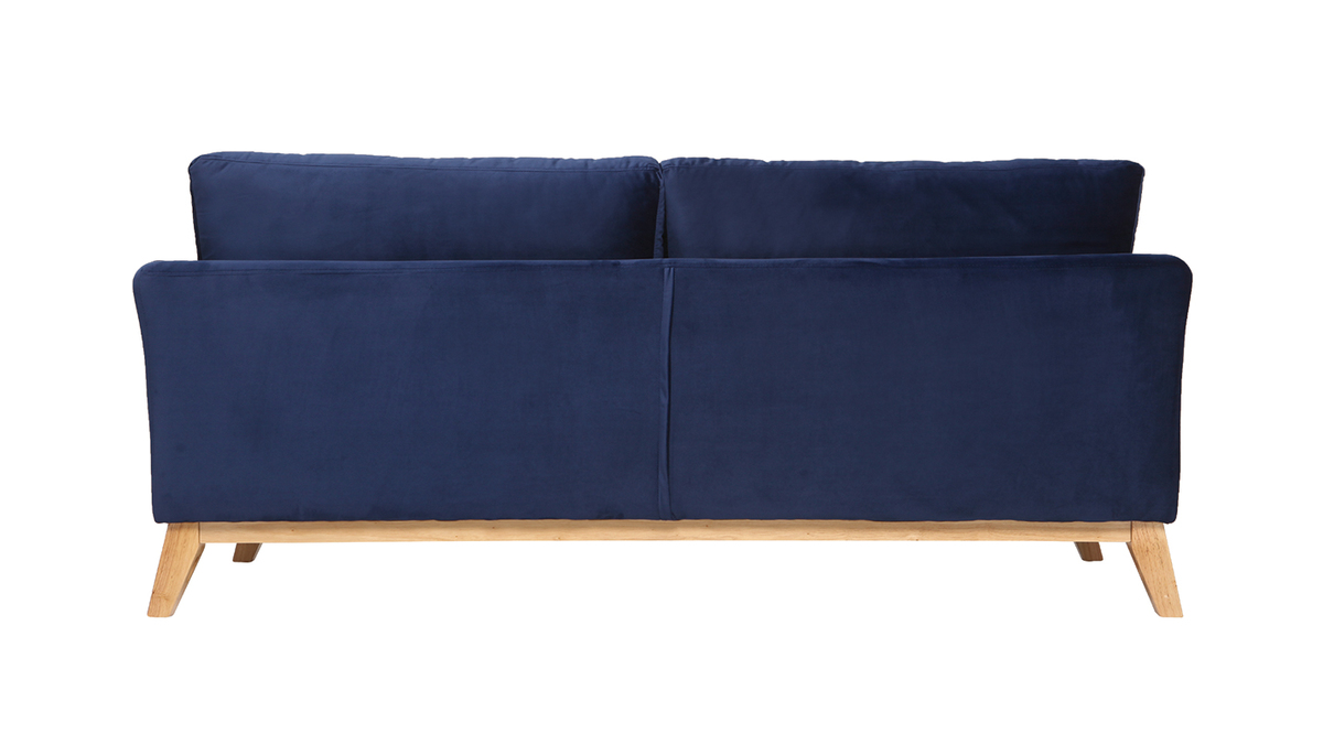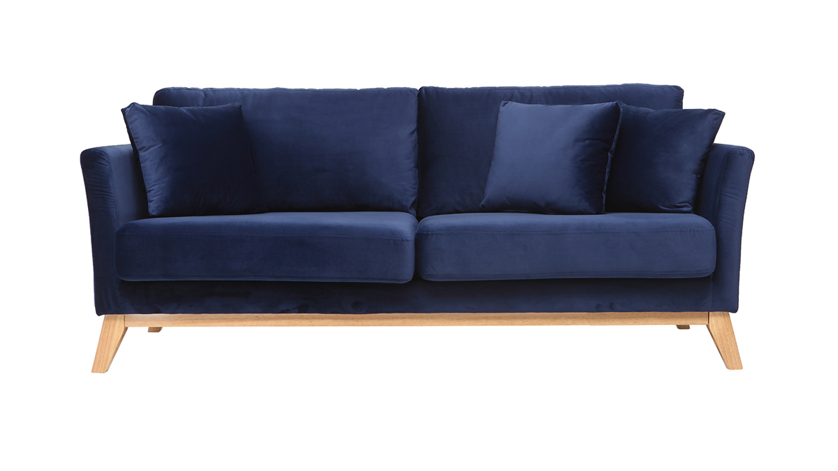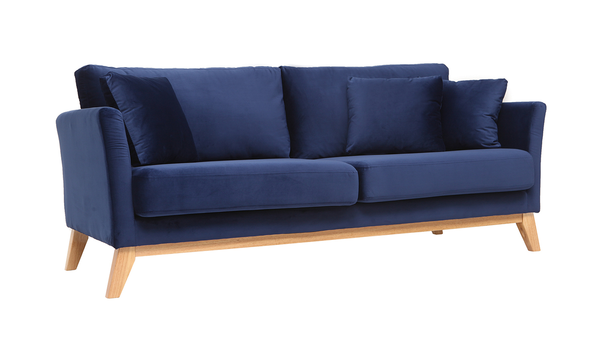 Canapé scandinave déhoussable 3 places en tissu velours bleu nuit et bois clair OSLO livré prêt à assembler. Montage simple, seuls les pieds sont à fixer.
