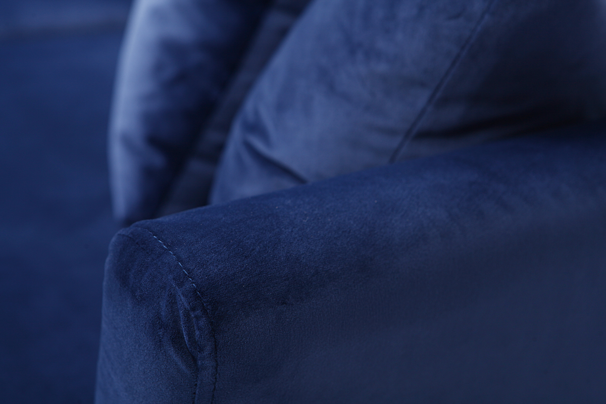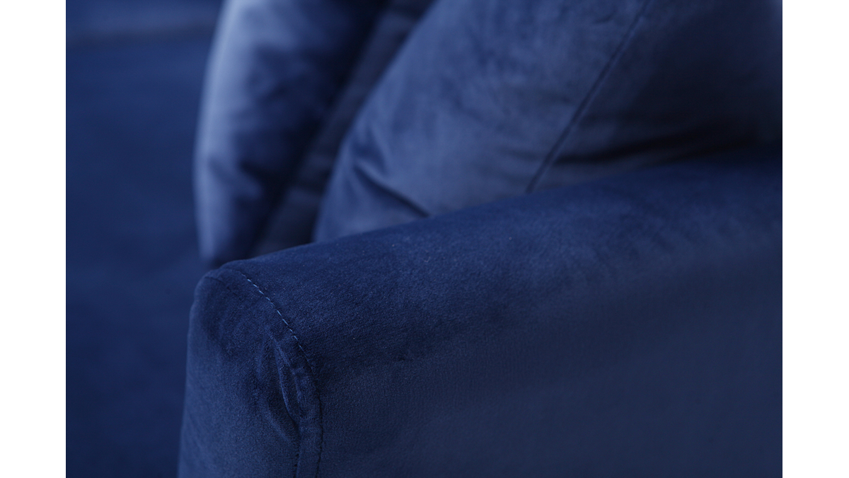 Formant un duo sans fausse note, le revêtement en tissu velours (100% polyester) et le piètement en hévéa massif, subliment avec simplicité les lignes de cet élégant canapé bleu nuit.