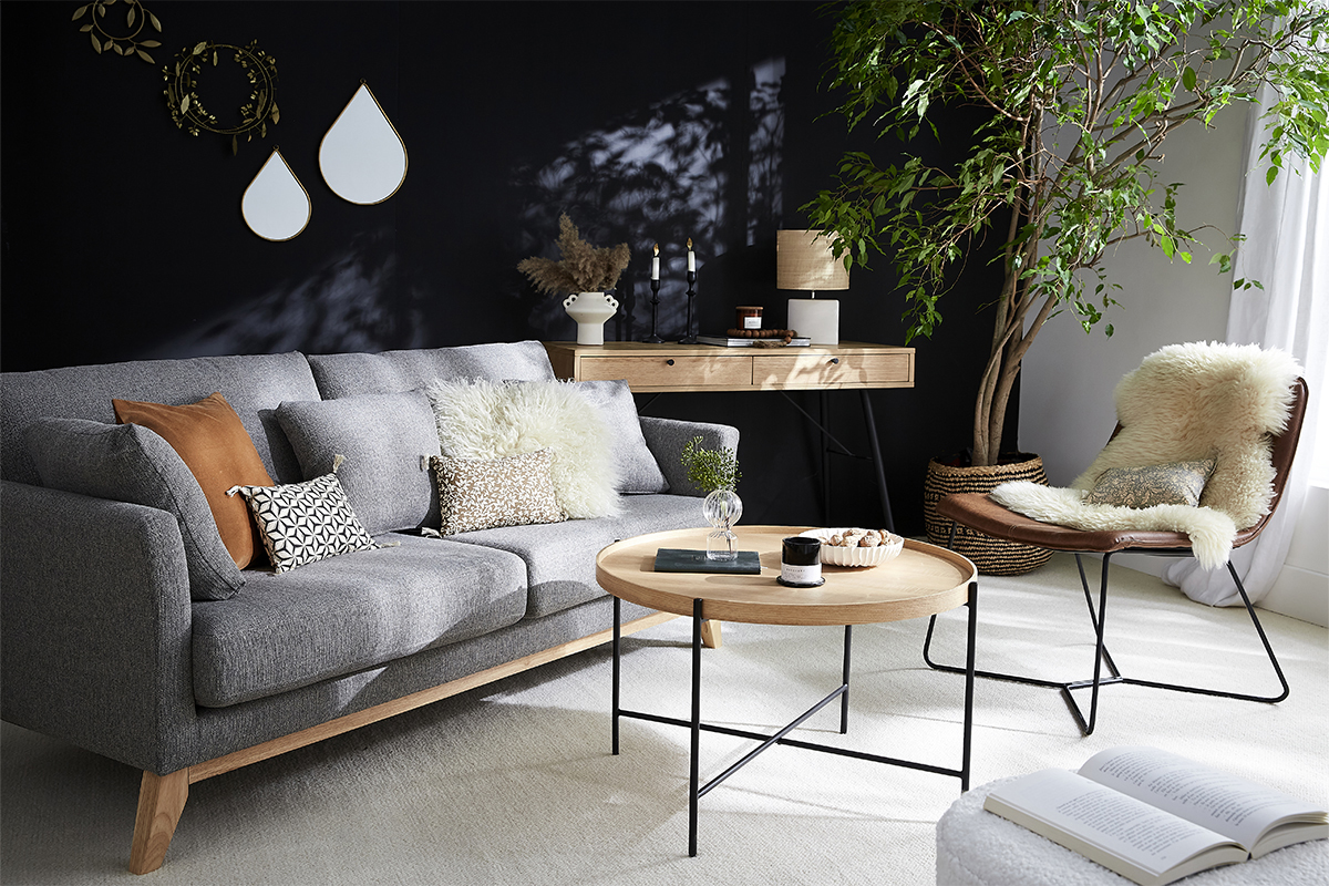 Formez un tandem de charme en associant le canapé scandinave bleu nuit OSLO à une table basse en bois clair.