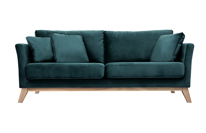 Canapé scandinave déhoussable 3 places en tissu velours bleu pétrole et bois clair OSLO livré prêt à assembler. Montage simple, seuls les pieds sont à fixer.