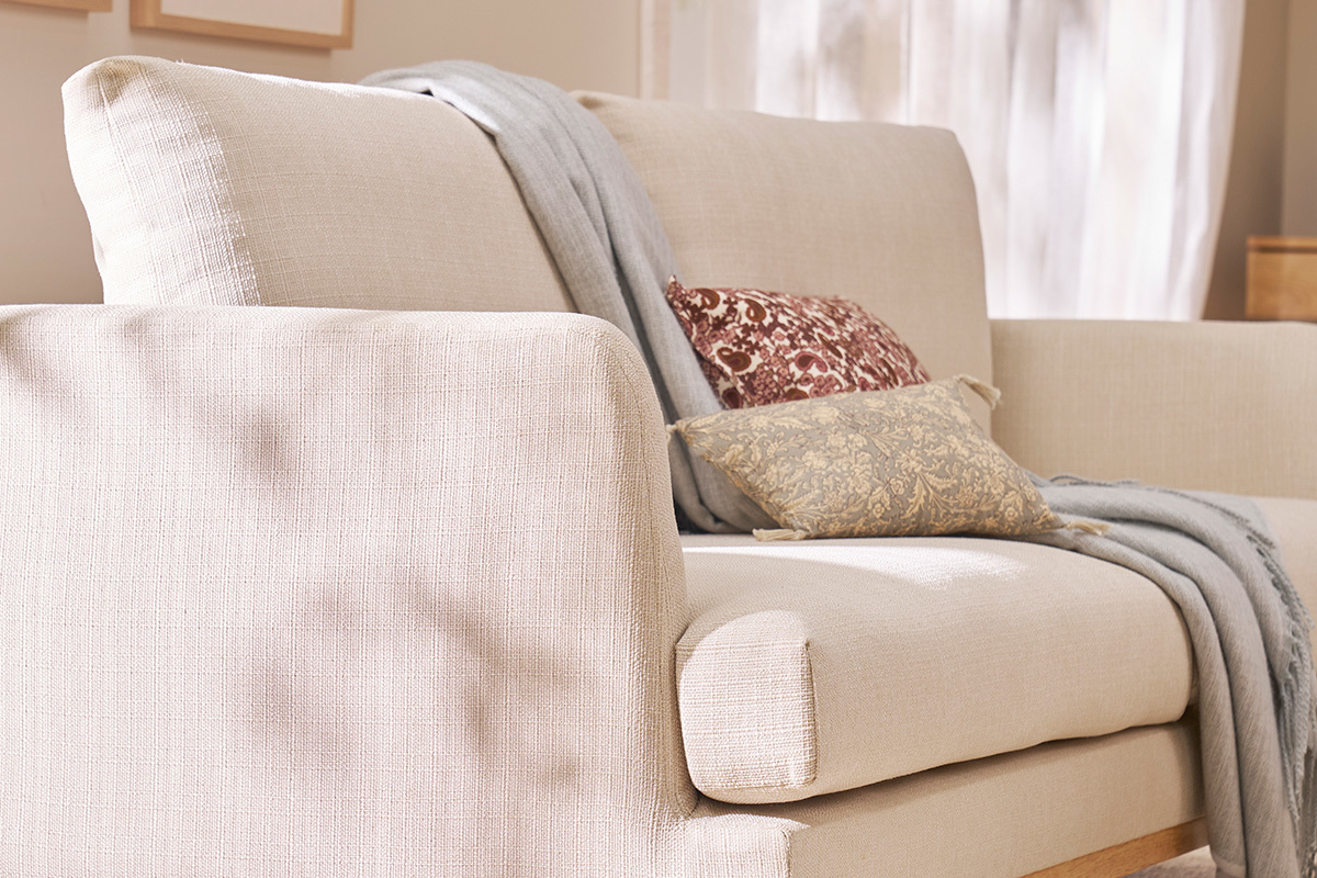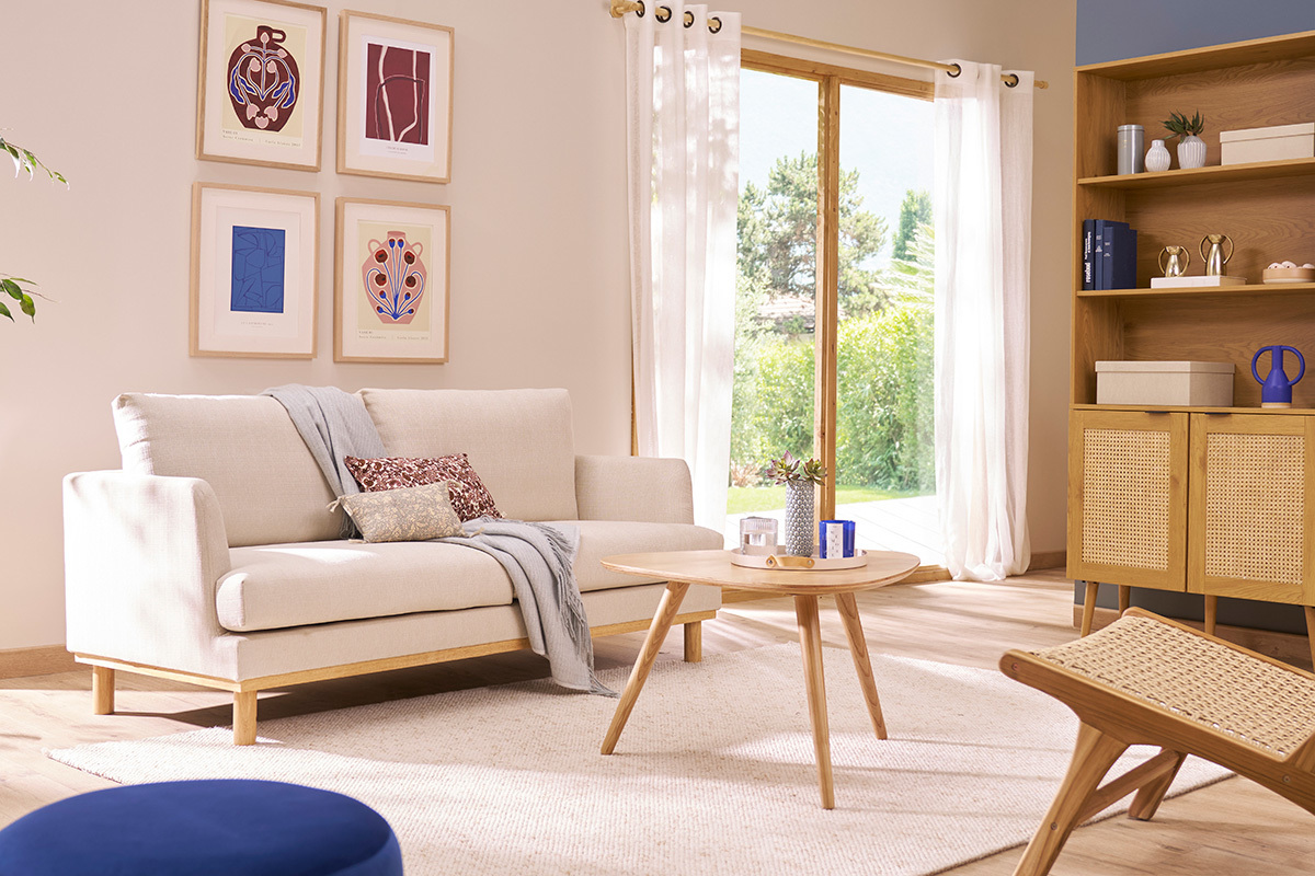 Ce canapé scandinave beige se marie à merveille à une jolie table basse en bois de notre collection.