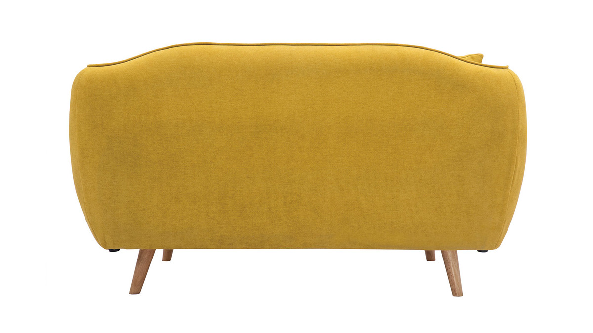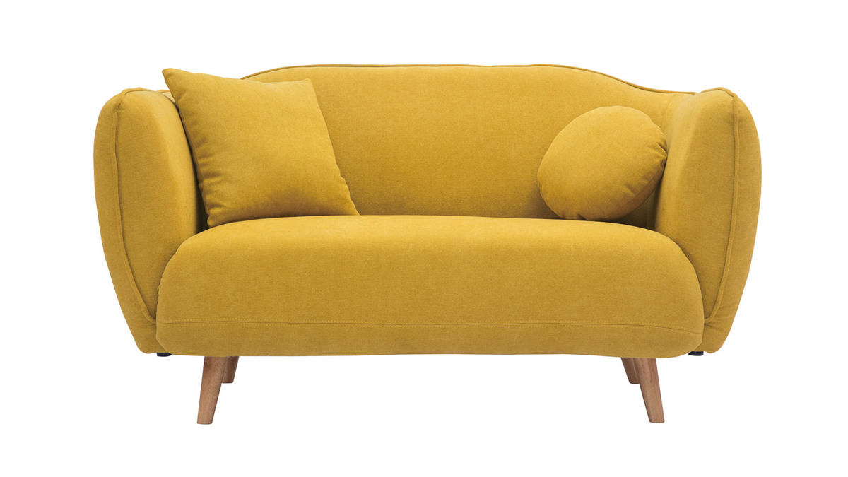 Ce canapé 2 places à l'esthétique organique transforme notre intérieur en un refuge douillet. Son assise ample (L100 x P53 cm), le moelleux de ses coussins et l'épaisseur de son rembourrage en mousse (densité 24 kg/m3) invitent à vivre une expérience de confort unique. On s'abandonne à la douceur de son revêtement, un tissu jaune moutarde effet velours lumineux et très doux au toucher (90% polyester et 10% acrylique).