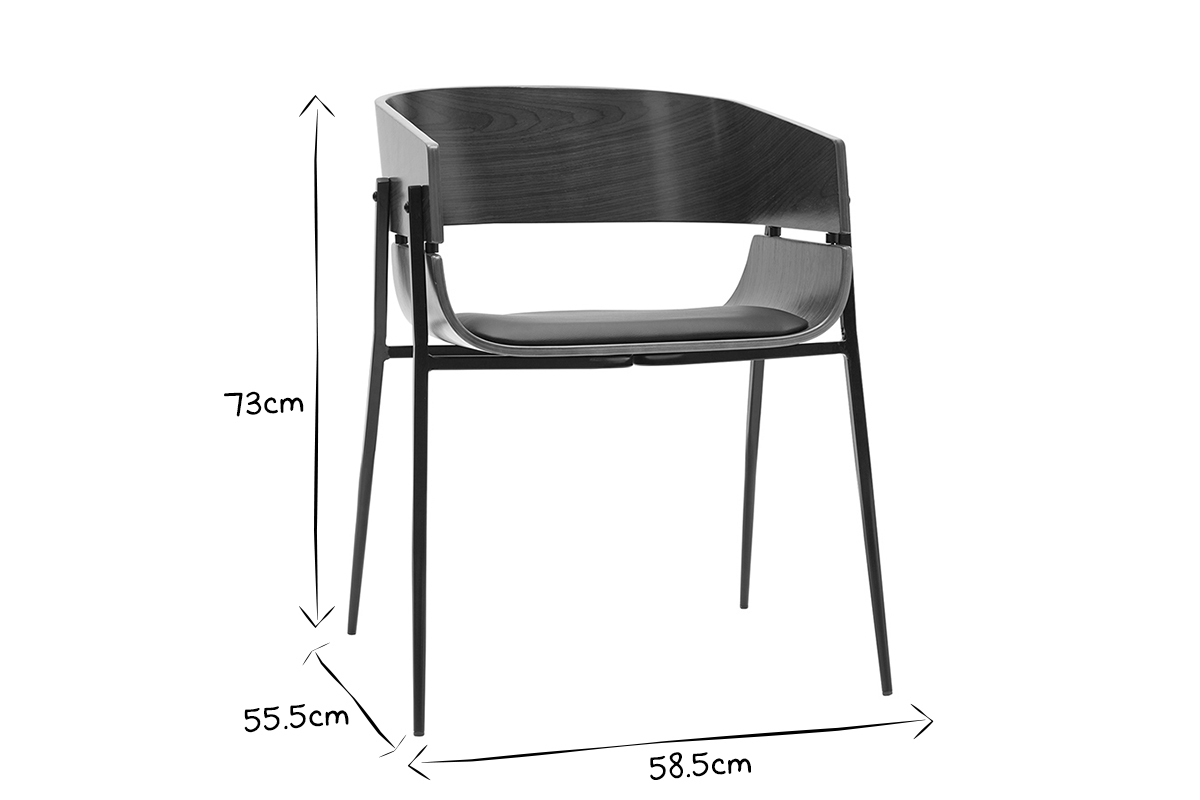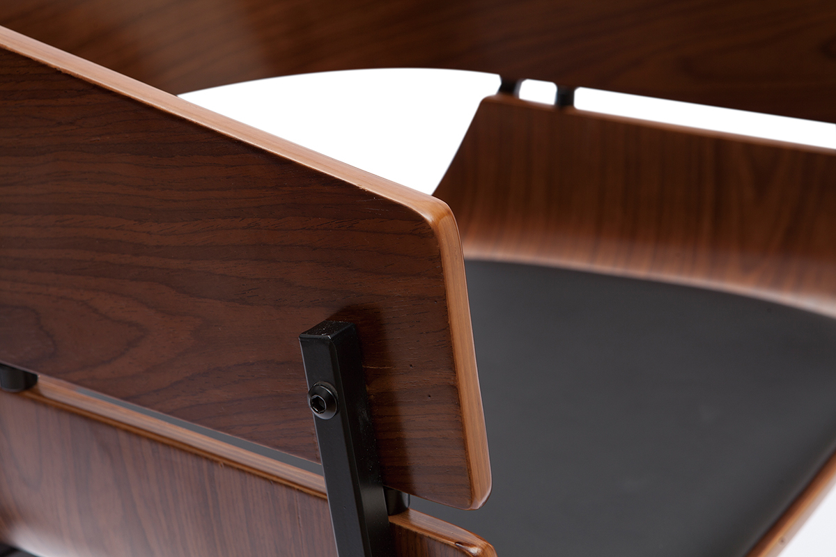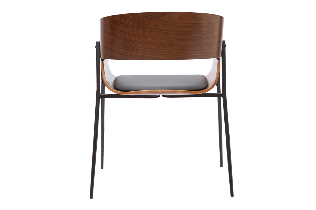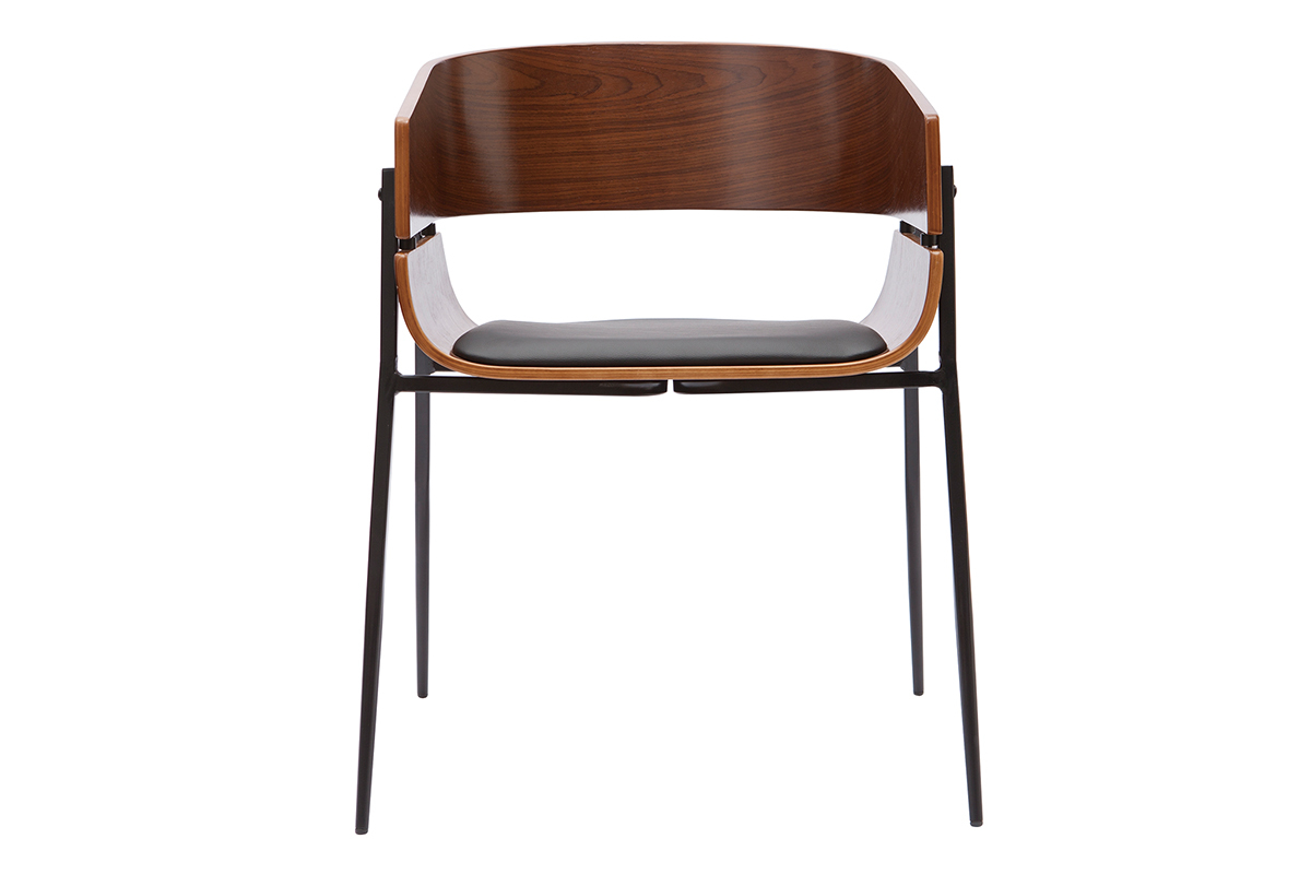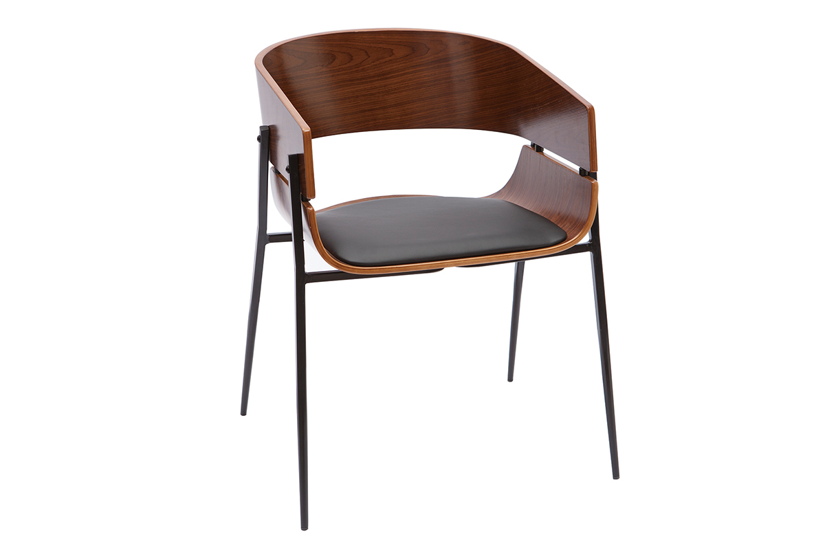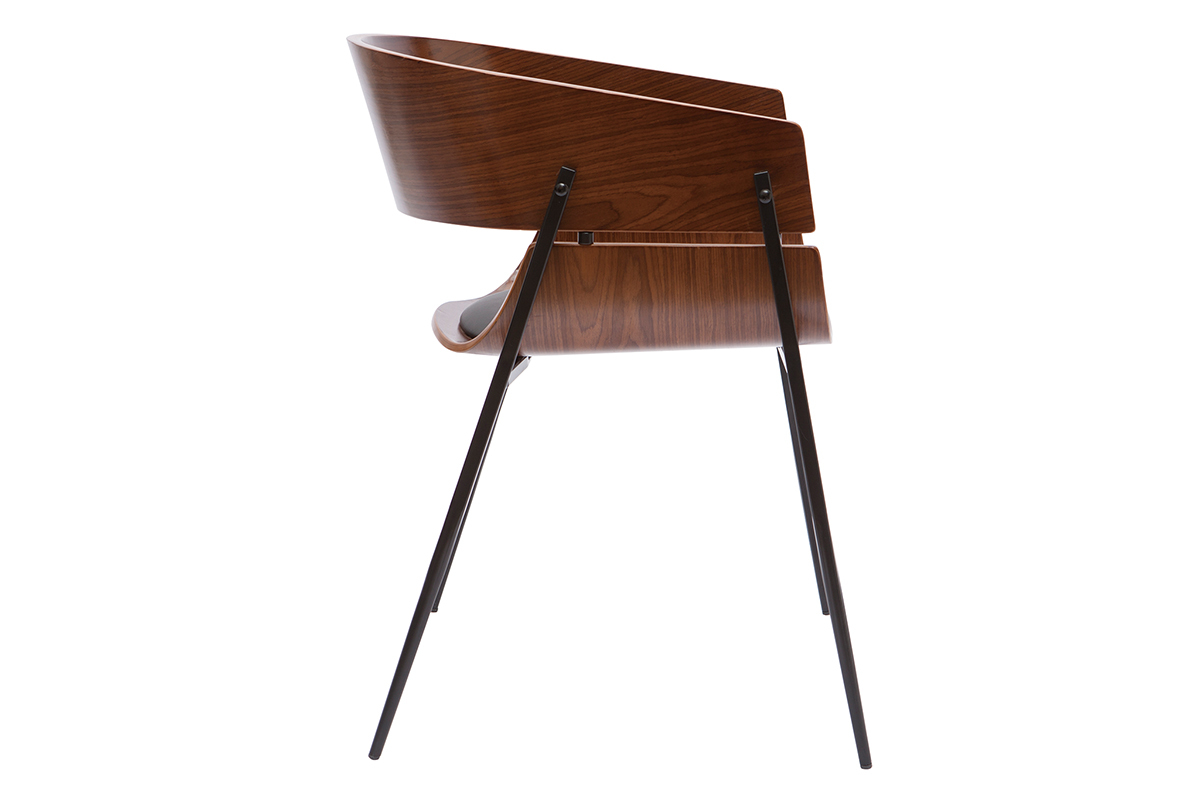 Le design de cette chaise en bois foncé et métal noir joue avec les styles, ce qui la rend unique. Un brin vintage avec son dossier arrondi en contreplaqué peuplier teinté bois foncé noyer, elle mêle également des influences contemporaines grâce à la finesse de son piètement en métal noir et de son mariage élégant avec une assise en polyuréthane noir. Ce joli contraste entre le bois courbé, le métal, et le polyuréthane en fait une chaise pleine de caractère. Audacieuse, cette chaise moderne à la touche rétro est une pièce forte qui ne passera pas inaperçue.