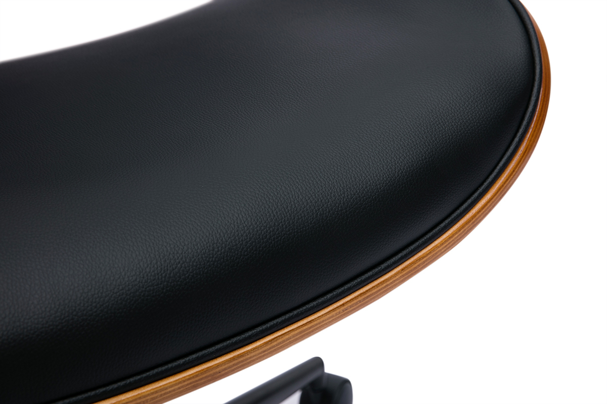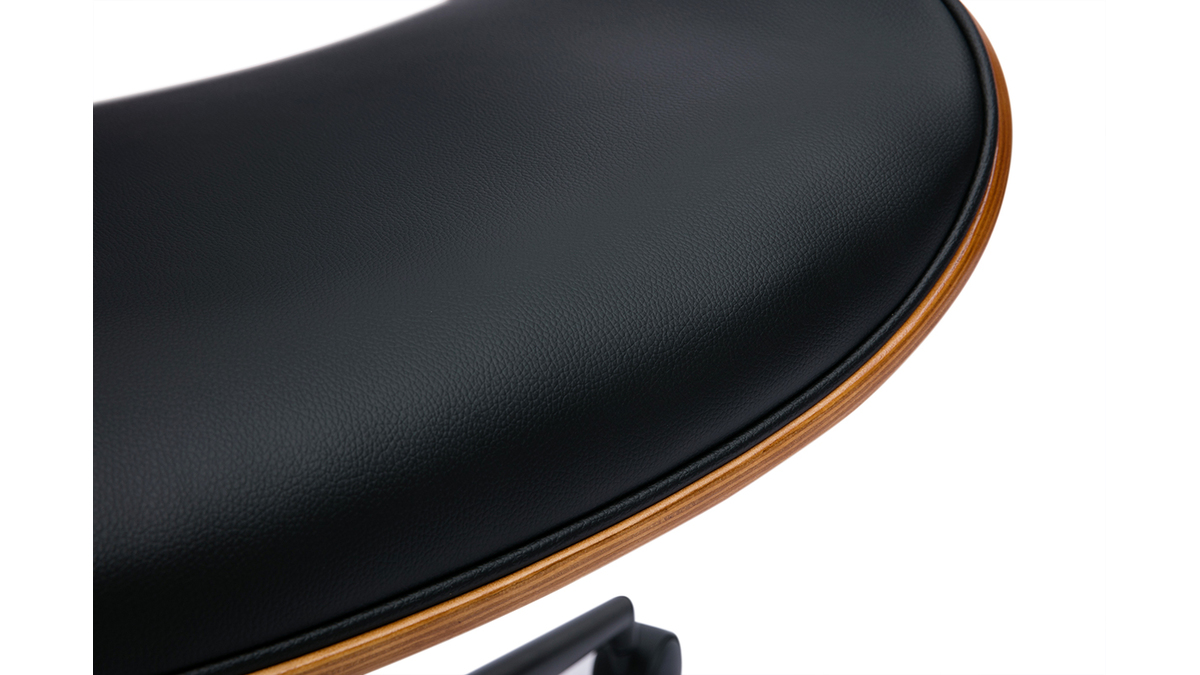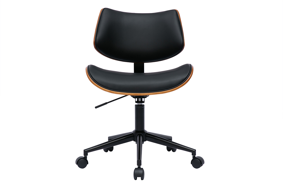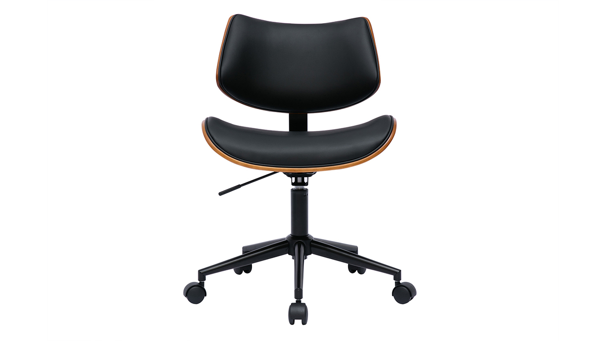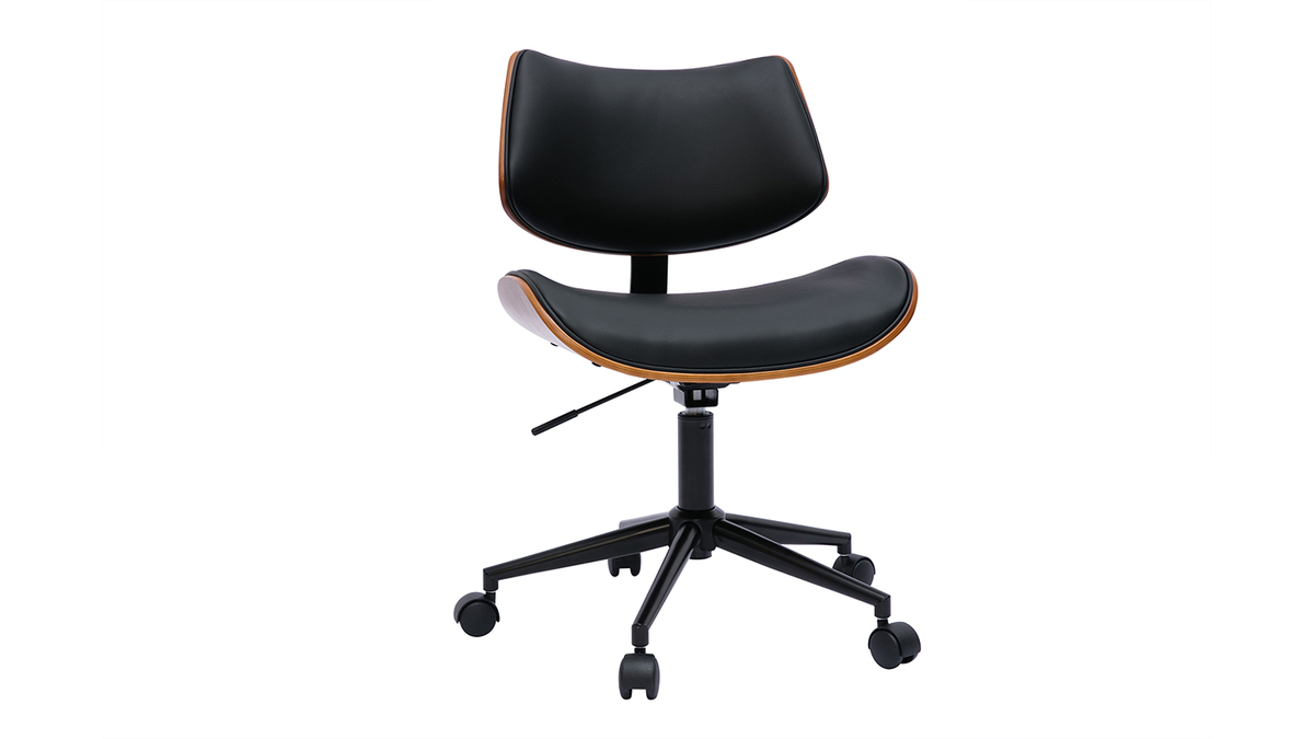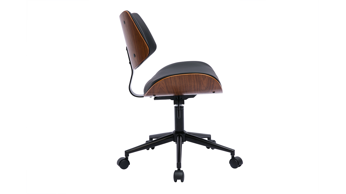 Pour un rendu d'inspiration vintage, ce fauteuil de bureau design associe pied en métal noir, tissu imitation cuir noir et contreplaqué noyer finition nitrocellulosique. Si le revêtement en polyuréthane et le piètement assortis offrent un look sobre et chic à la fois, la signature bois foncé charme par la note chaleureuse qu'elle confère à l'ensemble. Une combinaison idéale pour apporter un supplément d'âme aux intérieurs les plus tendances. Dans une pièce de vie dédiée à la productivité et placée sous le signe d'une déco industrielle ou rétro chic, cette chaise de bureau à roulettes noire et bois foncé tiendra indéniablement une place de choix !