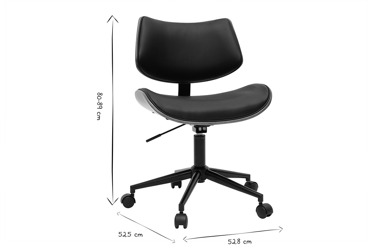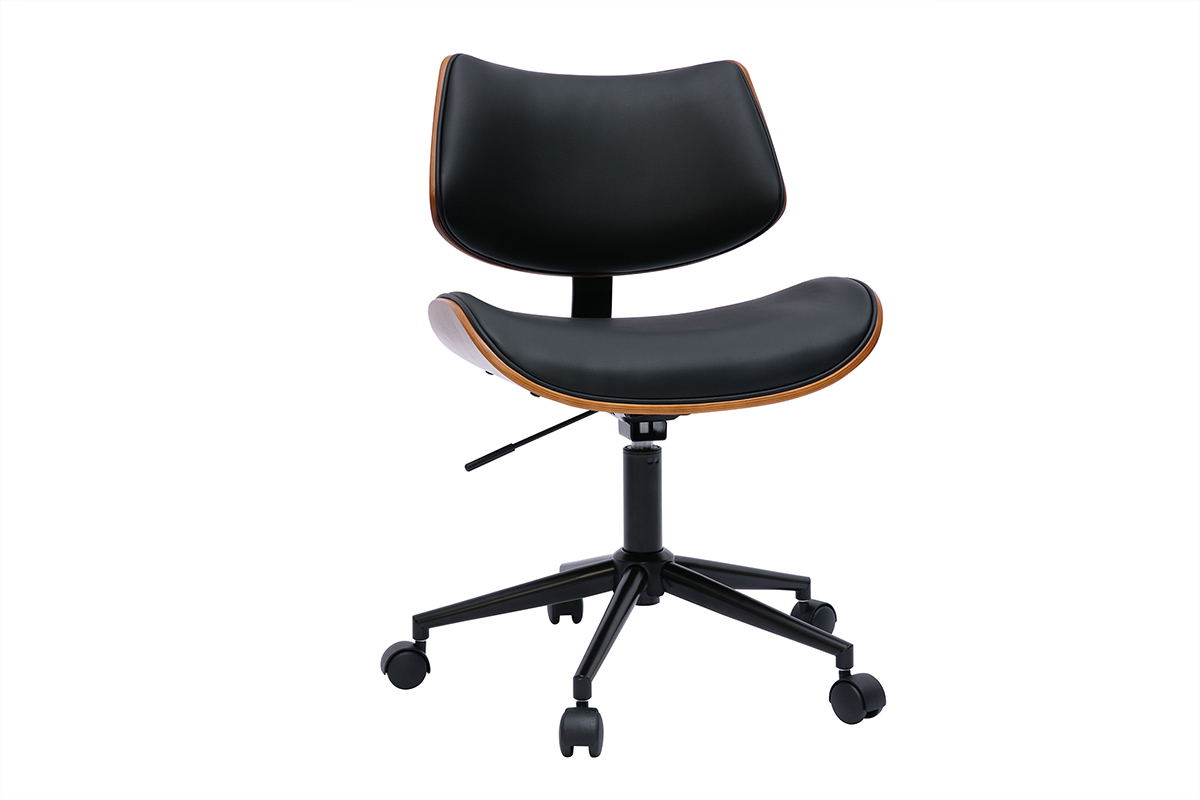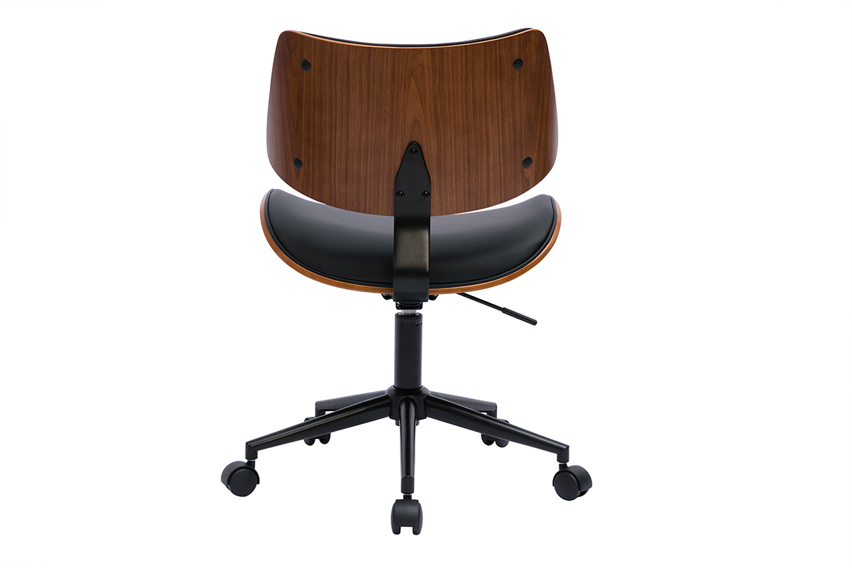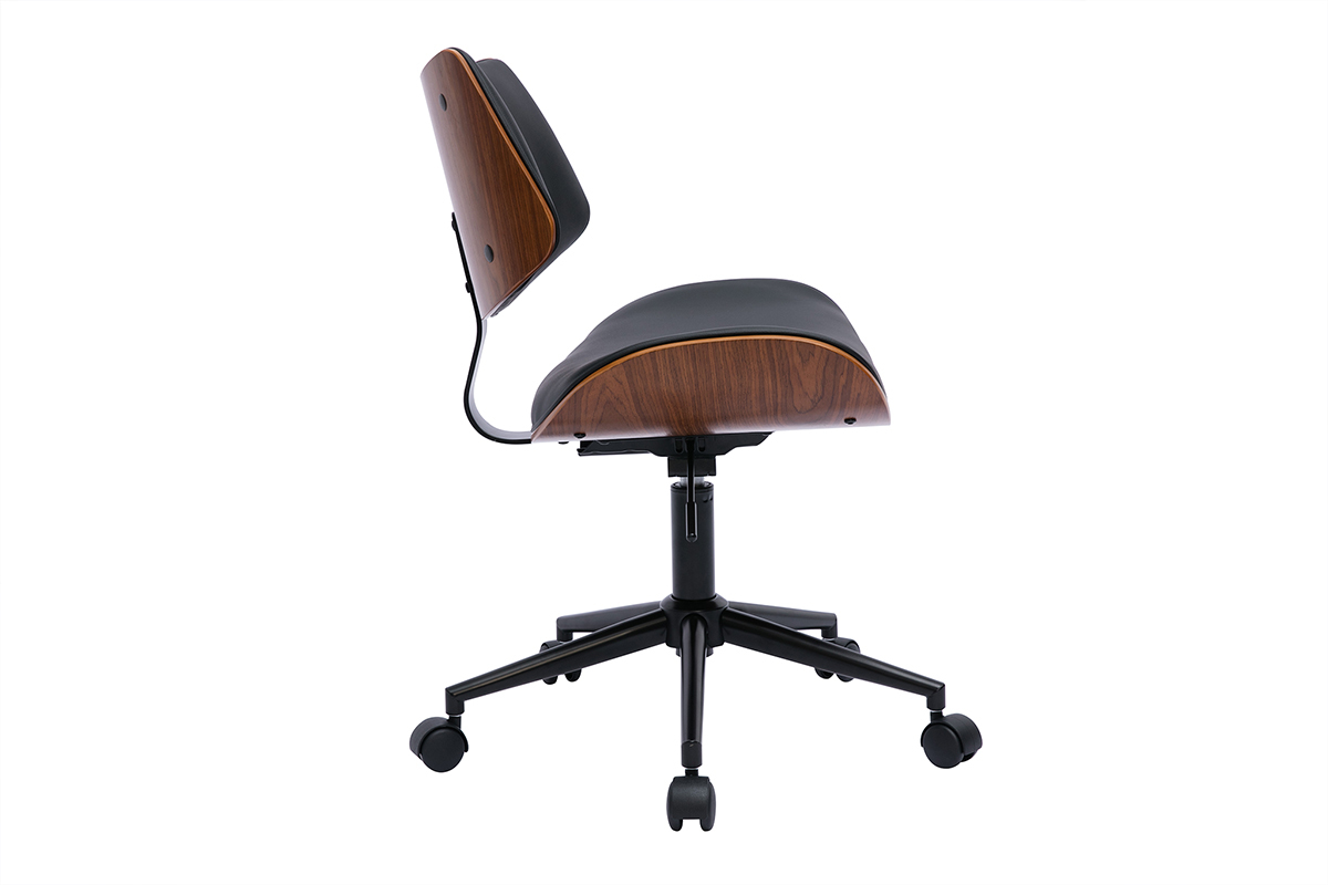 Chaise de bureau à roulettes design noir, bois foncé noyer et métal noir livrée prête à assembler. Montage simple, seul le piètement est à fixer.