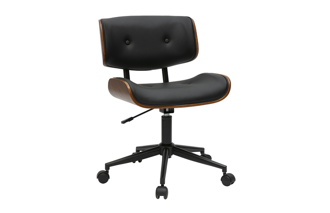 Un modèle qui conjugue esthétique rétro-moderne et performances ergonomiques. Son alliance de placage noyer chaleureux et de polyuréthane noir rappelle les célèbres fauteuils design des années 50 tout en répondant aux exigences des bureaux contemporains. Avec des dimensions compactes (L 58,5 cm × P 57 cm × H 76 à 85,5 cm), cette chaise à roulettes s’intègre facilement dans un coin télétravail, une chambre étudiante ou un open space créatif sans jamais surcharger la pièce.