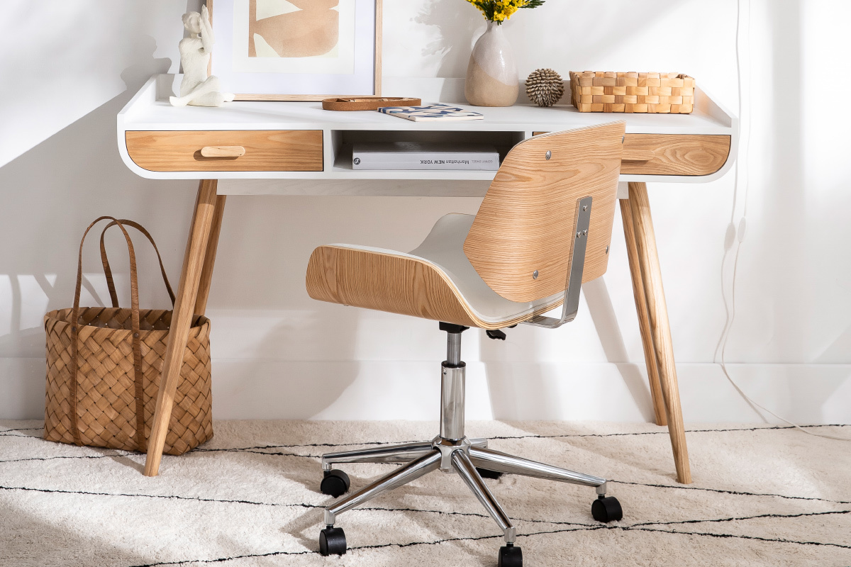 Mêlant bois clair et polyuréthane blanc, cette chaise bureau design arbore un joli jeu de texture et un look aussi moderne que cosy. Divinement dans l'air du temps grâce à ses tons sobres et ses lignes courbées, il s'agit d'un véritable élément déco qui habille de la plus belle manière l'espace de travail. Dans une chambre ou dans un séjour, elle est idéale pour se créer un espace où il fait bon travailler. Elle forme le parfait duo avec un bureau en bois.