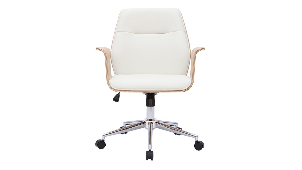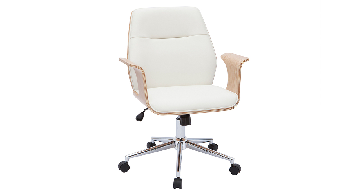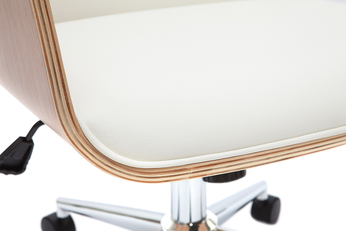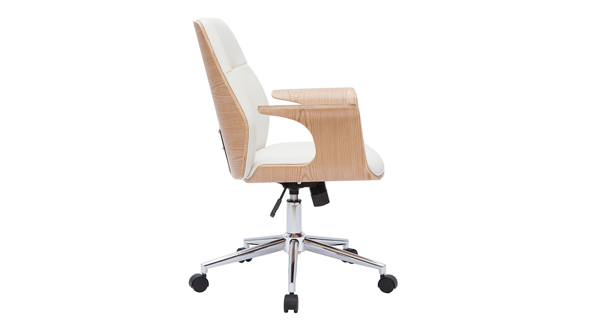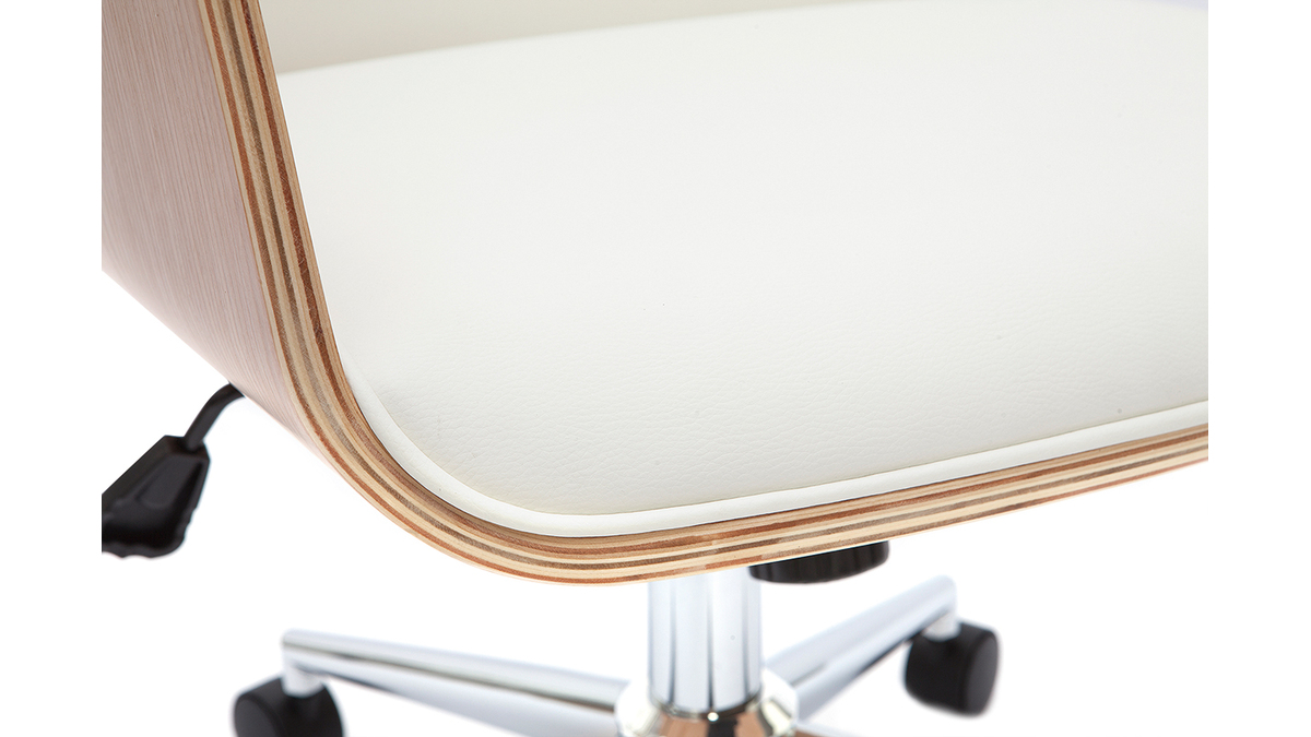 Cette chaise bureau design joue avec les textures pour offrir un look irrésistible. Si le polyuréthane blanc et le pied en métal chromé lui donnent une allure terriblement moderne, le bois clair réchauffe le tout. L'ensemble forme une jolie harmonie qui se fond à merveille dans tous les décors.