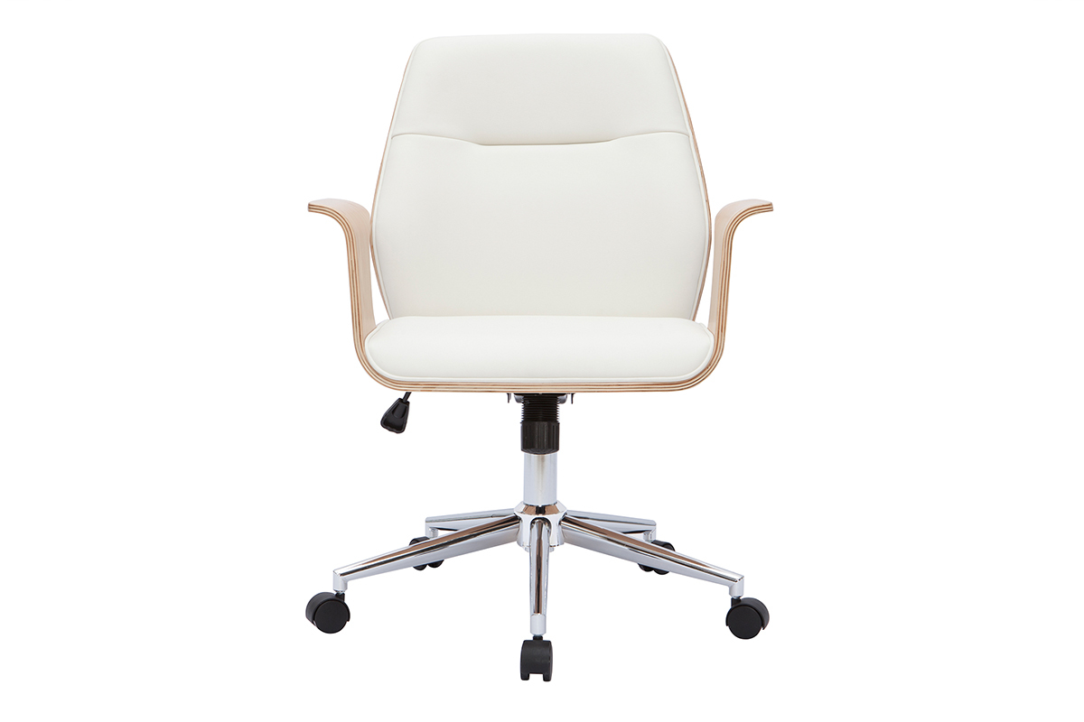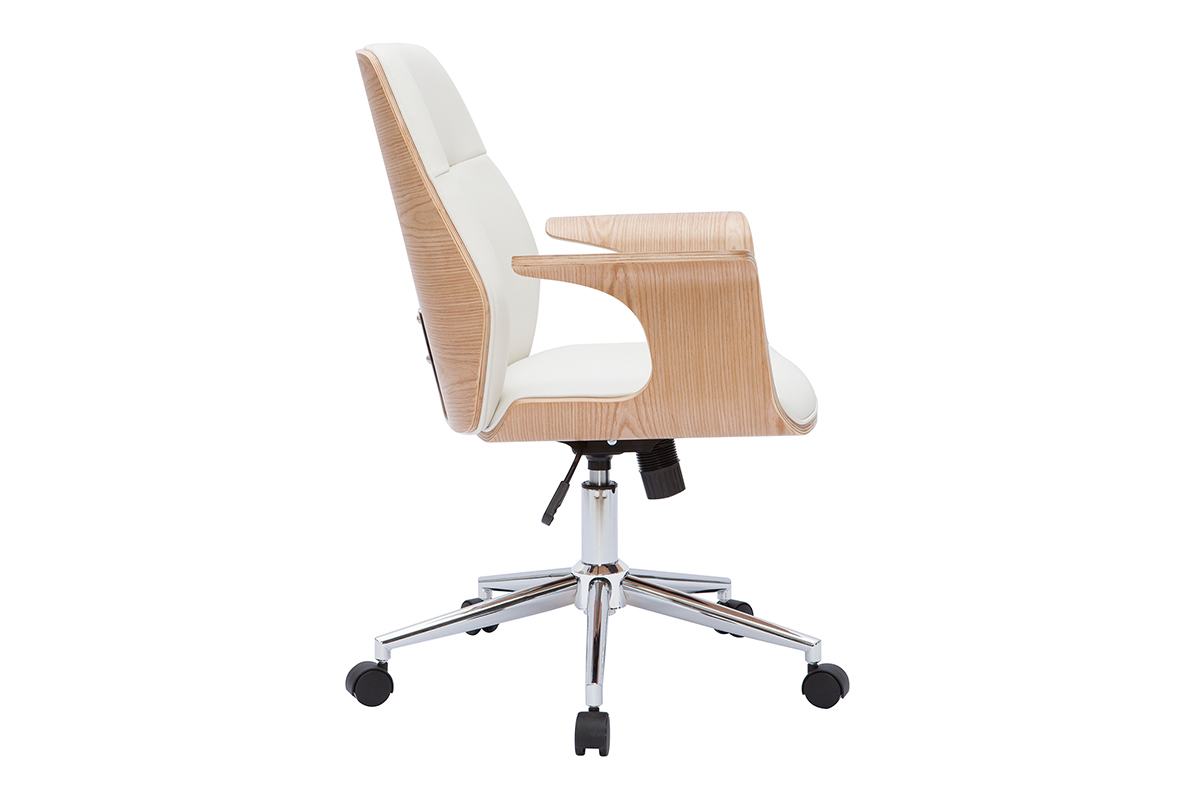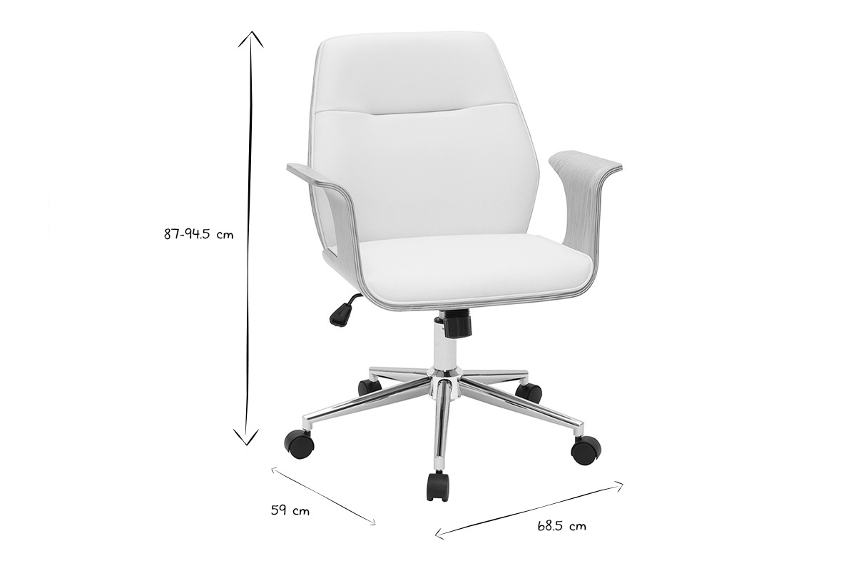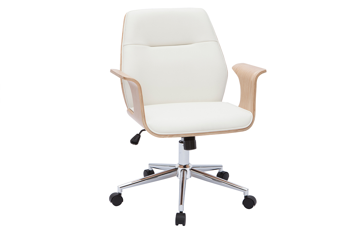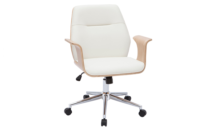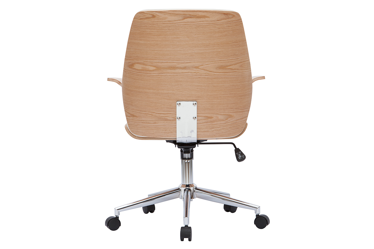 Cette chaise bureau design joue avec les textures pour offrir un look irrésistible. Si le polyuréthane blanc et le pied en métal chromé lui donnent une allure terriblement moderne, le bois clair réchauffe le tout. L'ensemble forme une jolie harmonie qui se fond à merveille dans tous les décors.