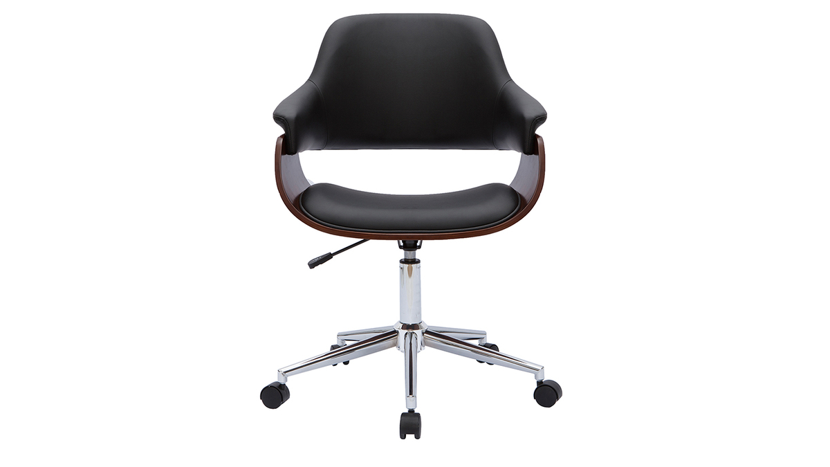 Chaise de bureau à roulettes design noir, bois foncé noyer et acier chromé HANSEN livrée prête à assembler.
