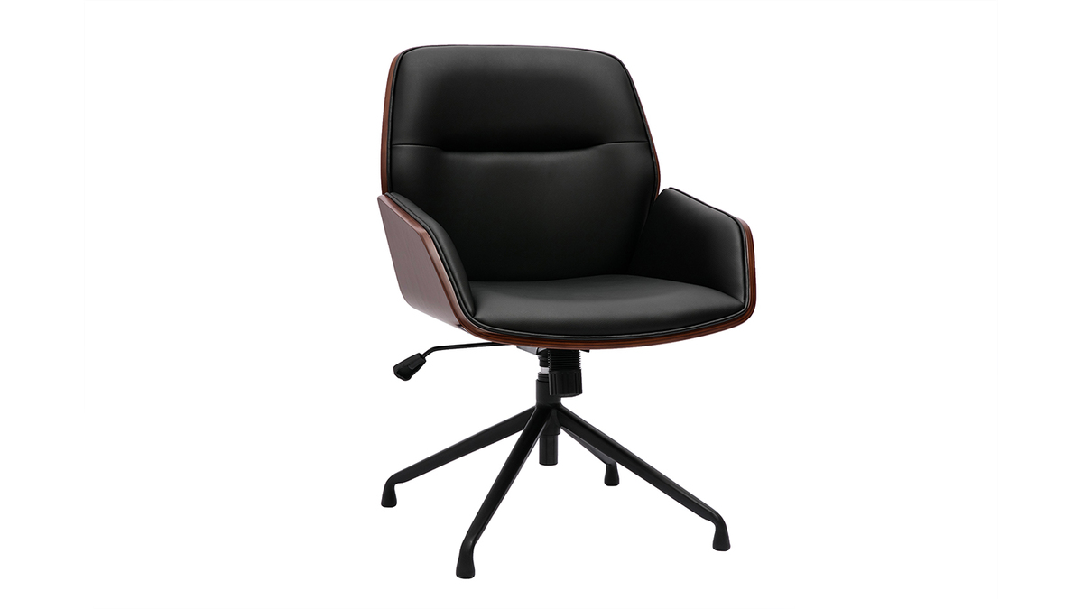 Alliant bois foncé et polyuréthane noir, cette chaise de bureau moderne joue subtilement avec les matières pour un rendu visuellement harmonieux. Ses tons épurés et ses lignes élégantes en font une pièce résolument design.