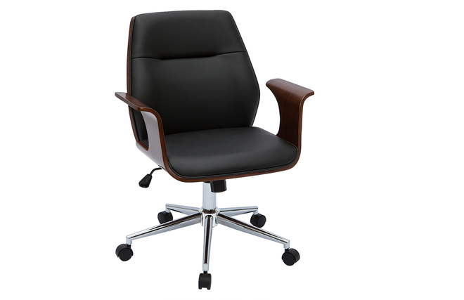 Cette chaise bureau design joue avec les textures pour offrir un look irrésistible. Si le polyuréthane noir et le pied en métal chromé lui donnent une allure terriblement moderne, le bois foncé réchauffe le tout. L'ensemble forme une jolie harmonie qui se fond à merveille dans tous les décors.