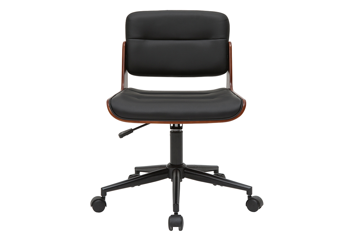 Chaise de bureau noire avec roulettes et structure noyer, vue de face.