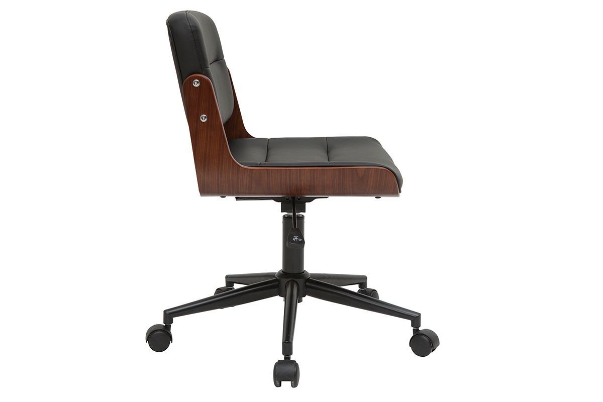 Chaise de bureau noire en bois foncé avec roulettes, vue de côté.