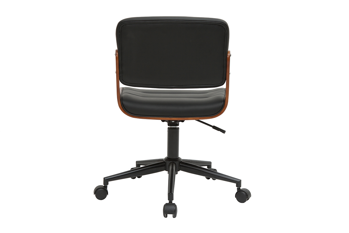 Chaise de bureau noir, dos en bois foncé, roulettes noires, vue de dos.