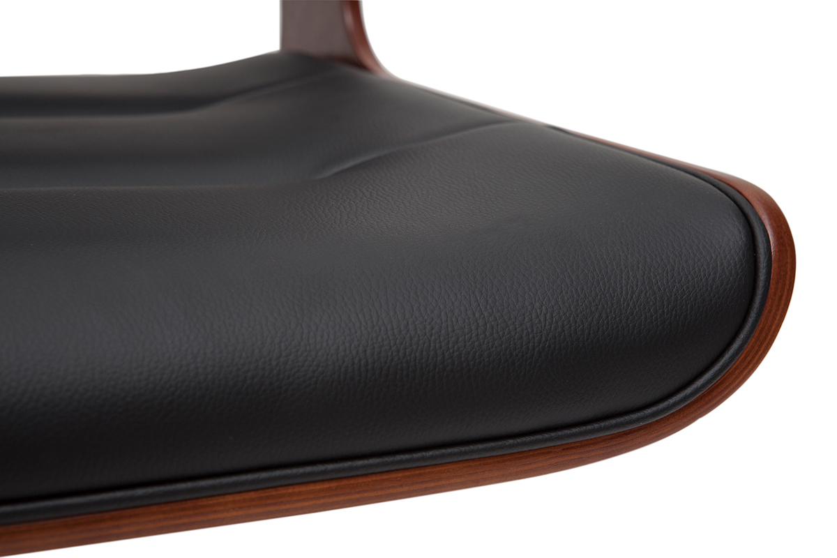 Gros plan sur l'assise en polyuréthane noir et bois noyer de la chaise de bureau ARAMON.