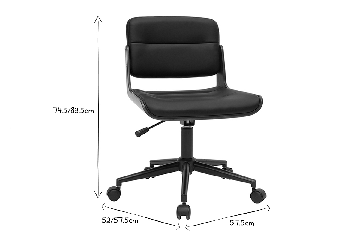 Chaise de bureau en noir et blanc avec dimensions indiquées, vue de face.