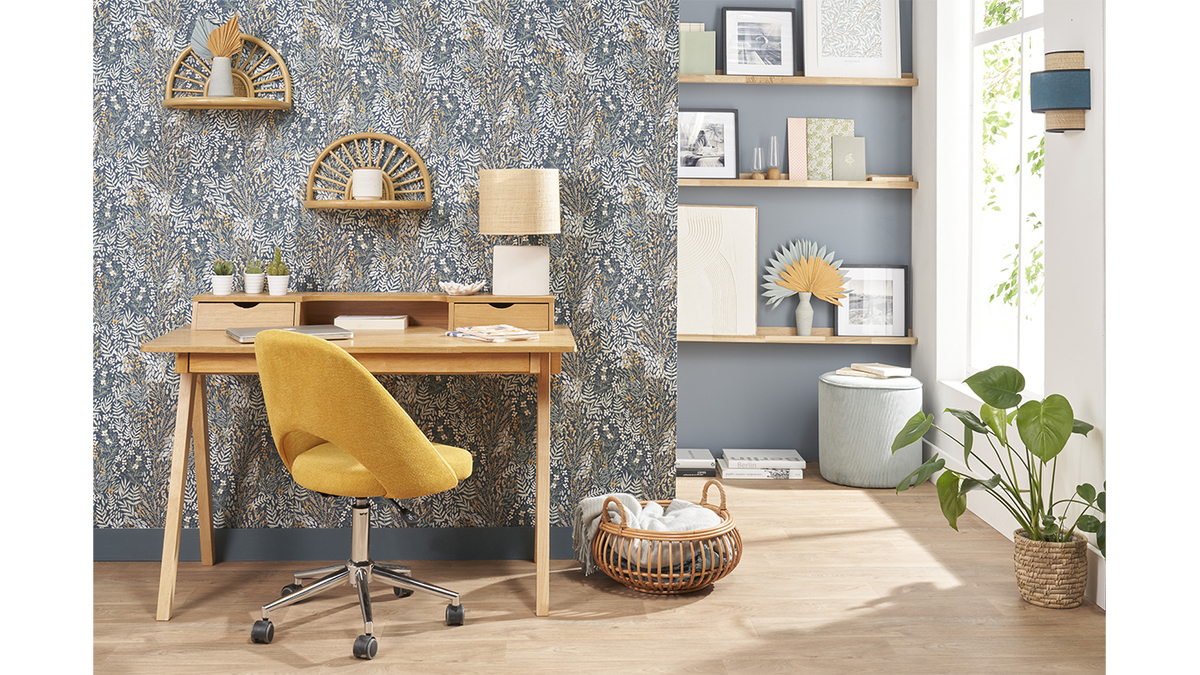 Aménagez un espace de travail résolument fifties en associant la chaise de bureau en tissu COSETTE à un bureau en bois au look rétro comme notre modèle OPUS.