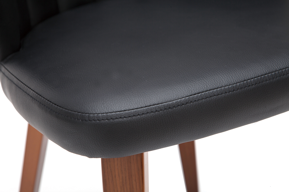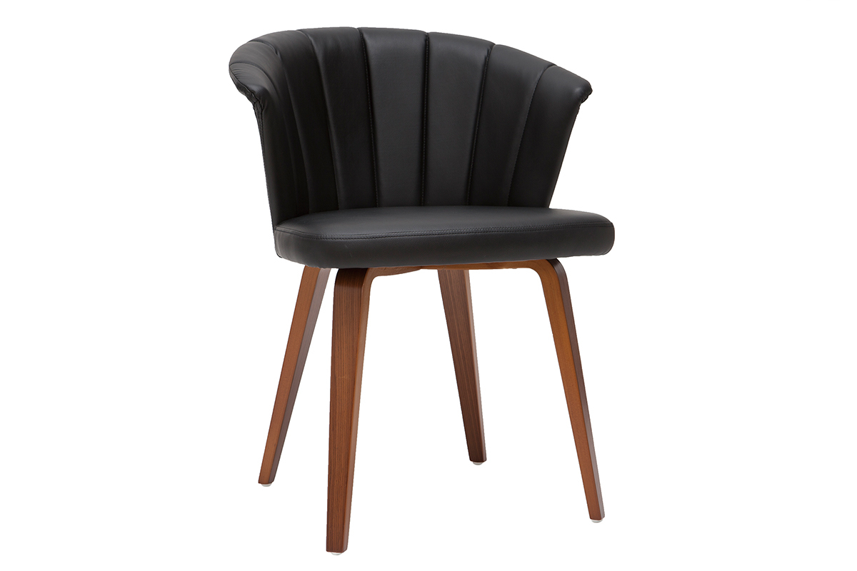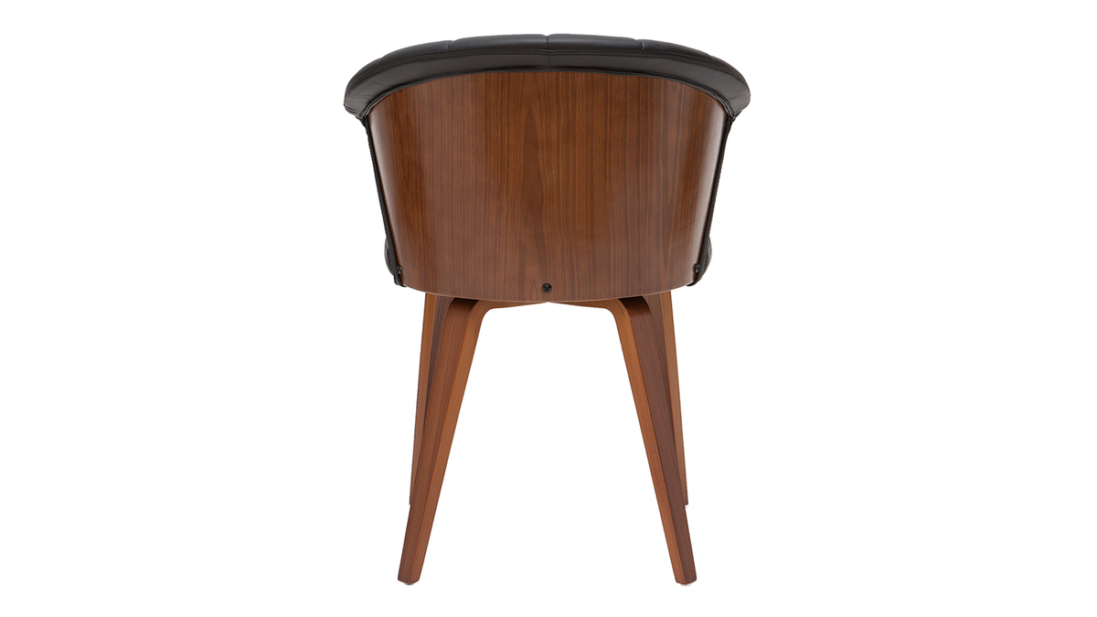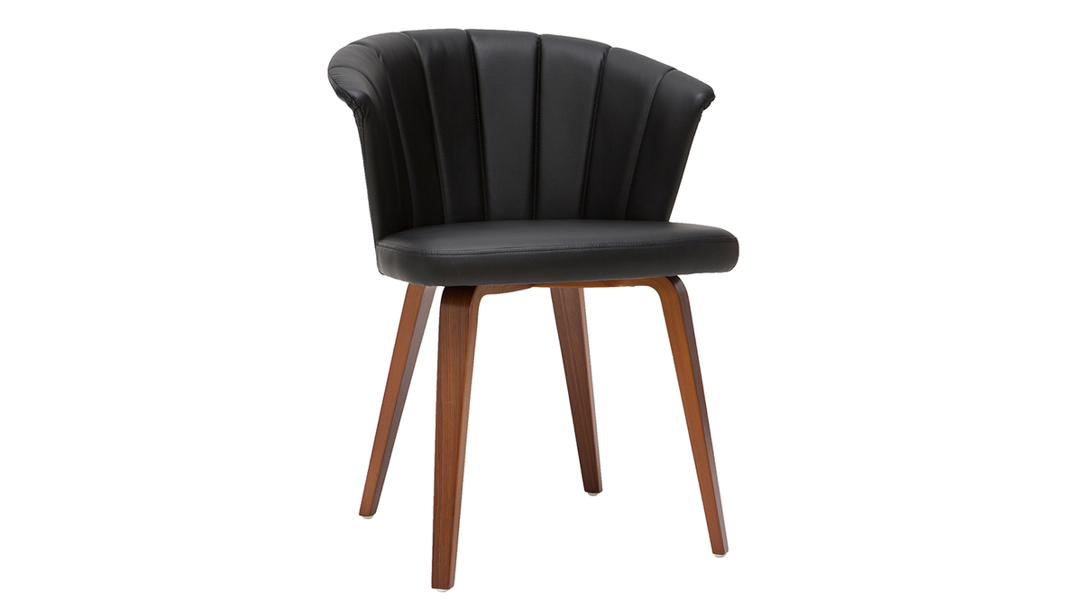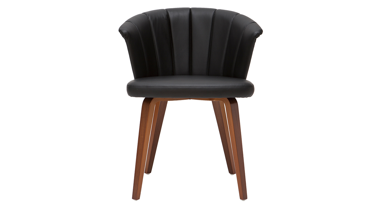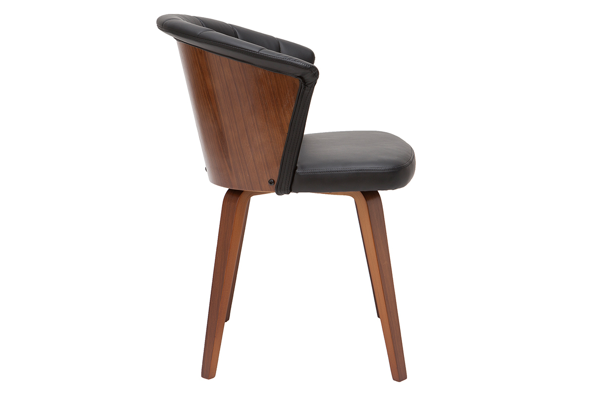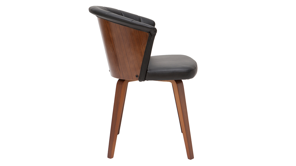 Avec son dossier travaillé tout en courbes et son joli jeu de surpiqûres, cette chaise noire et bois foncé est issue d'un beau travail sur la matière. La structure en contreplaqué courbé dessine des lignes fluides et dynamiques. L'élégant placage noyer laisse entrevoir les veines et les nuances uniques de cette essence de bois si particulière. L'assise a quant-à-elle été travaillée avec un revêtement capitonné noir à la fois doux au toucher et facile d'entretien.