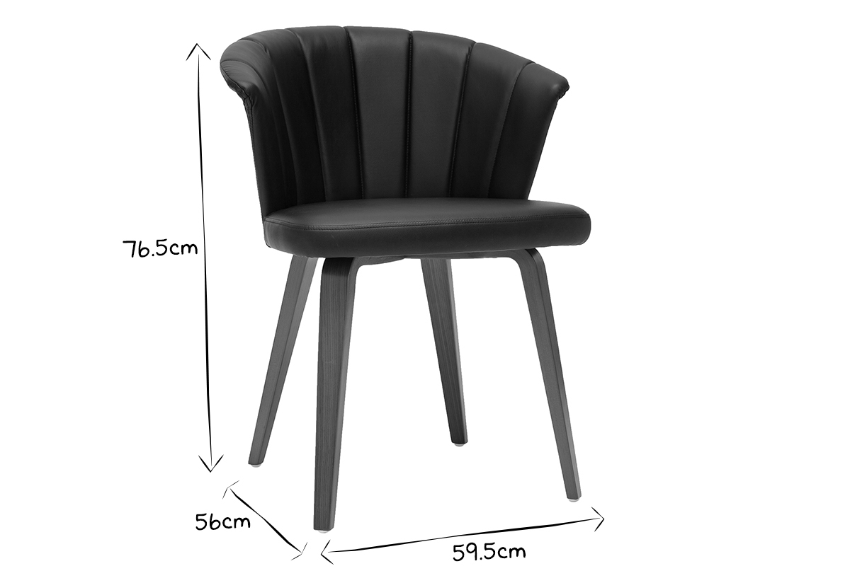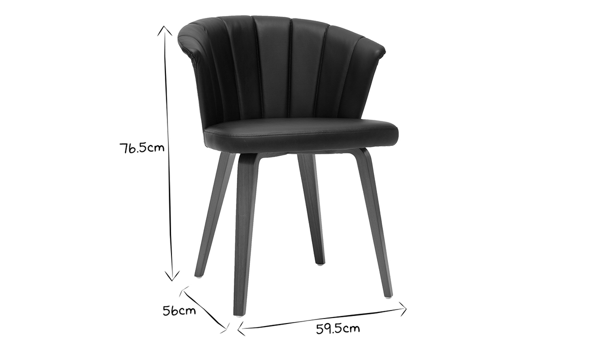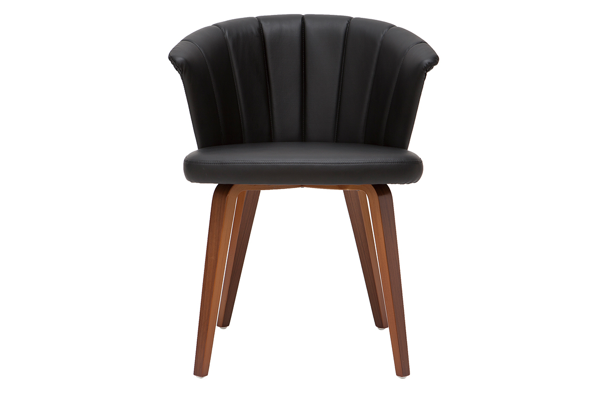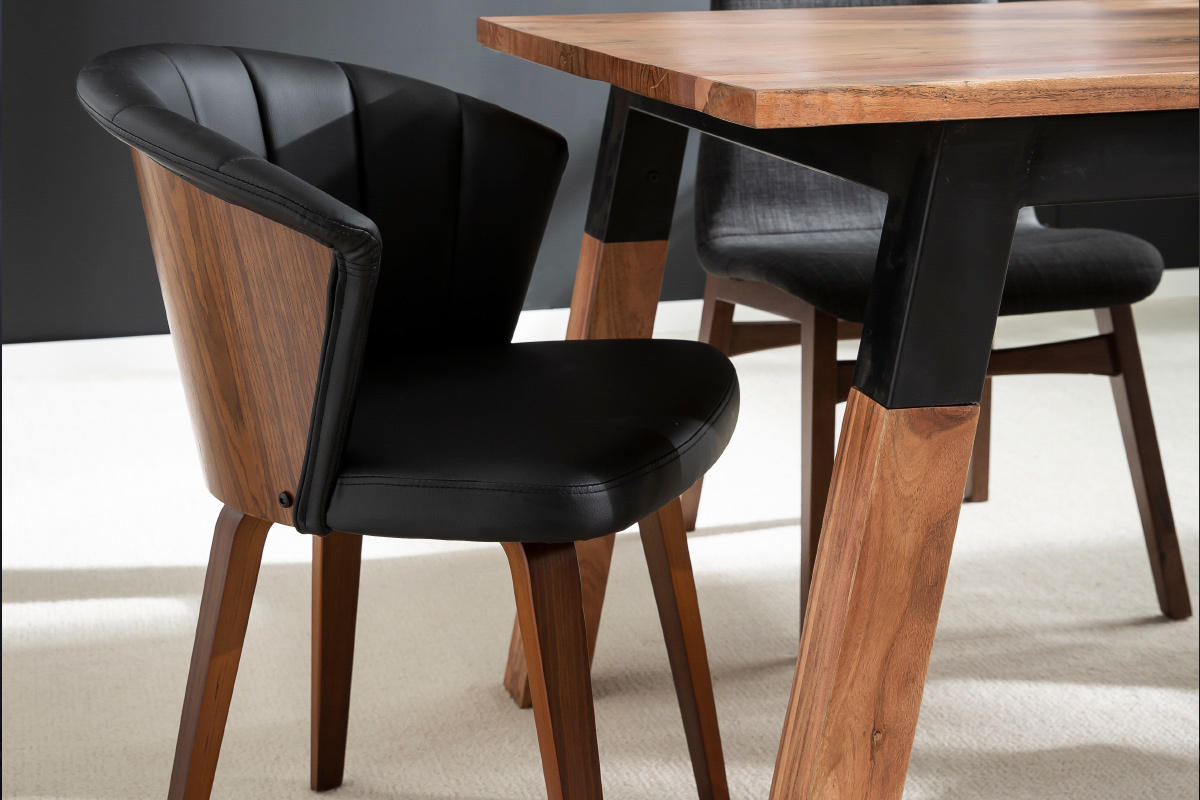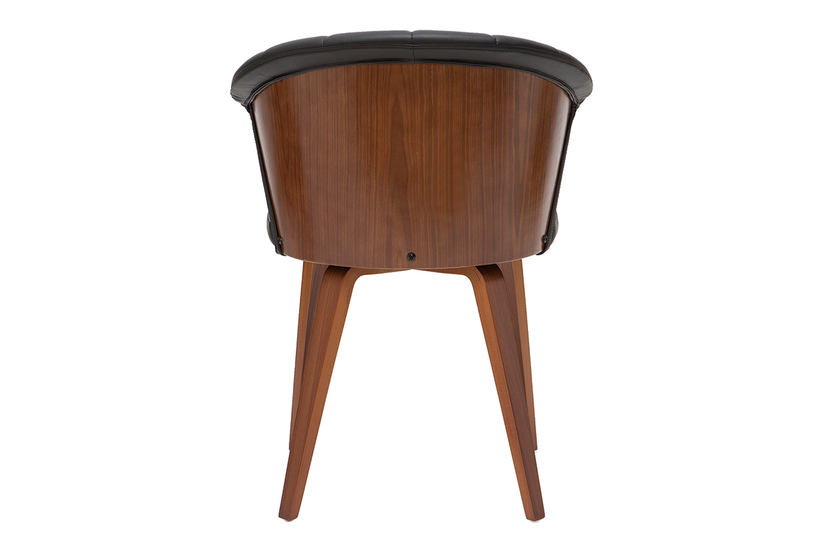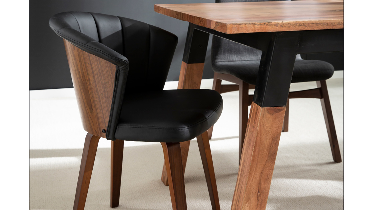 Avec son dossier travaillé tout en courbes et son joli jeu de surpiqûres, cette chaise noire et bois foncé est issue d'un beau travail sur la matière. La structure en contreplaqué courbé dessine des lignes fluides et dynamiques. L'élégant placage noyer laisse entrevoir les veines et les nuances uniques de cette essence de bois si particulière. L'assise a quant-à-elle été travaillée avec un revêtement capitonné noir à la fois doux au toucher et facile d'entretien.